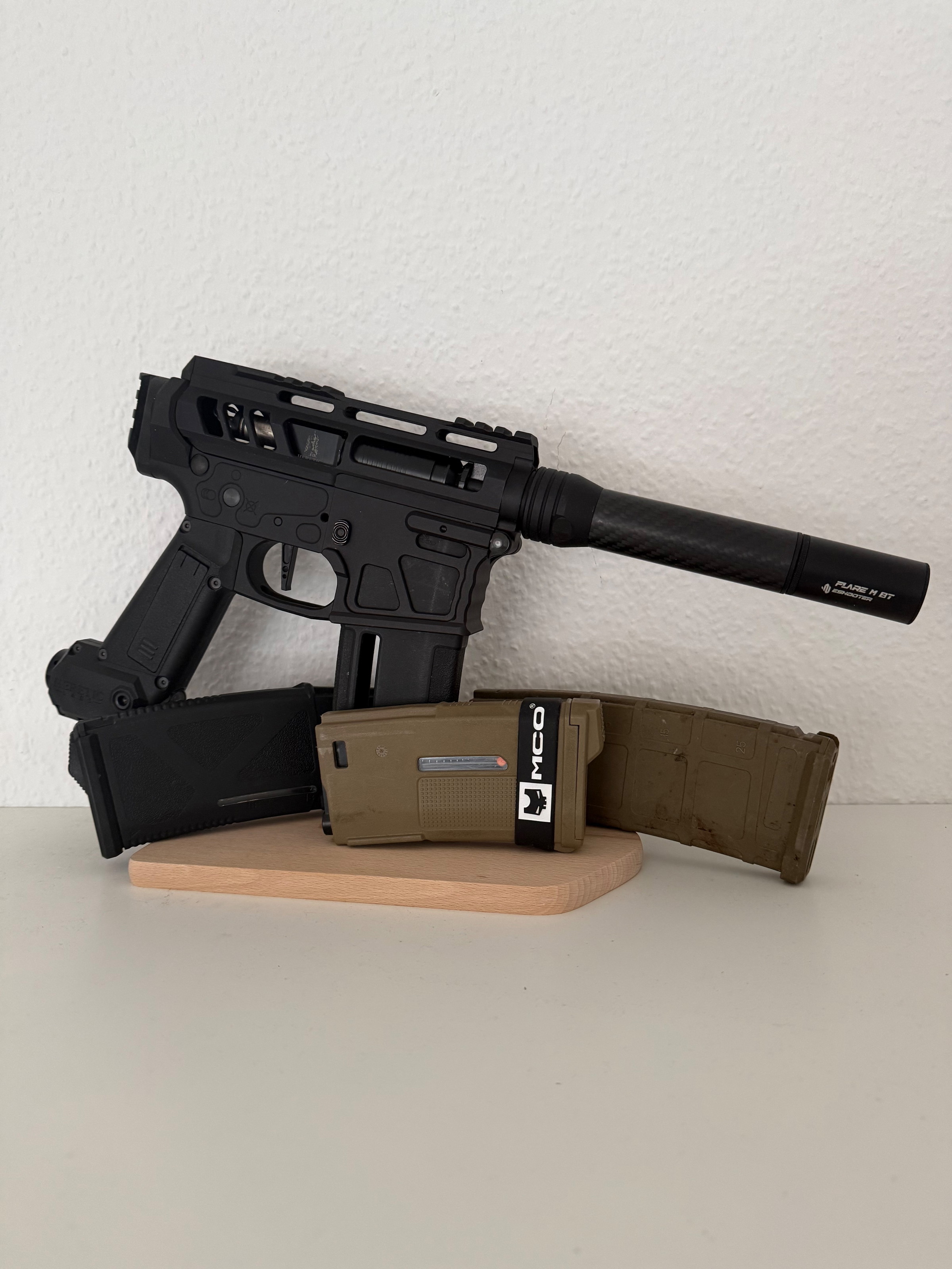 Hallo verkaufe hier meine einmal genutzte Heretic lab der Original Griff ist auch noch vorhanden und ich lege dazu 4 Magazine, 2 Akkus und ein Ladegerät dazu.