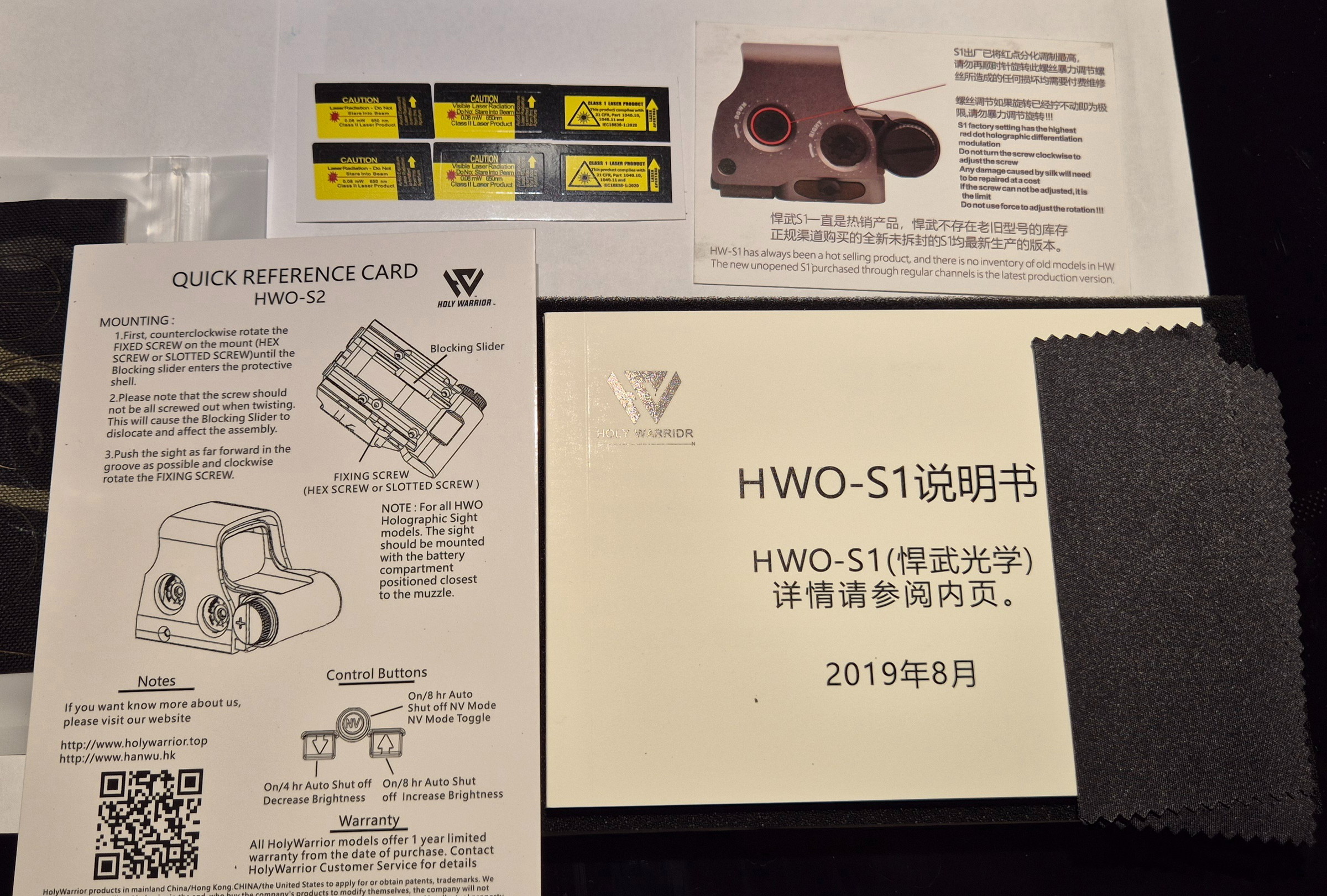 Mit dabei sind ein Visierschutz, Aufkleber in Multicam Black, Bedienungsanleitungen, Tuch und Laser-Hinweis-Aufkleber.