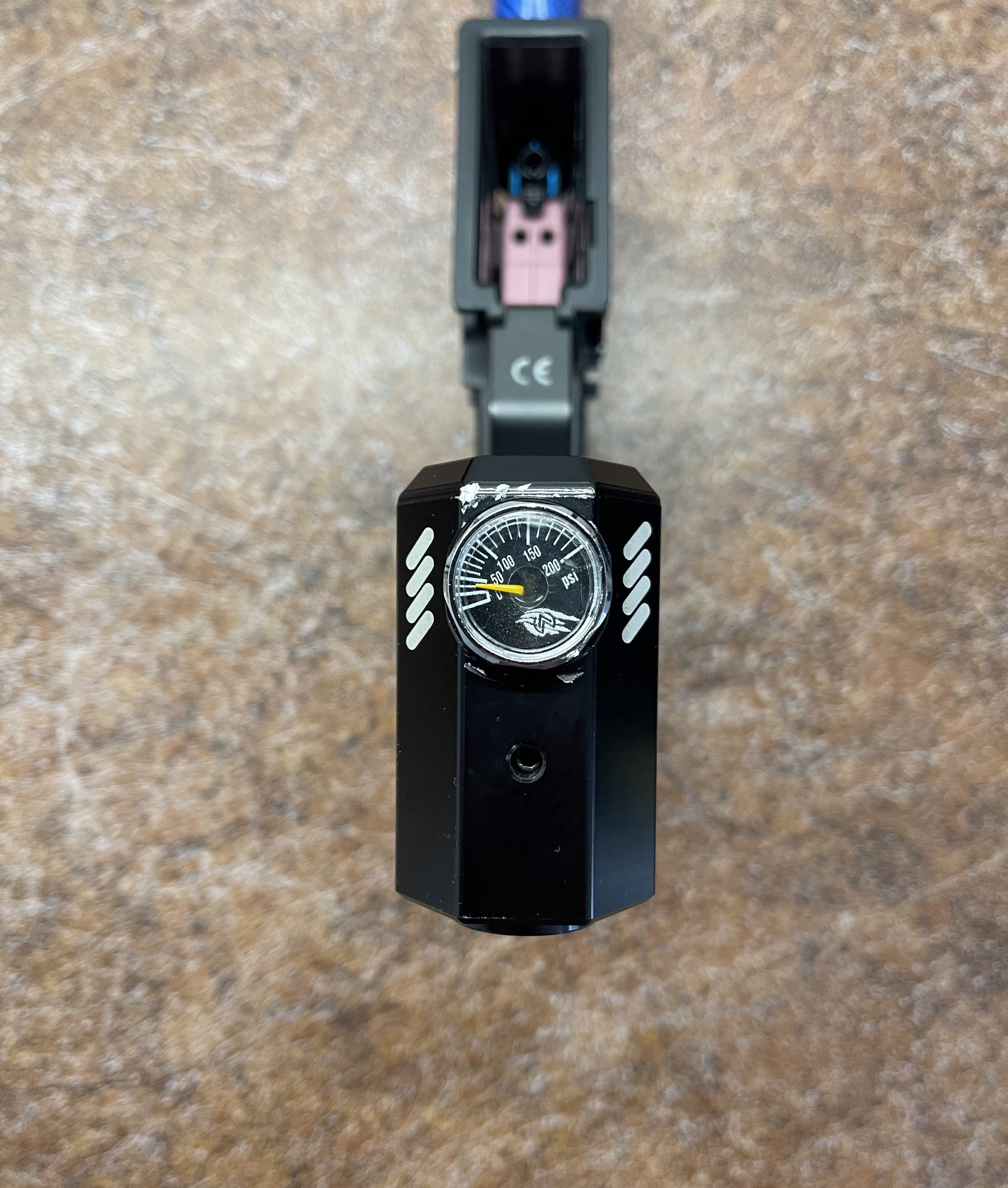 The only cosmetic flaw is a lightly scratched grip on the bottom side. The paint was scratched during regulator gauge installation, see photos.