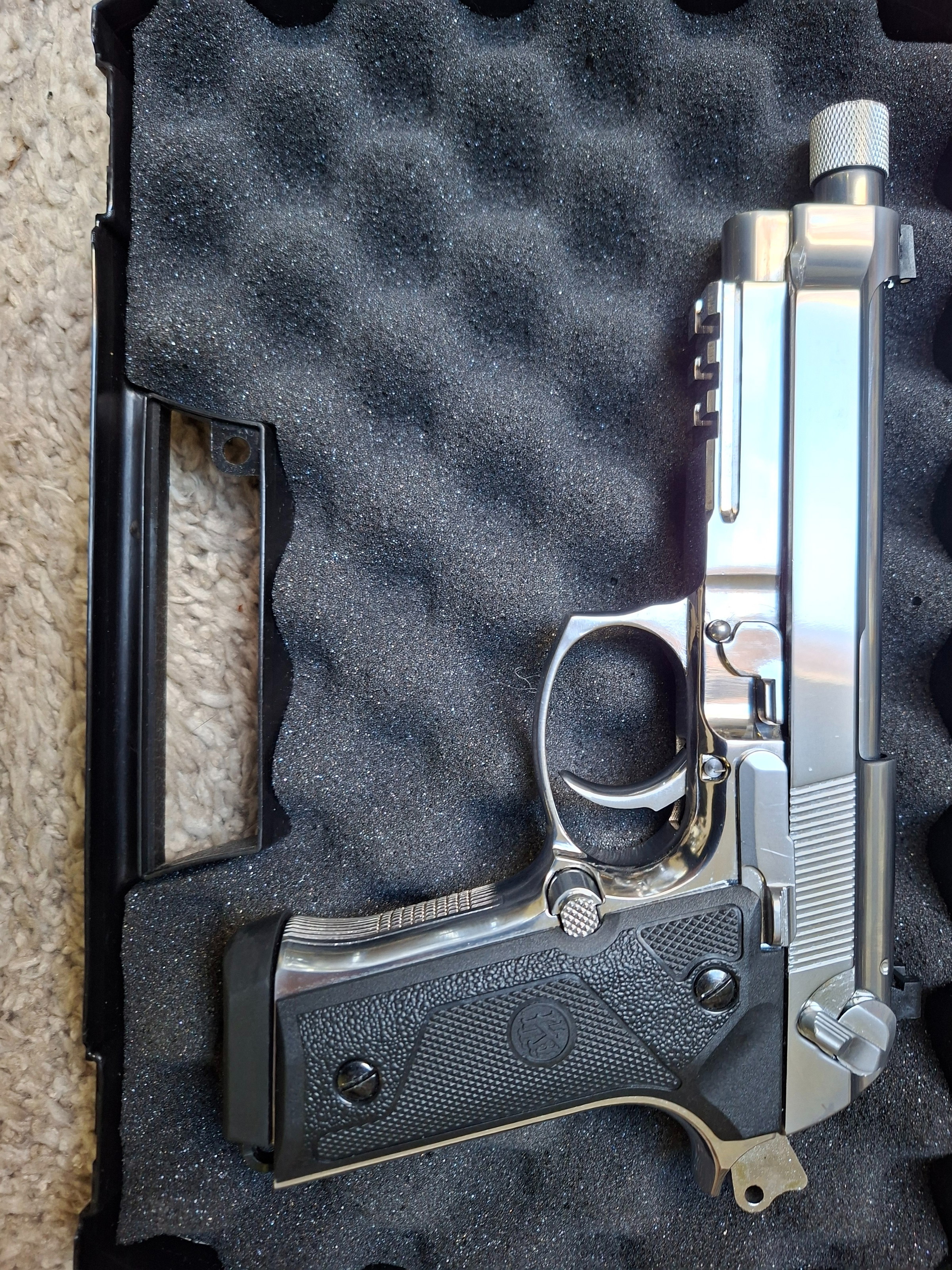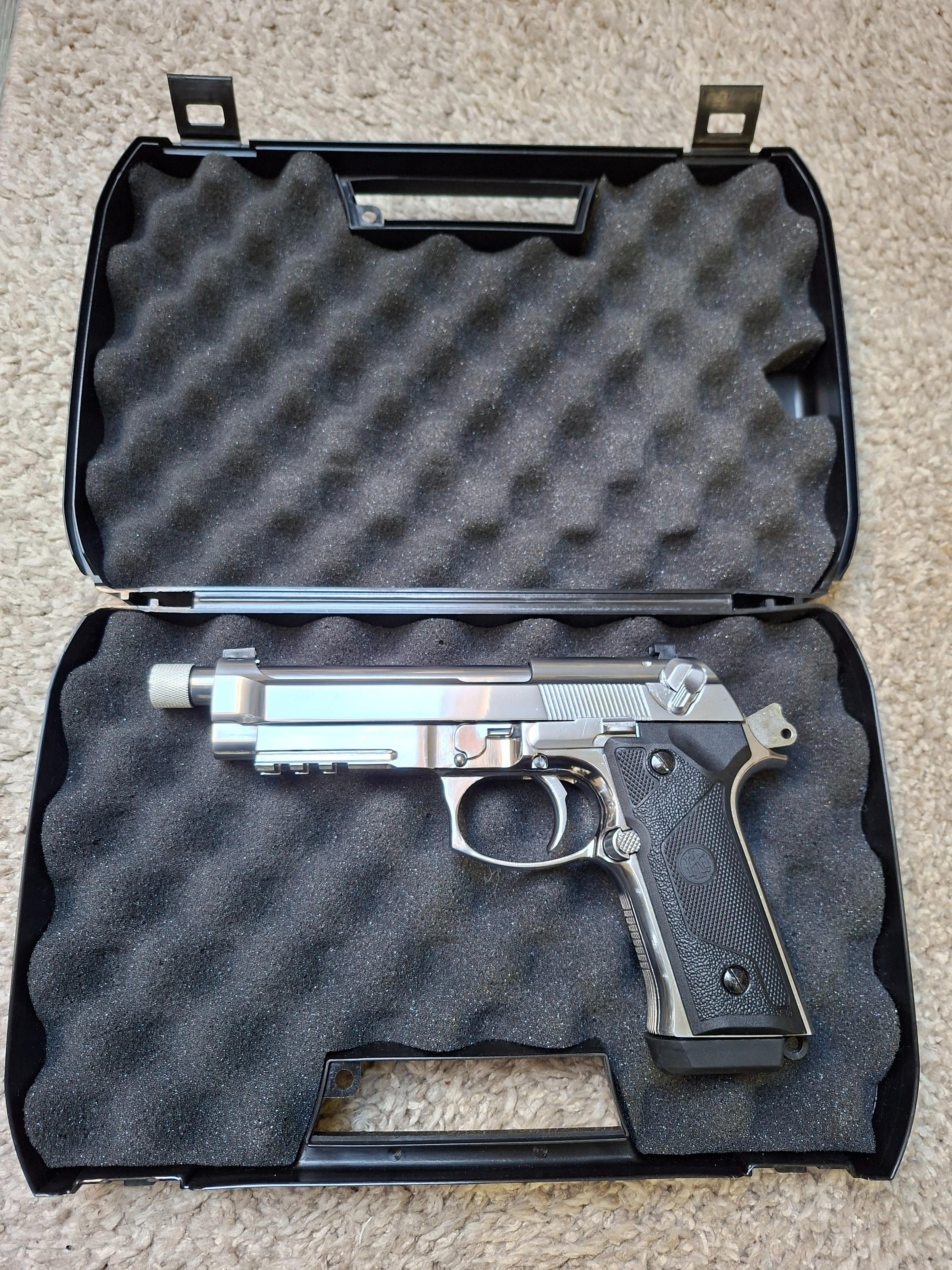 Kli m9 chrome finisch-GBB ( greengas)full metal .heeft een threaded barrel voor plaatsen van een supresor, inclusief koffer. In nieuwstaat , heeft vooral gediend als decoratie.