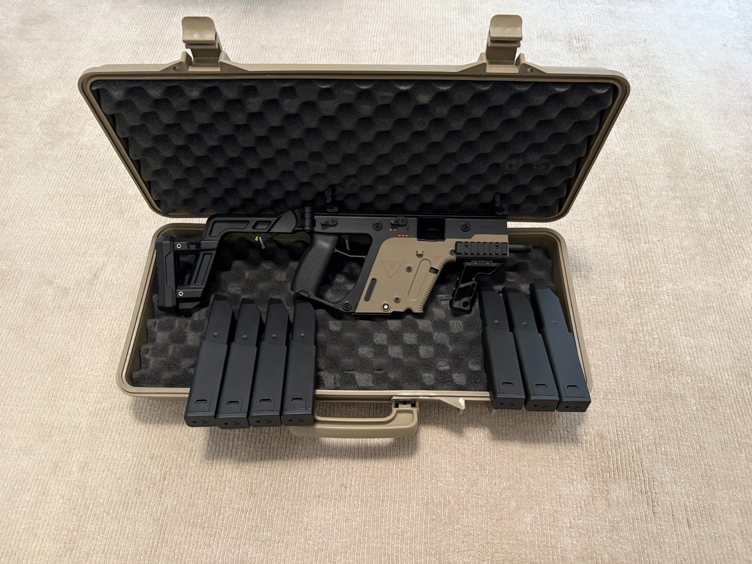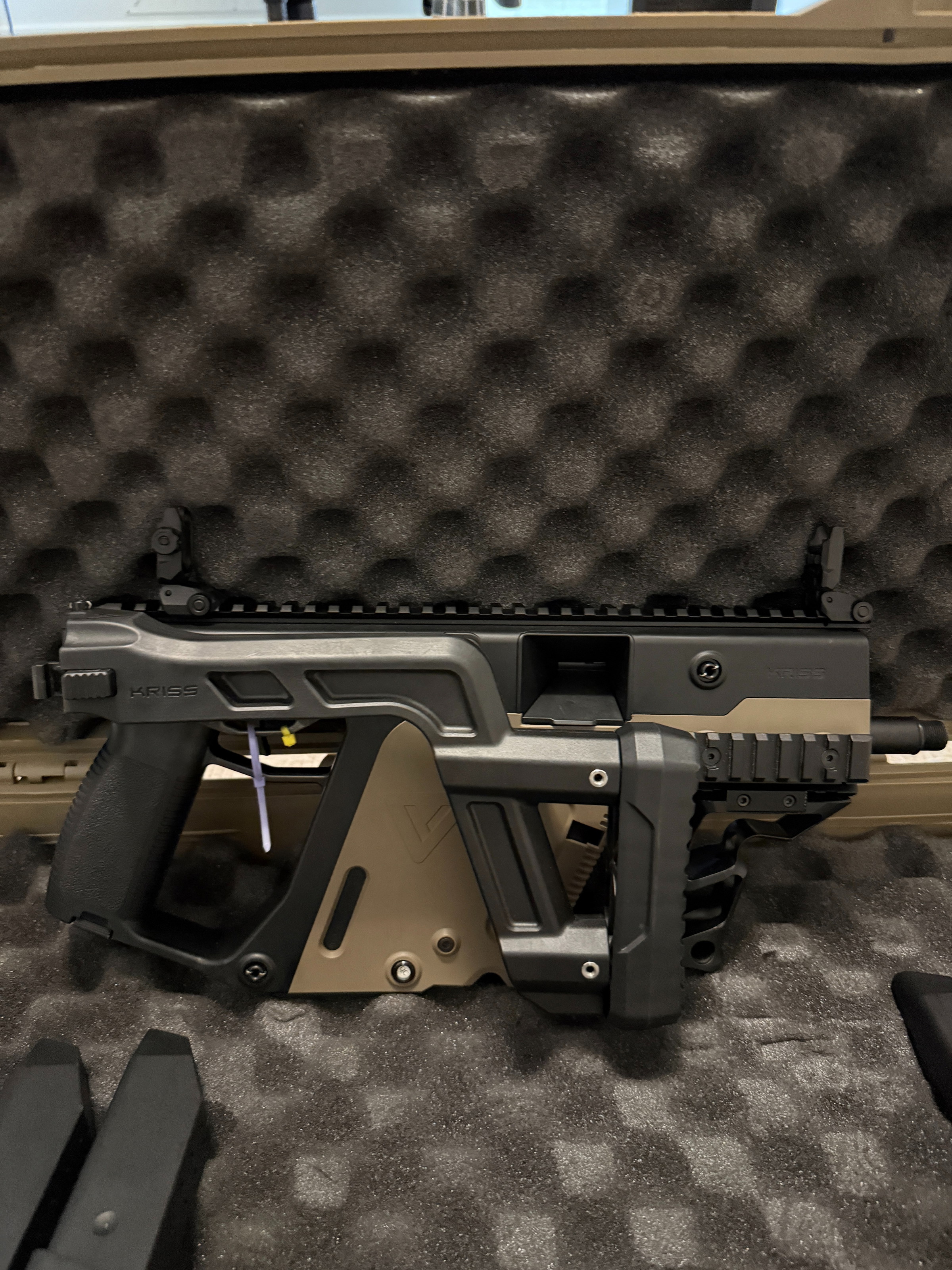 Elle est fournie avec 7 chargeurs, la boite de transport, la boite d'origine, 2 batteries, une poignée ainsi qu'un viseur Holographique.