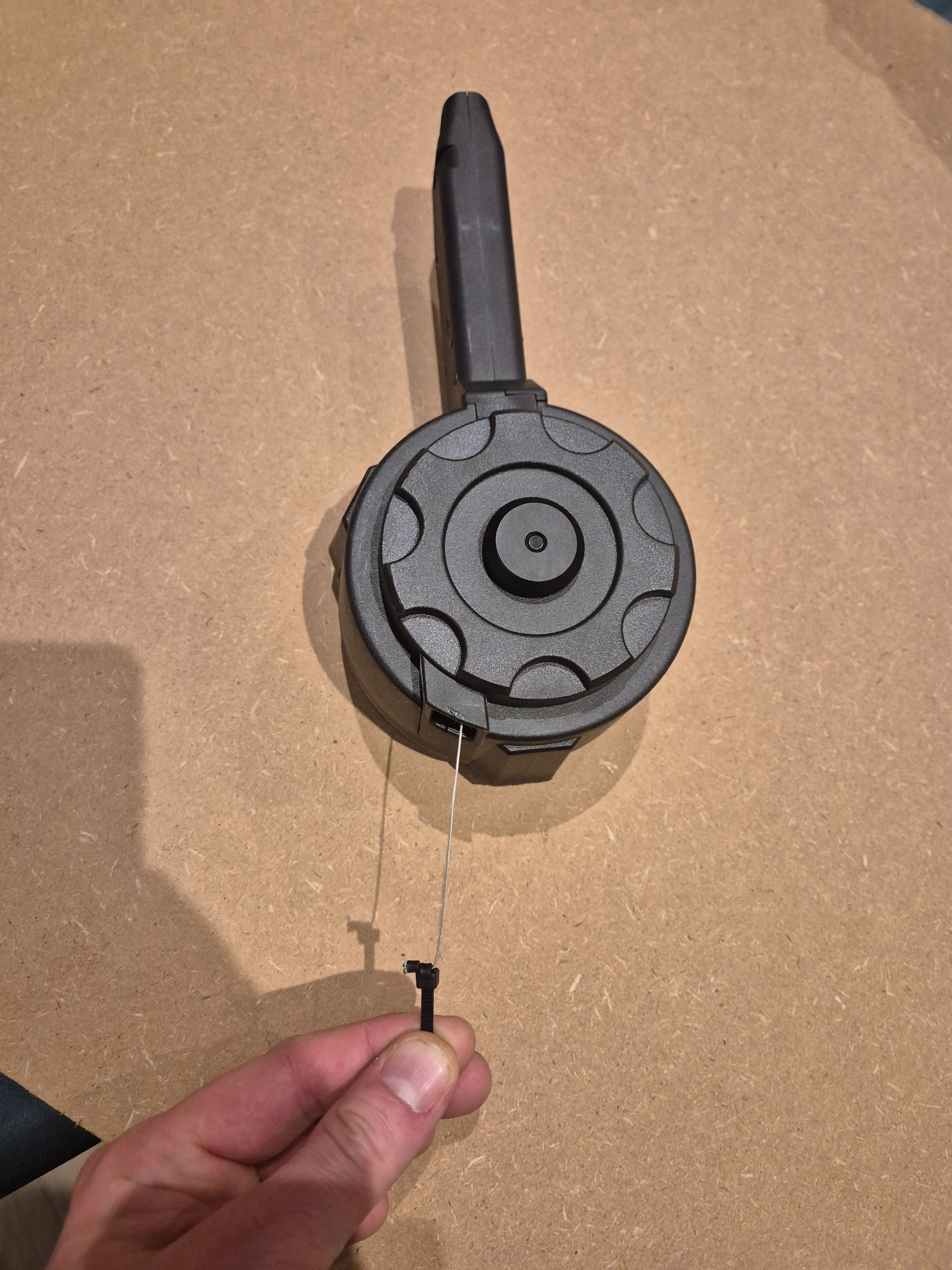 1 flash drummag. Knopje is weg. Zit nu een bandje om.