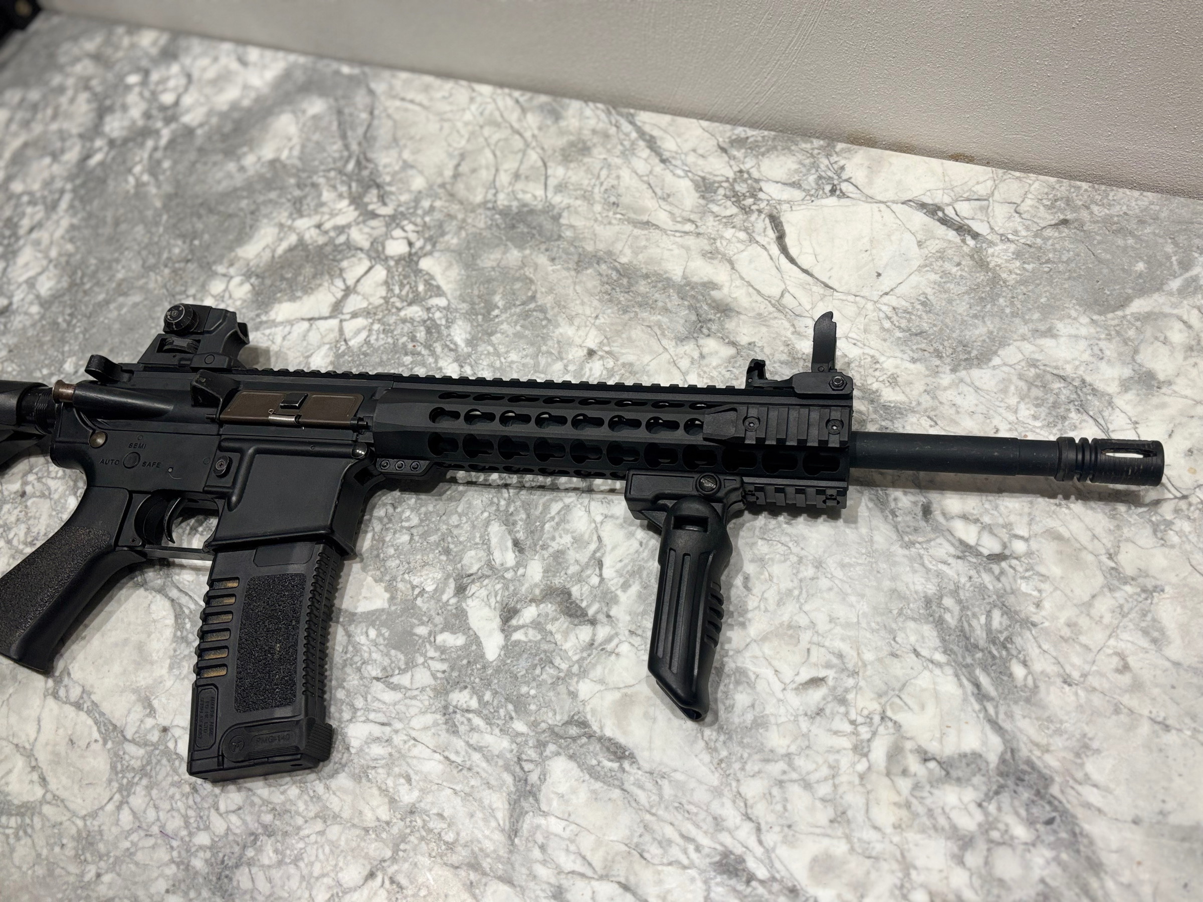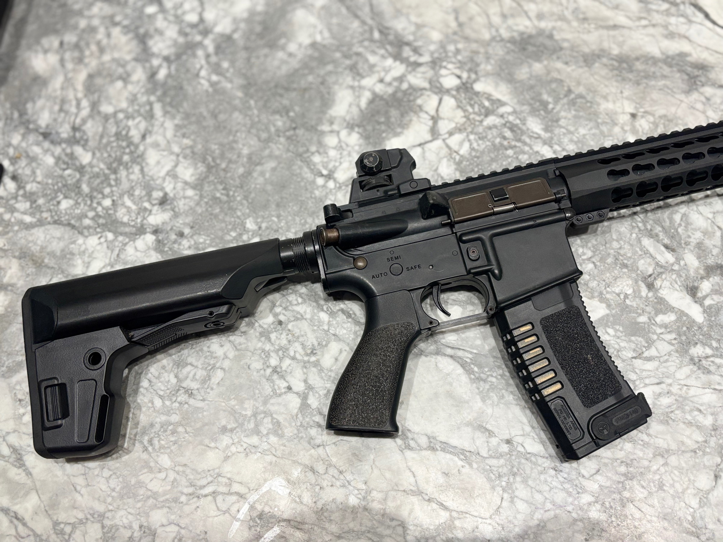 Extern voorzien van een andere outer barrel, handguard en een PTS EPS stock.