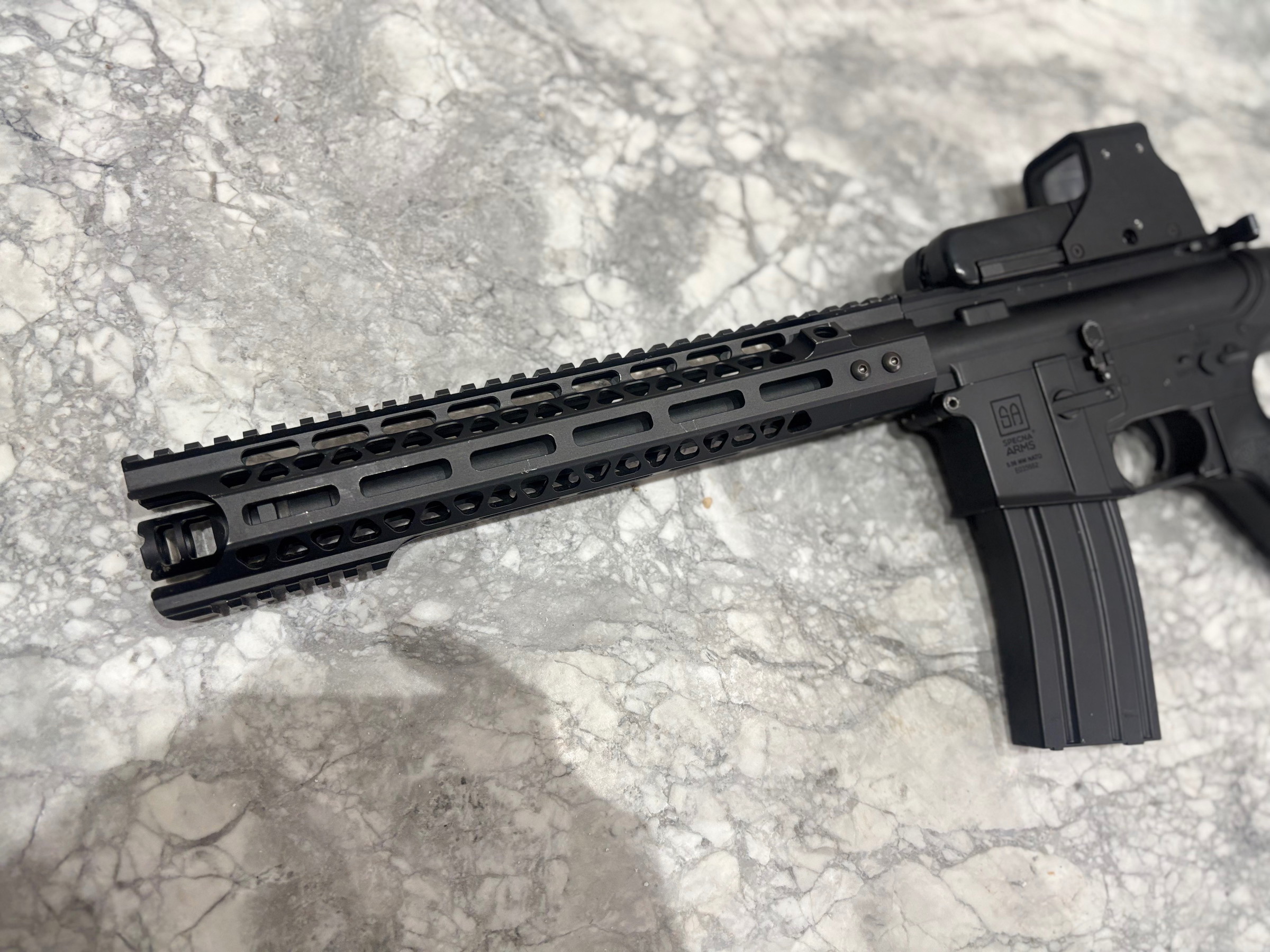 Replica word geleverd zoals afgebeeld. Dit is inclusief de holosight en hi-cap magazijn. De sight is voorzien van nieuwe batterijen, maar nog niet afgesteld op de replica.