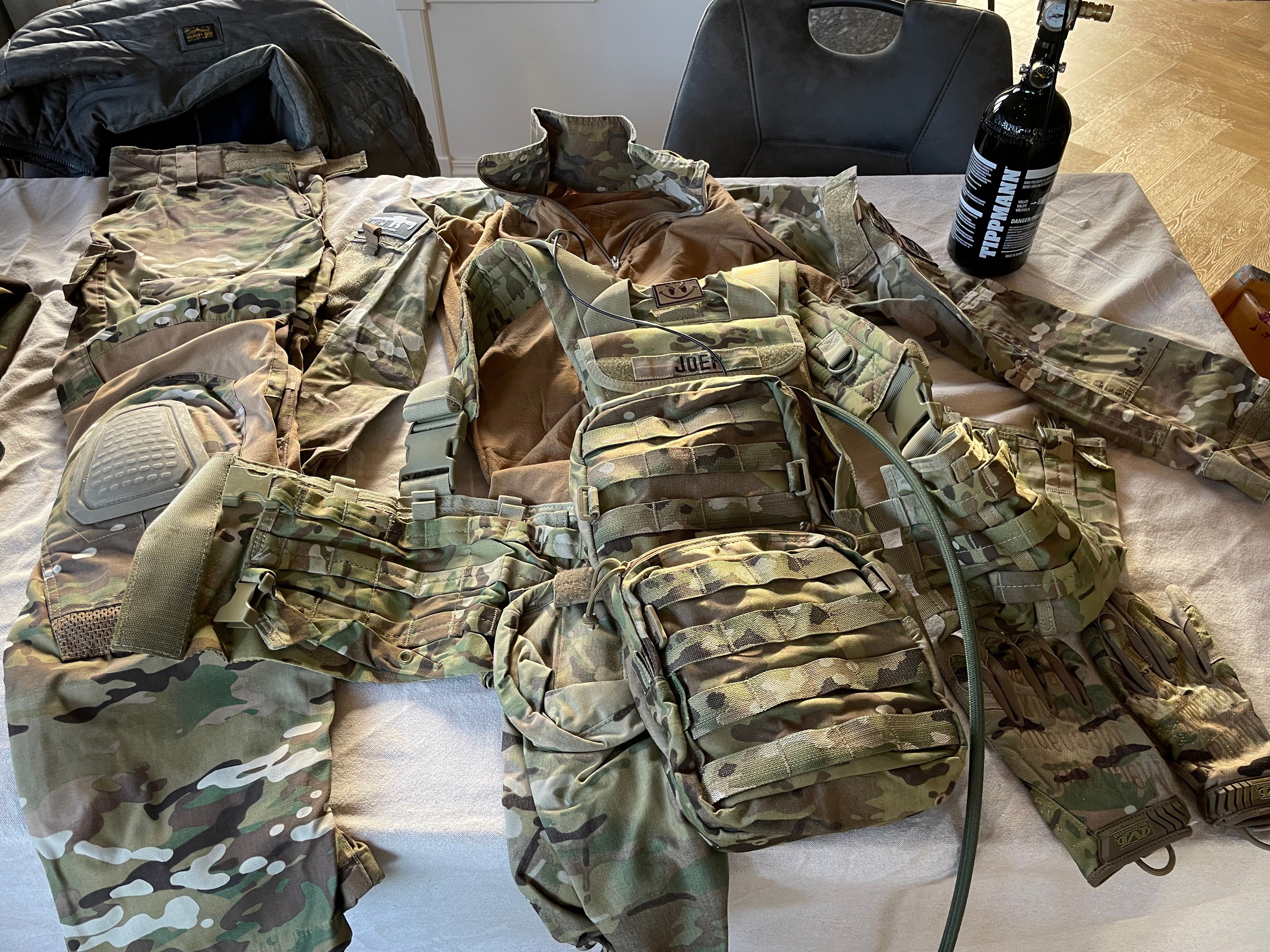 Opsomming gear: 2 nuprol koffers, 2 battlebelts, ghilisuit, maskers, heel veel pouches, 2 opladers etc.
