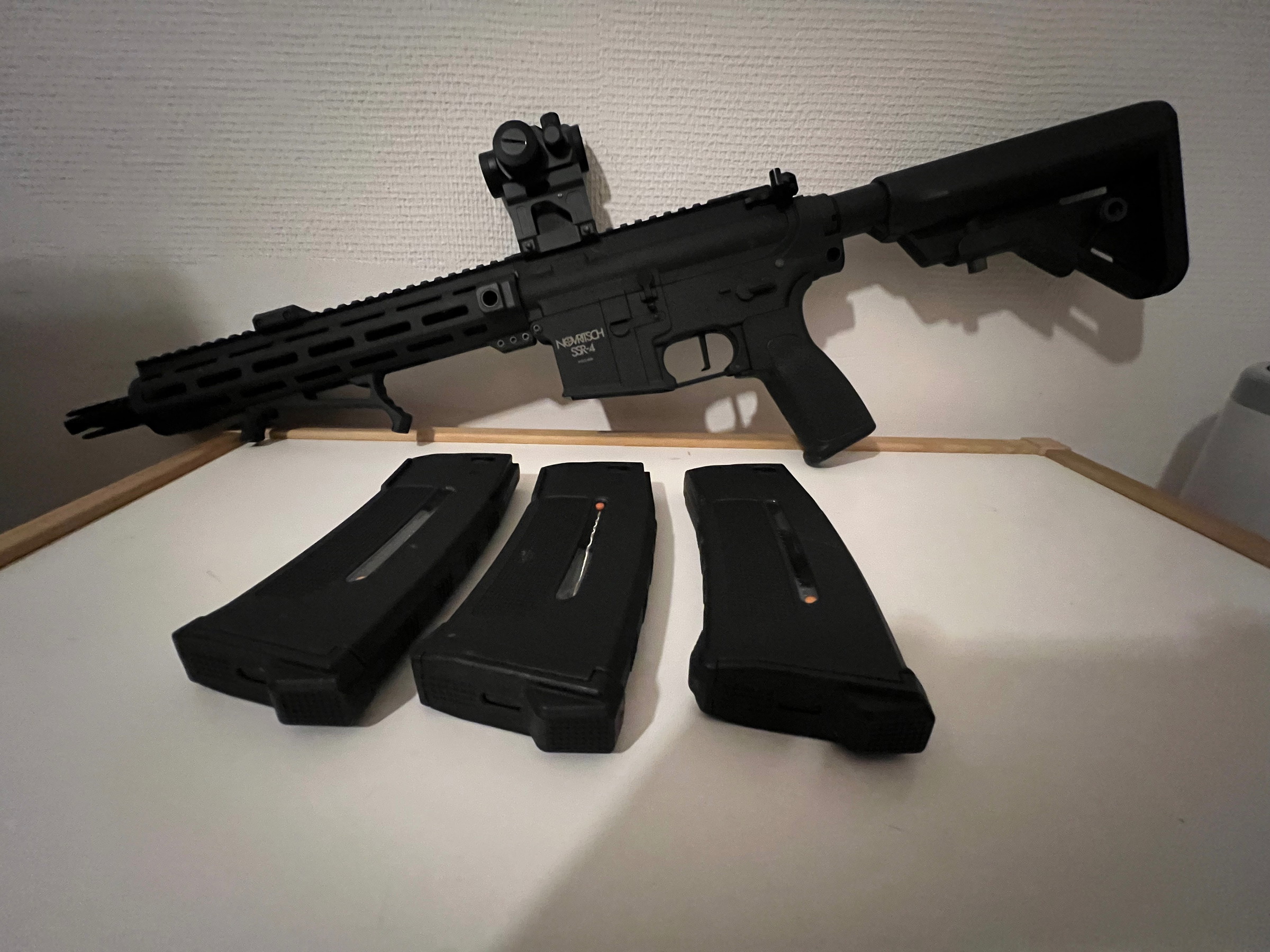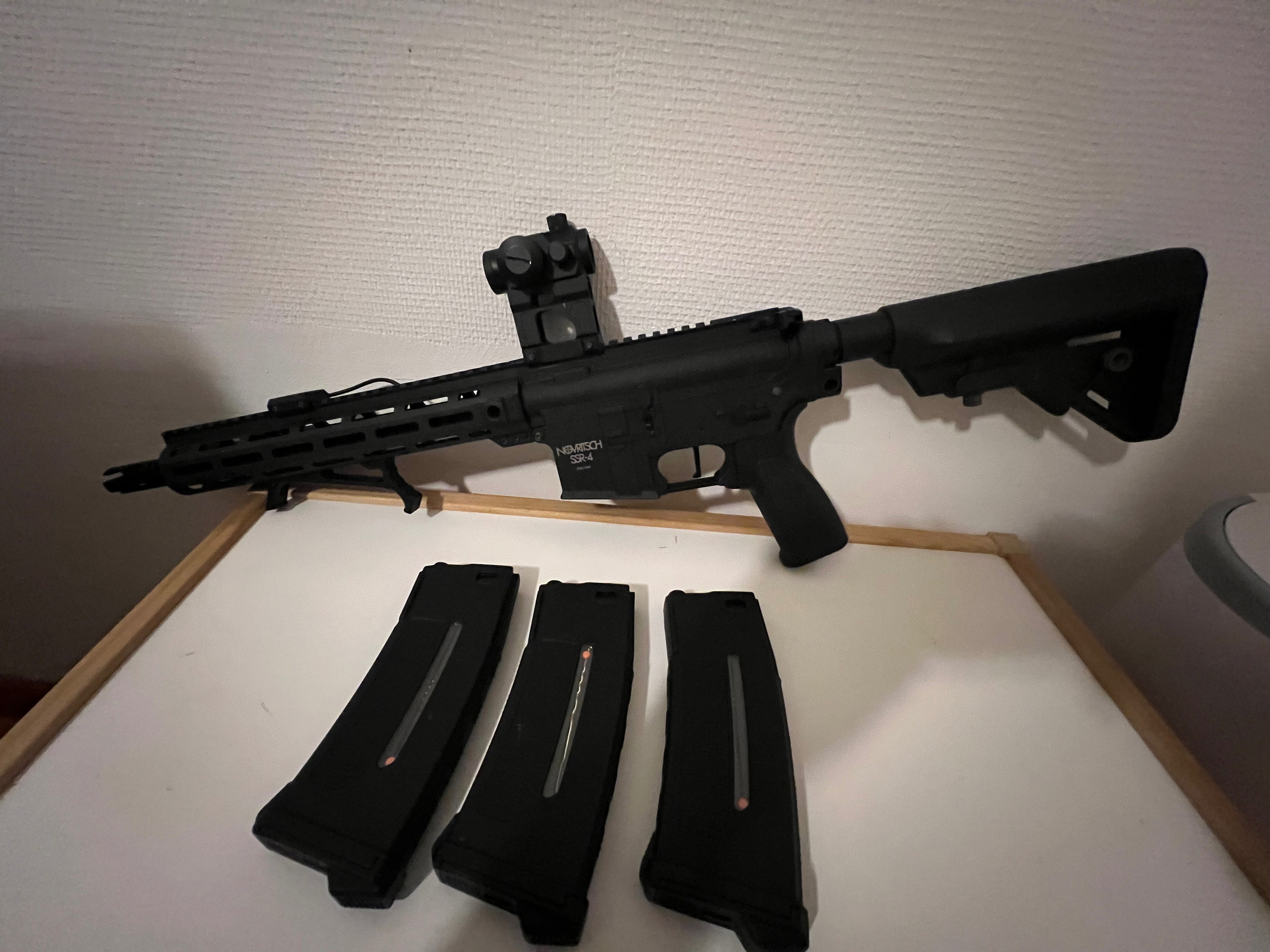 Ik verkoop mijn novritch ssr4 omdat ik te weinig ga airsoften deze komt met batterij 3 epm1 mags een angled grip en een flashlight en een scope op een unity riser.