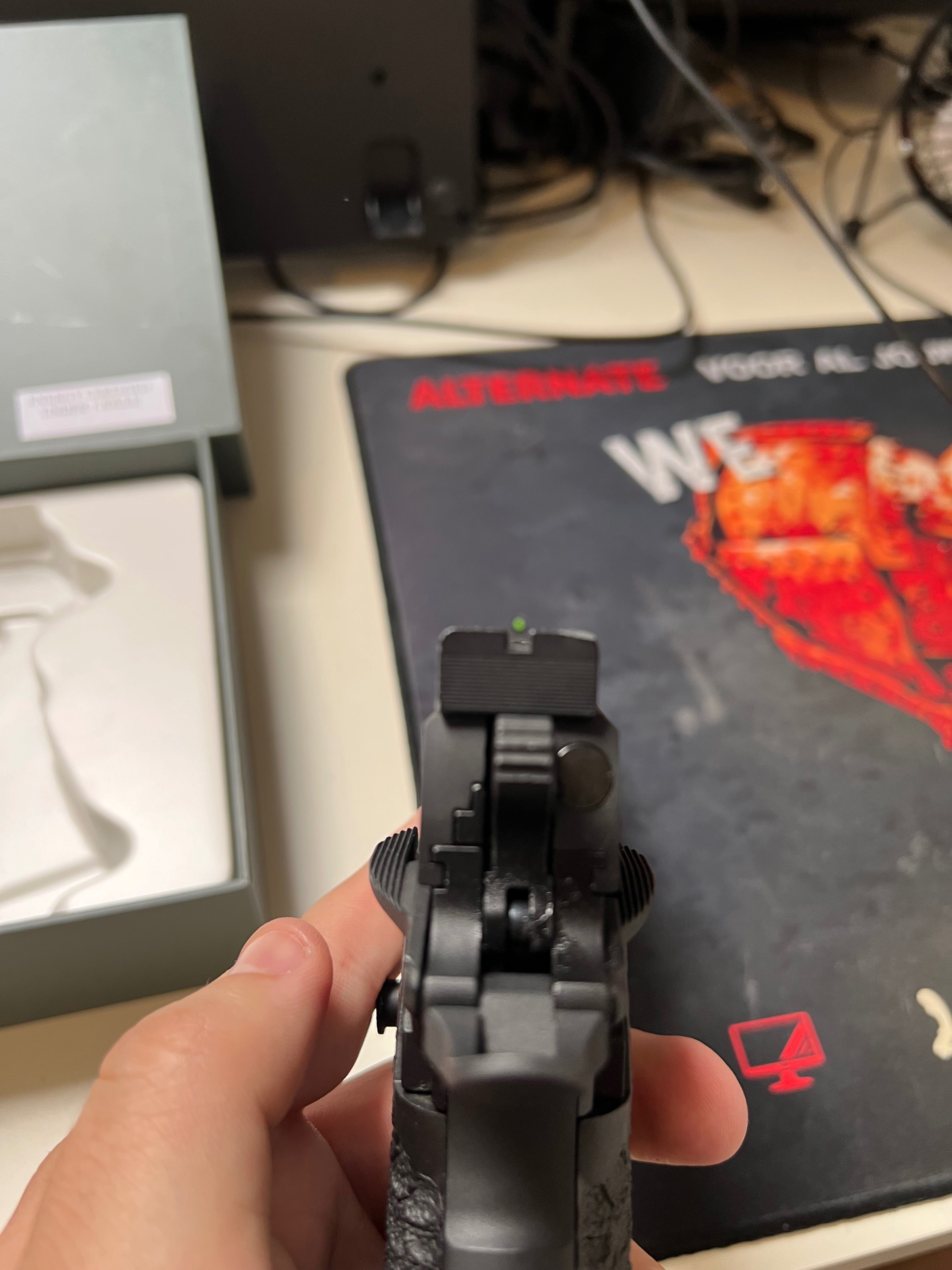 Het enige aandachtspuntje: de front sight is een stukje afgebroken door een botsing met een muur, hierdoor is er ook een klein schraafplekje aan de voorzijde van de ironsight. De iron sight werkt echter nog perfect dus je merkt er verder niks van.