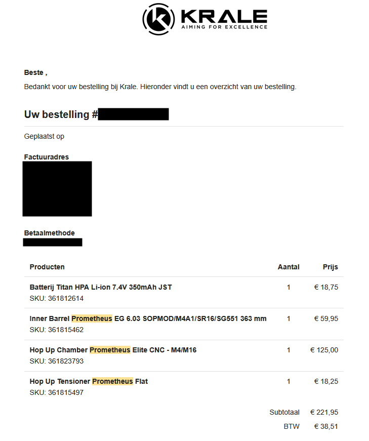 Ik ben met een nieuwe build bezig maar ik ben erachter gekomen dat deze veels te lang is en niet in de demper past die ik bij de build wil gebruiken. De barrel heeft alleen een tijdje in de build gezeten maar ik heb er nooit mee geschoten omdat deze nog niet volledig af was en ik nog wacht op HPA onderdelen.