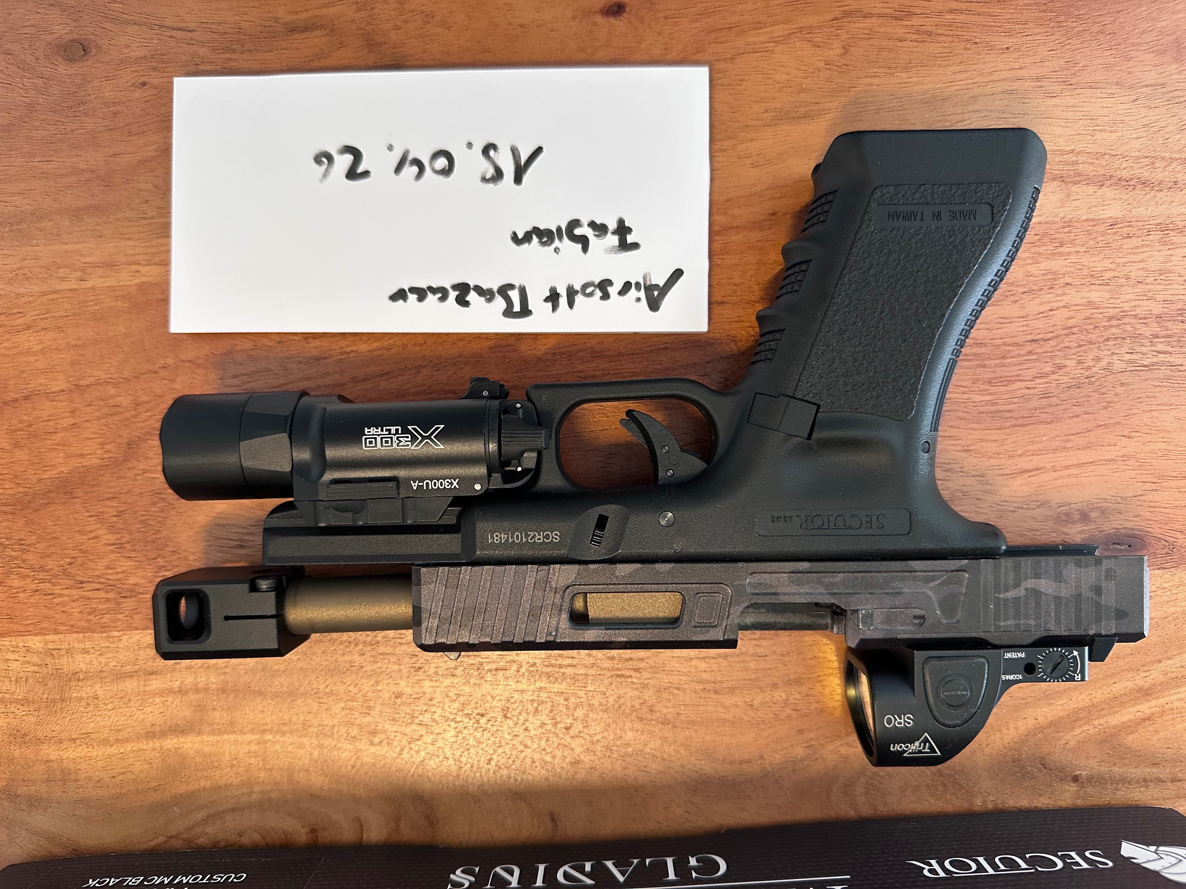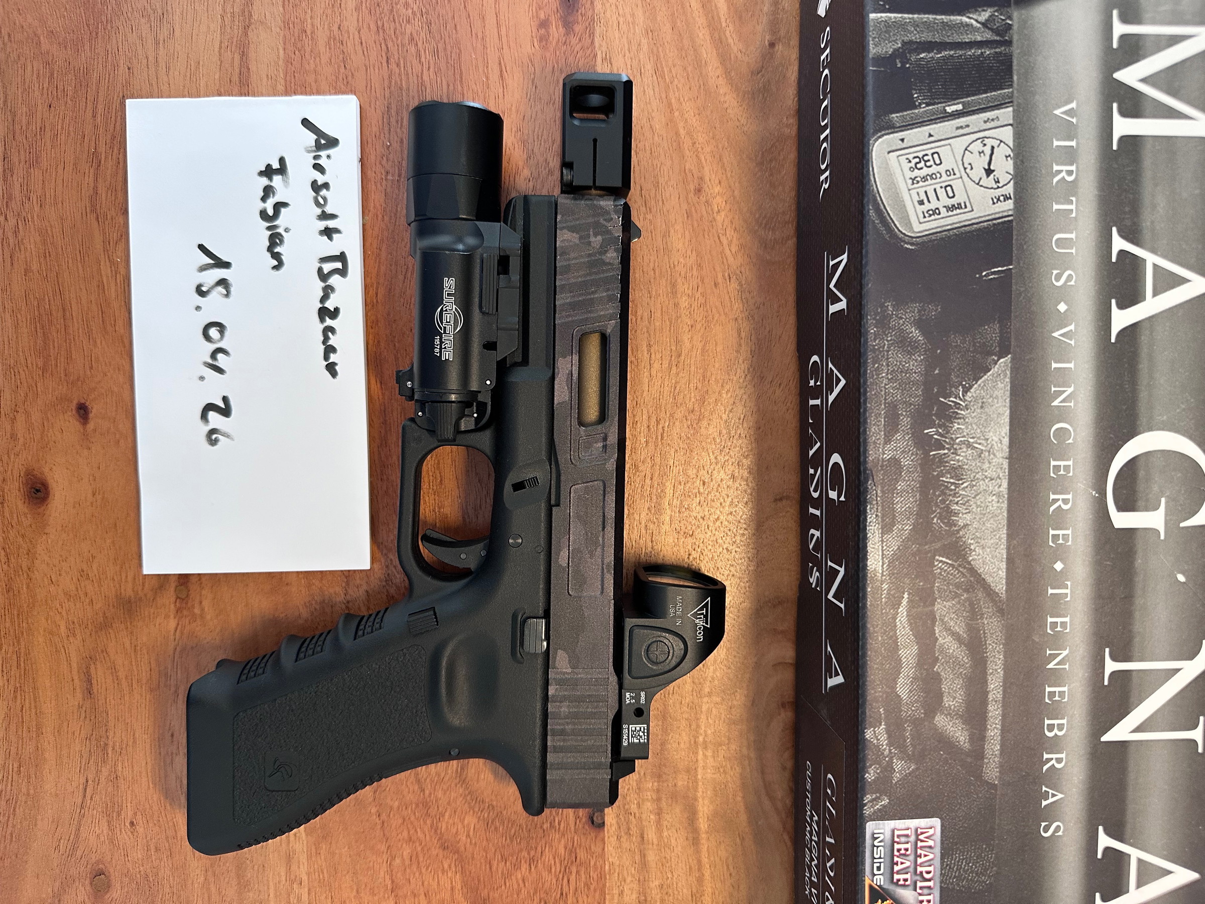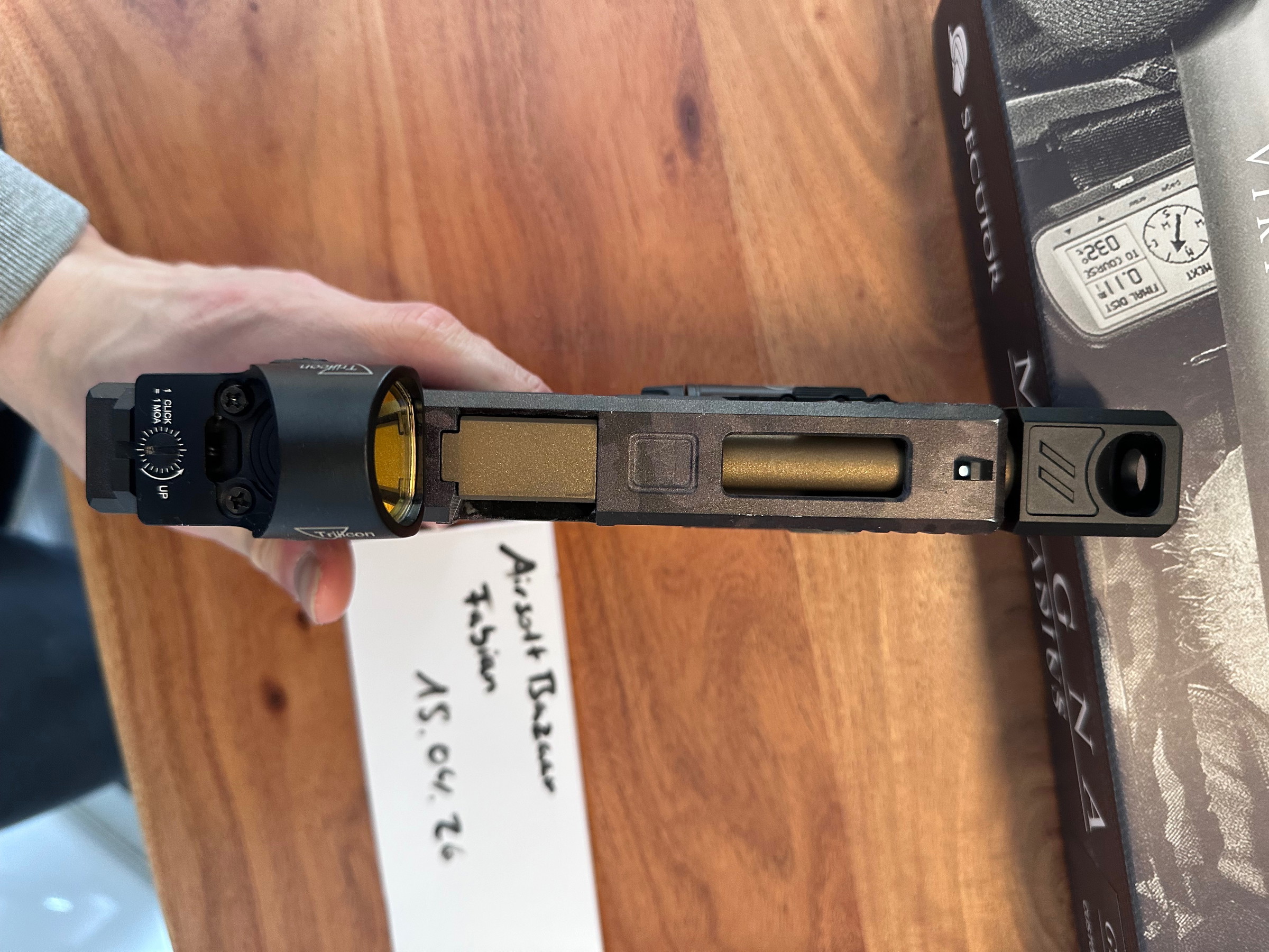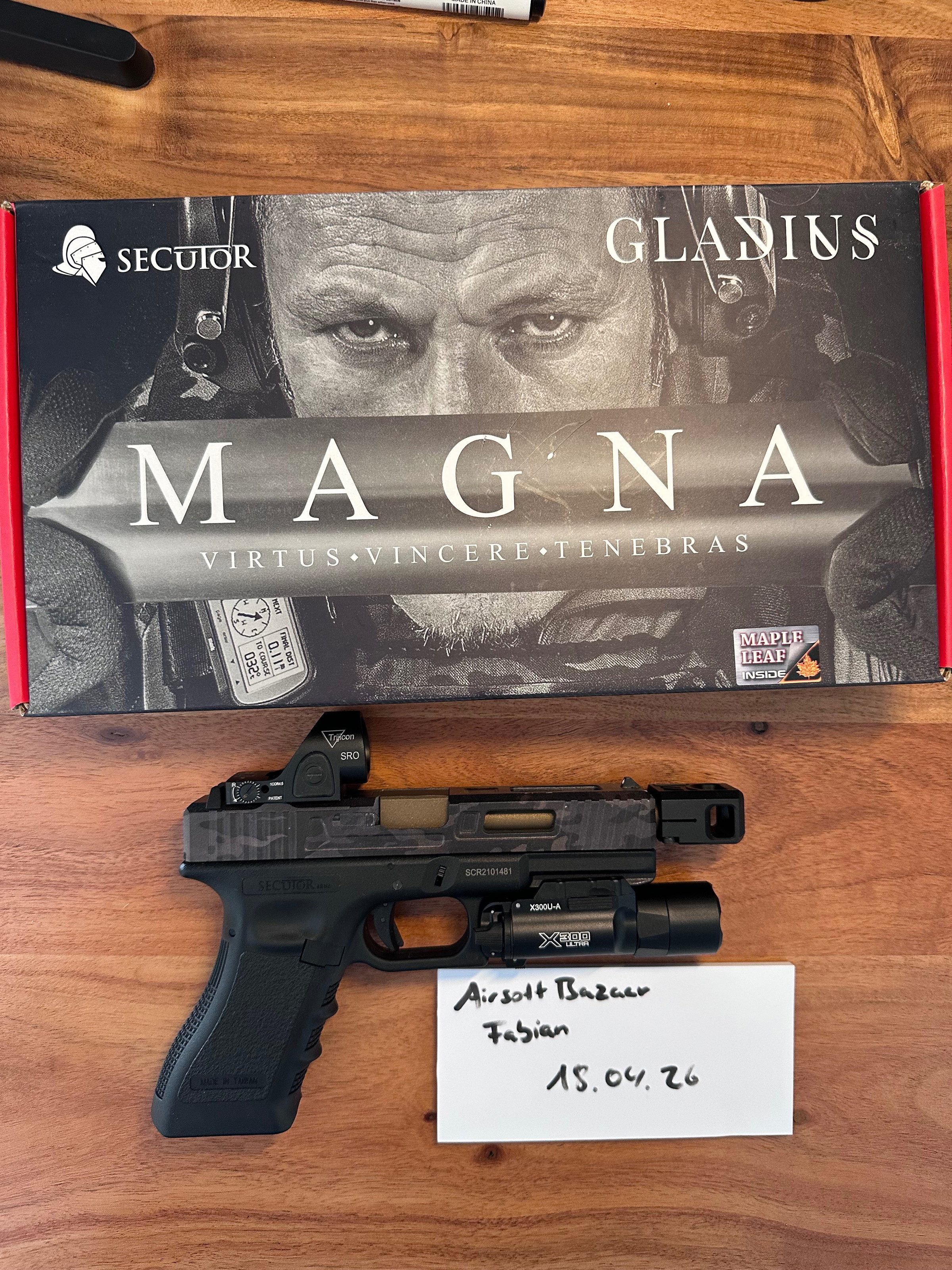 Secutor Gladius Magna VI Custom GBB Pistole mit einem Schlitten in MC Black. Sie ist neuwertig da sie noch keinen einzigen Schuss durch hat. Der Lauf wurde in cerakote burnt bronze beschichtet.
