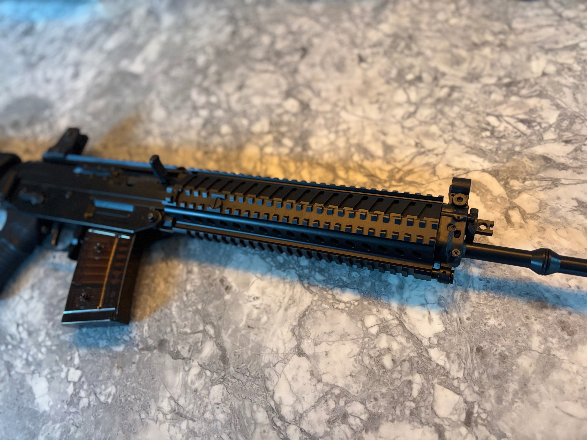 De replica was (deels) gespoten in camo kleuren. Ik heb hem weer in een nette, mat zwarte, kleur hersteld.