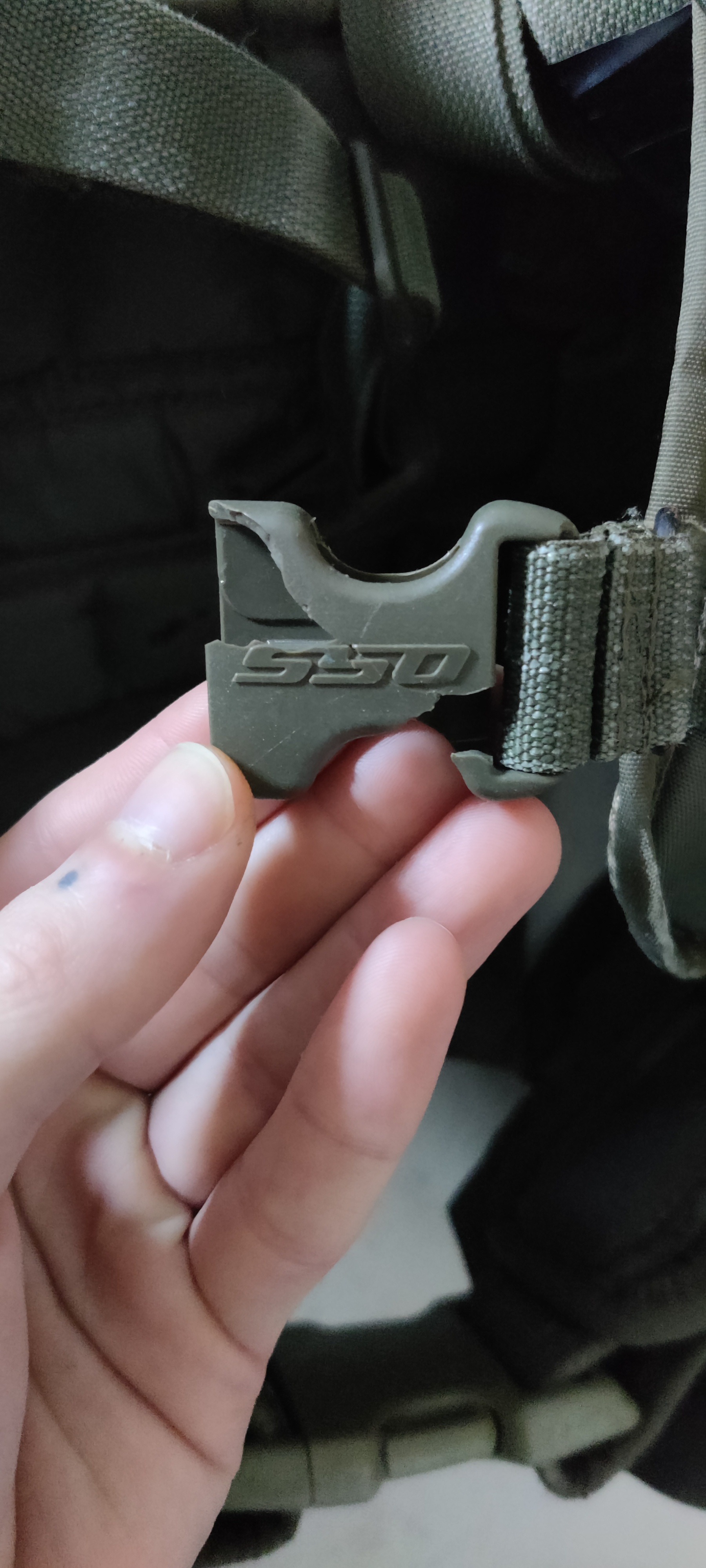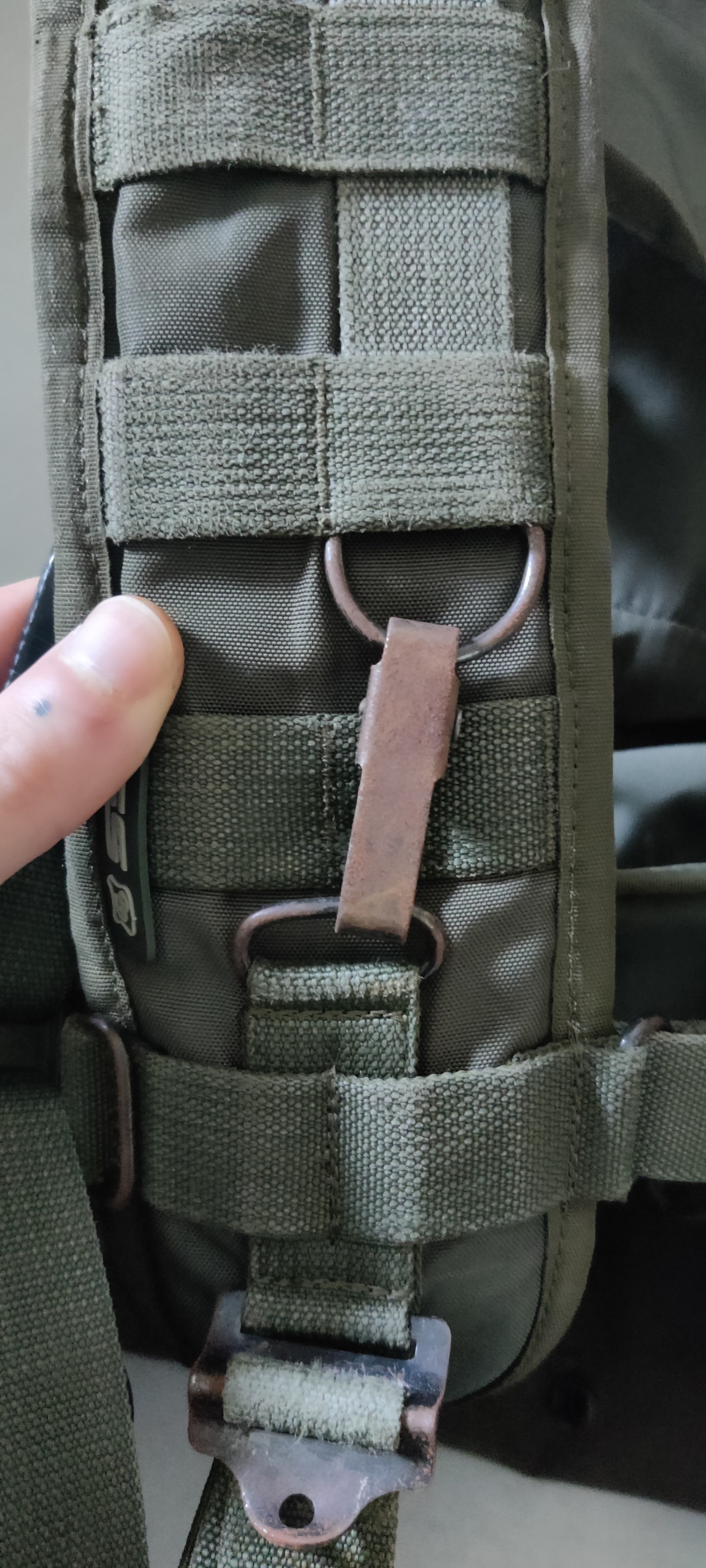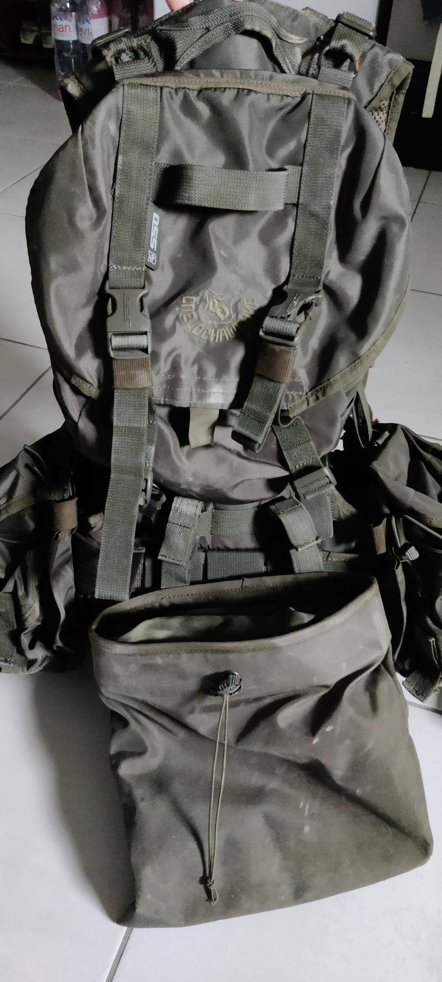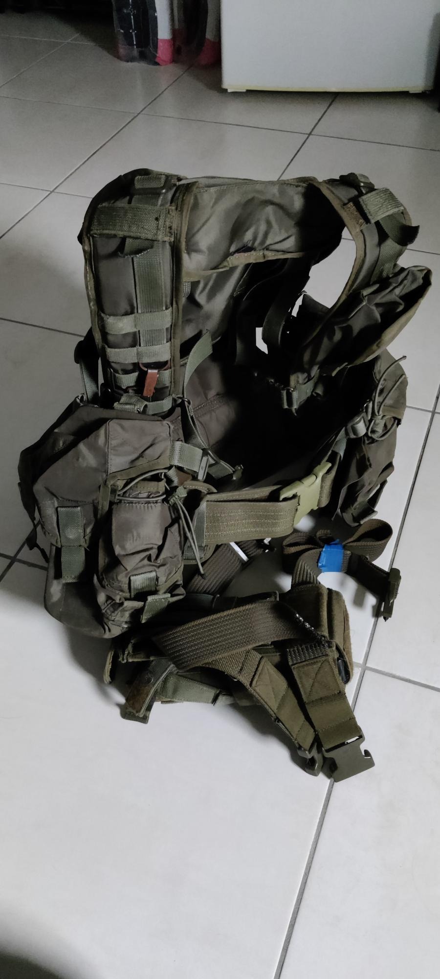 je l'ai utilisé pendant près de 4 ans donc forcément il a du vécu mais rempli encore parfaitement ses fonctions, certaines boucles ont pris des billes, les pièces acier un peu rouillées, fourni avec un holster universel de cuisse déjà attaché et une dump pouch od SSO