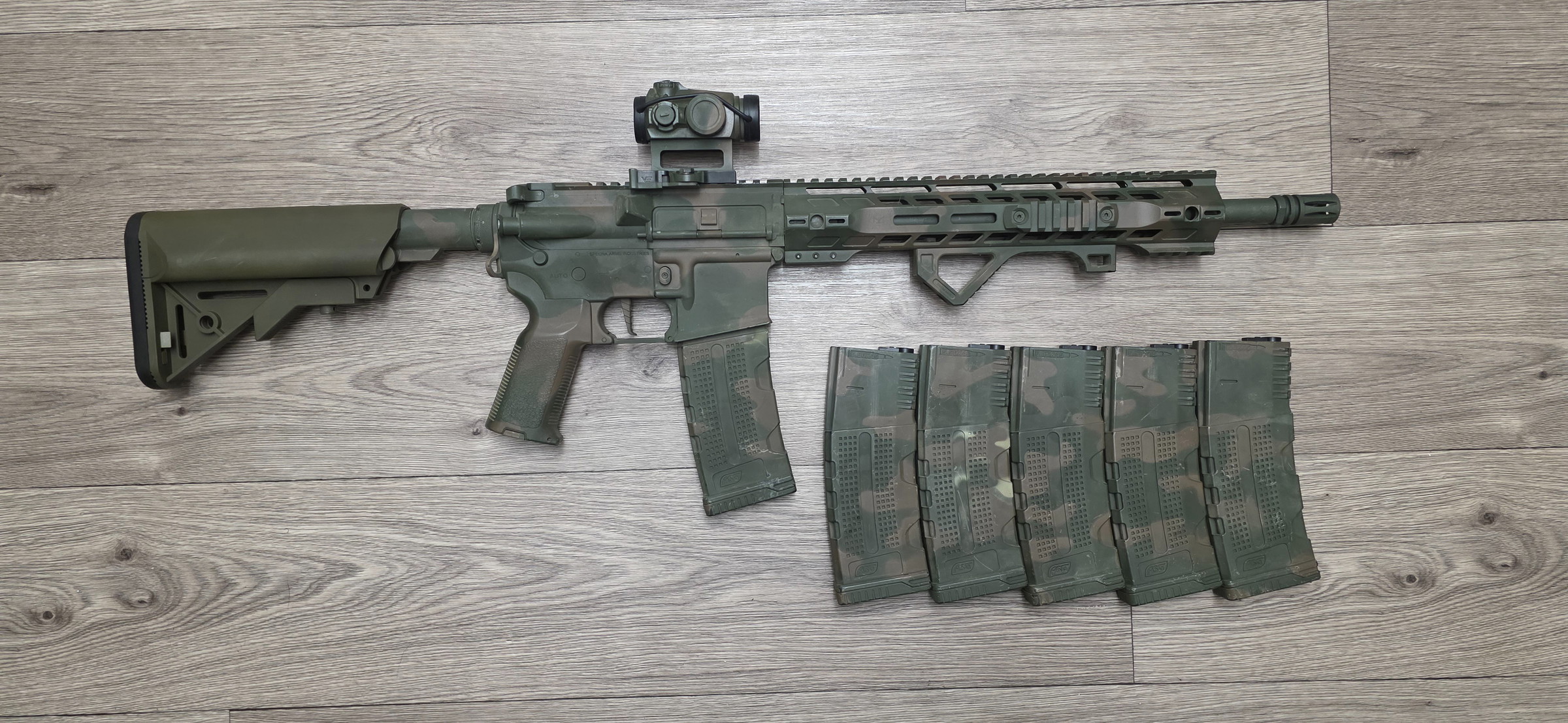 Specna arms sa p14 prima met dark matter motor.  Komt met vector optics maverick 3 reddot en 6 asg midcaps met 180 bb's capacity. De replica komt met 1 batterij en een maple leaf bucking en nub geinstaleerd. Gaat weg omdat ik ben overgestapt naar een ander platform. Heb er 5 skirms mee gespeeld.