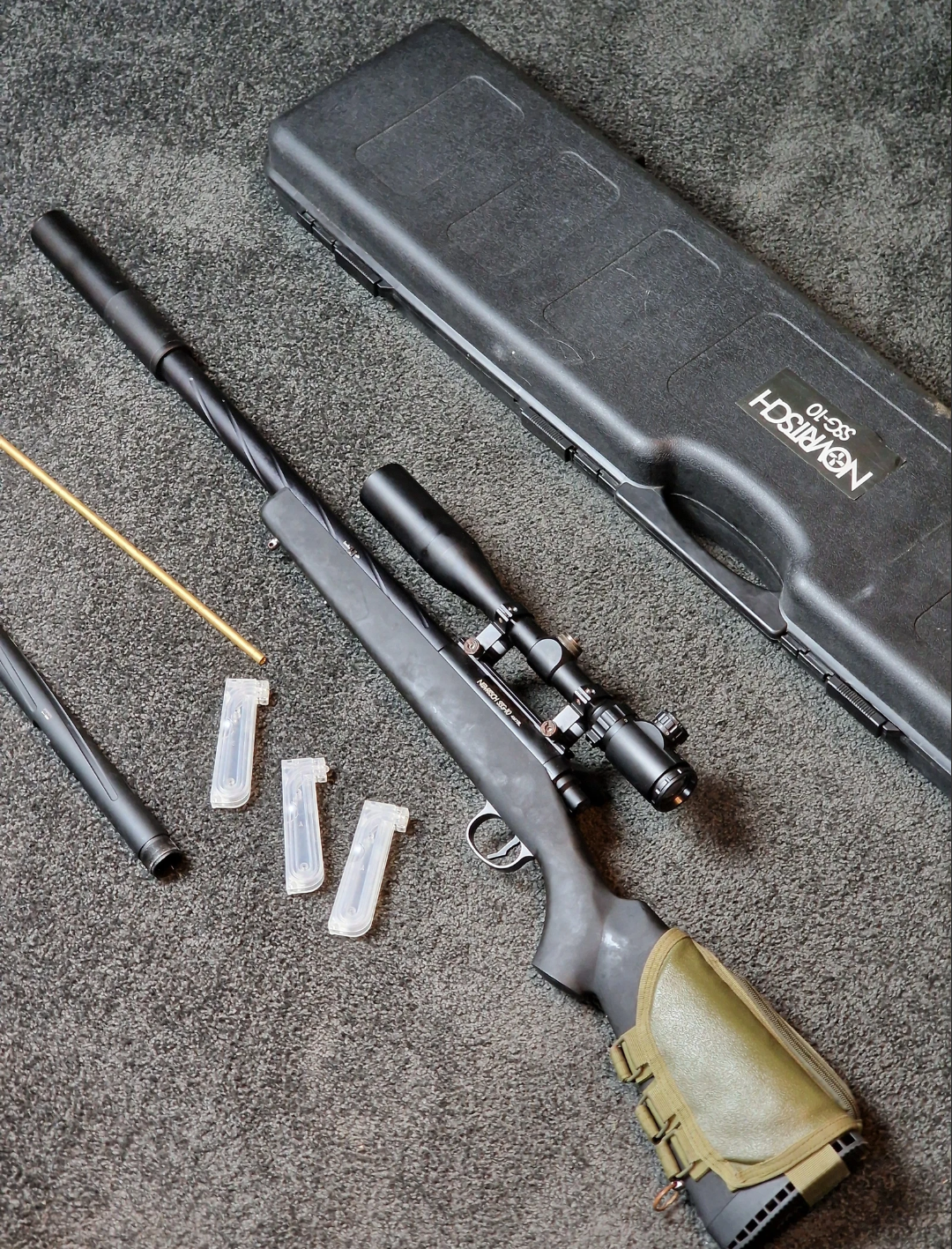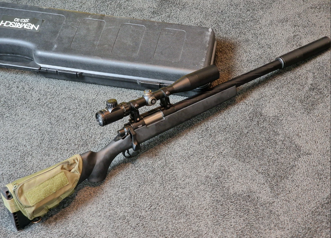 Voorzien van een scope (3-9 x 40mm) suppressor, airbrake een pouch op de stock om de magazijnen in te bewaren.