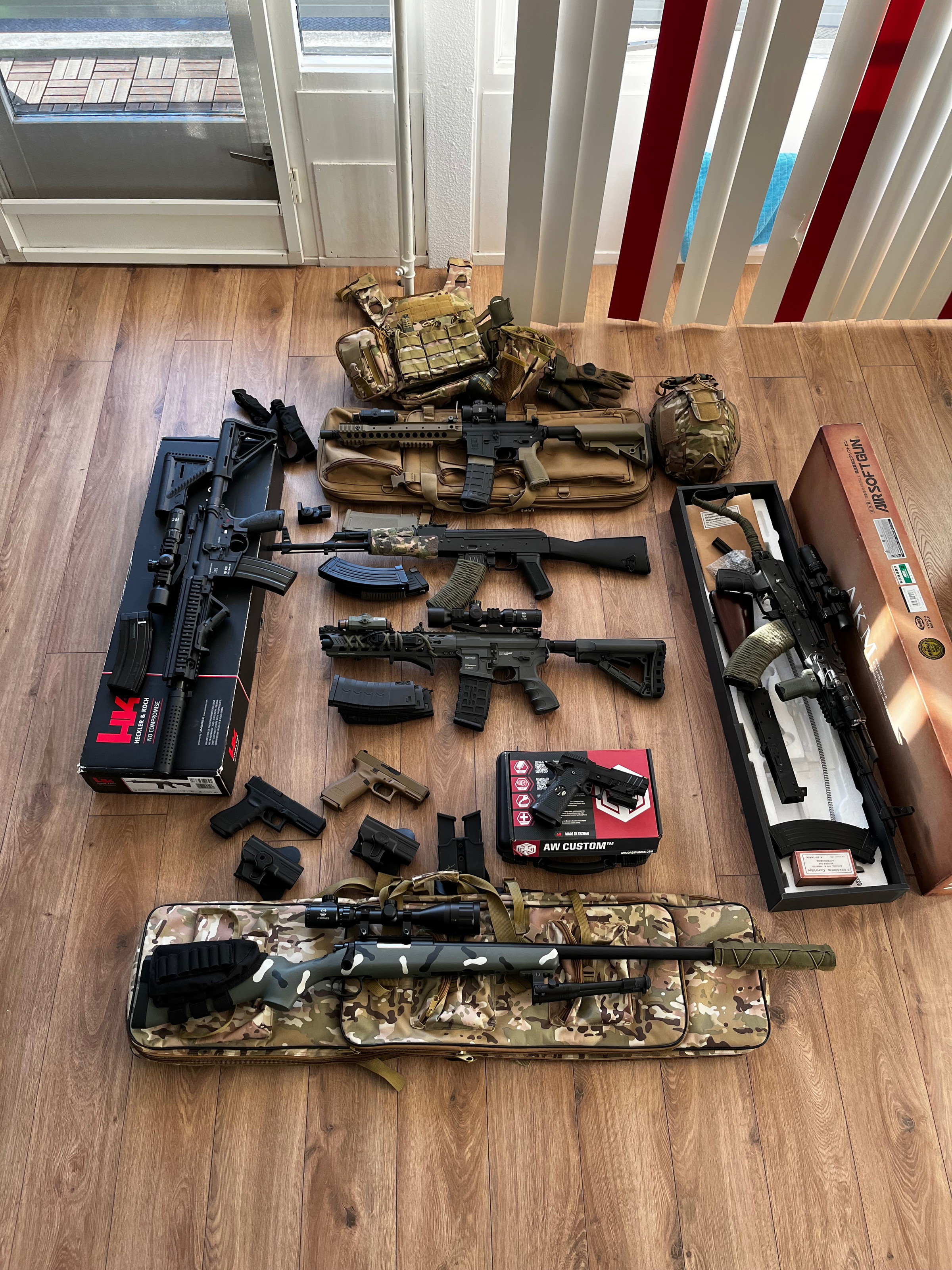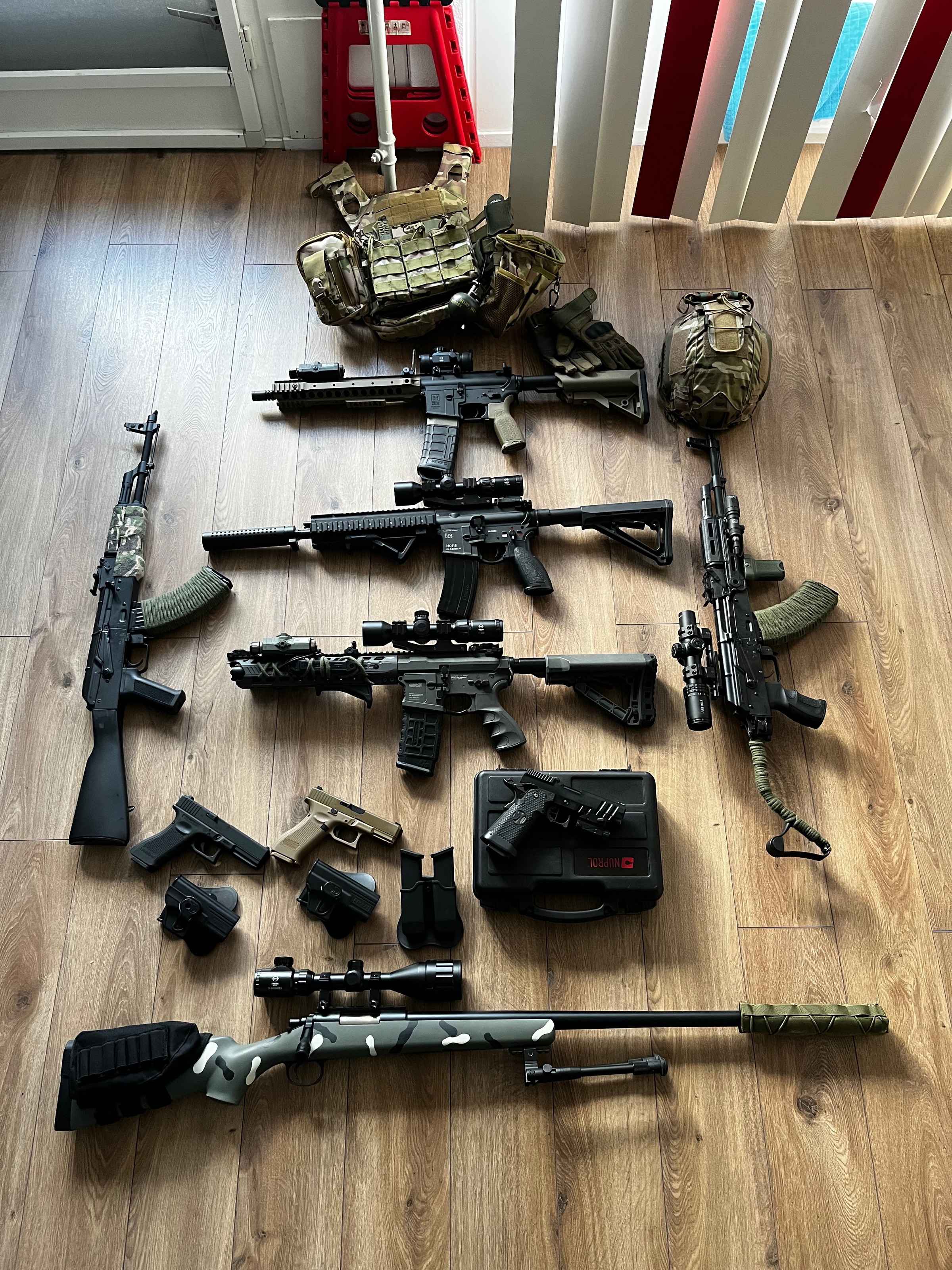 1: Tokio marui akm gbb- mijn project. 2: Tokio marui vsr10 pro. 3: Heckler& koch hk416 a5 gbb. 4:G&G Predator gc16. 5: Cyma cm050 ebb (ak47). 6: Specna arms sa-e06 edge. 7: AW custom HX2602. 8: Umarex glock 19x. 9: Umarex glock 17 gen4. en echt veel extras.