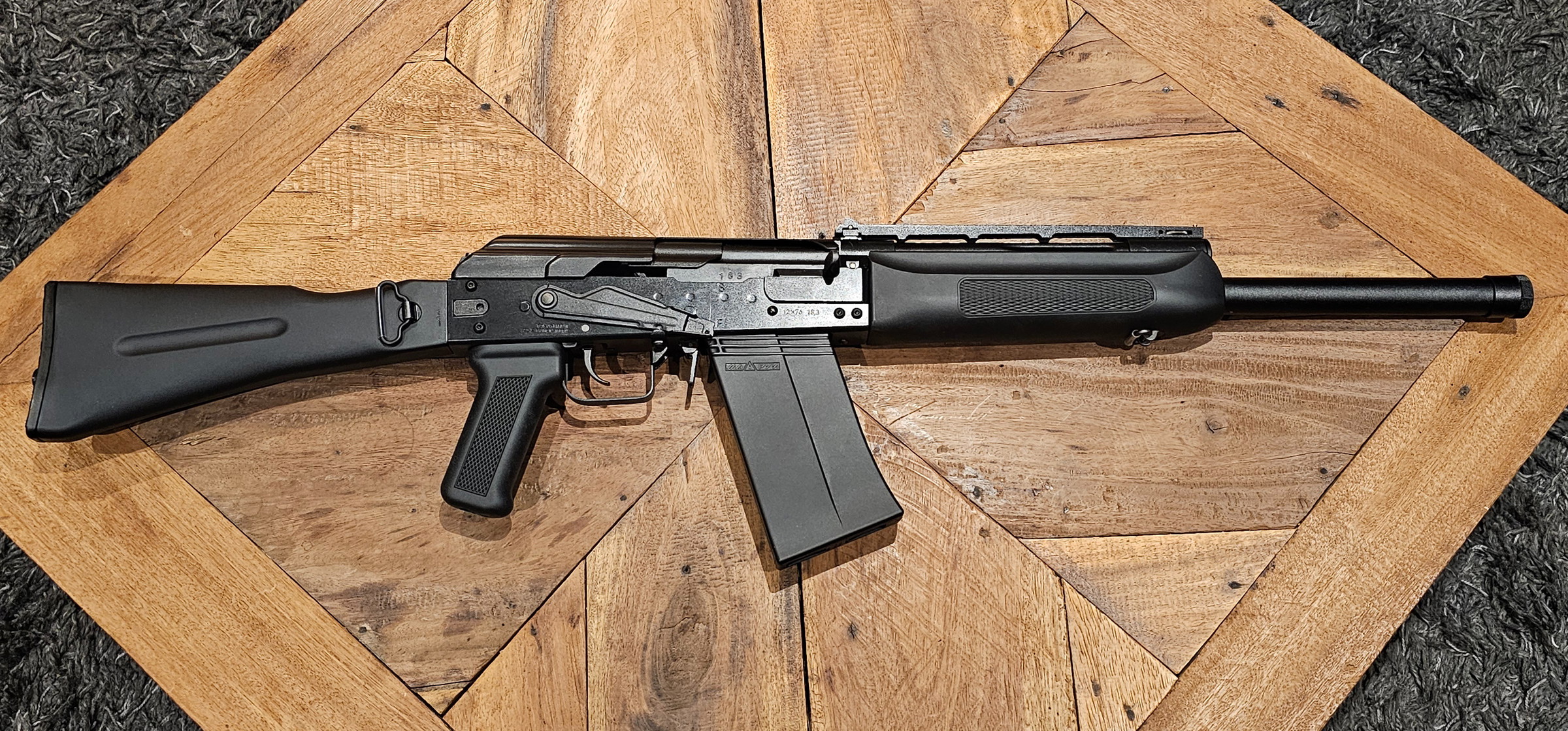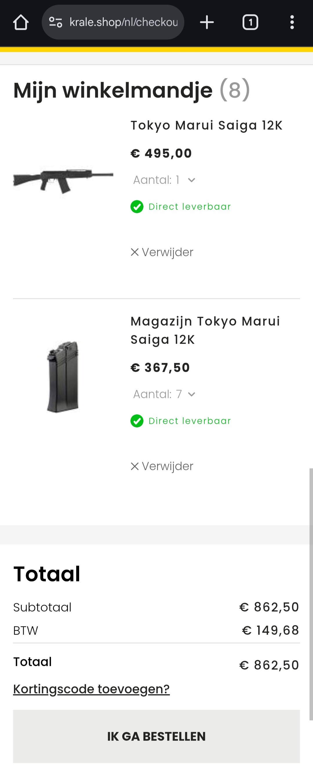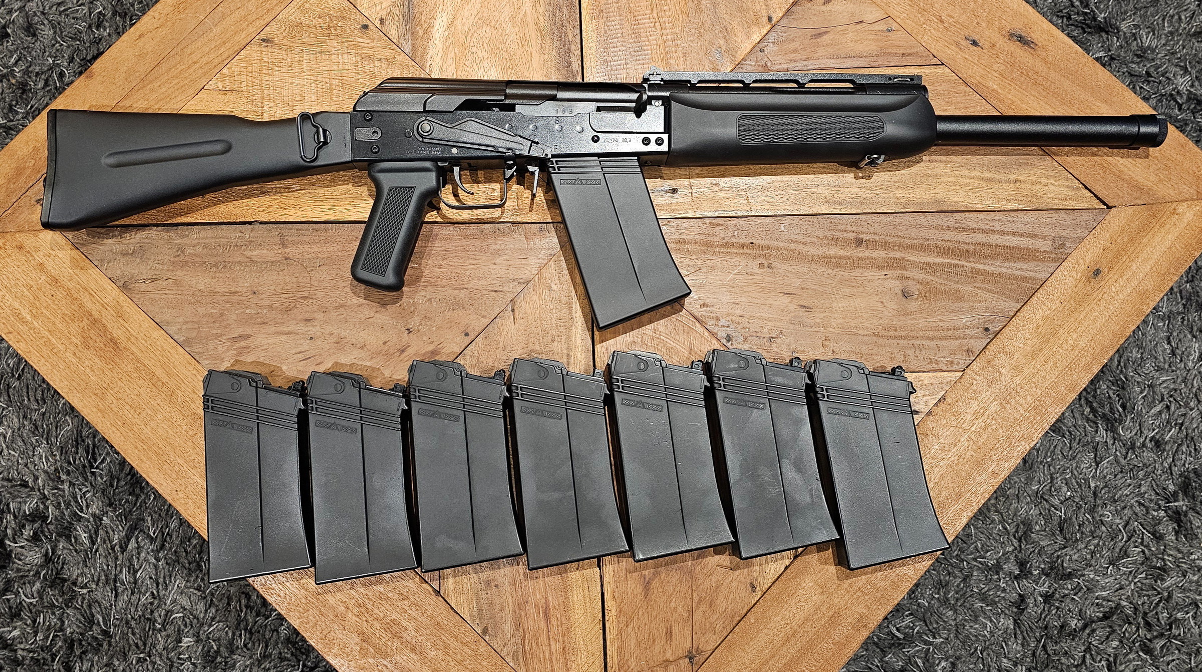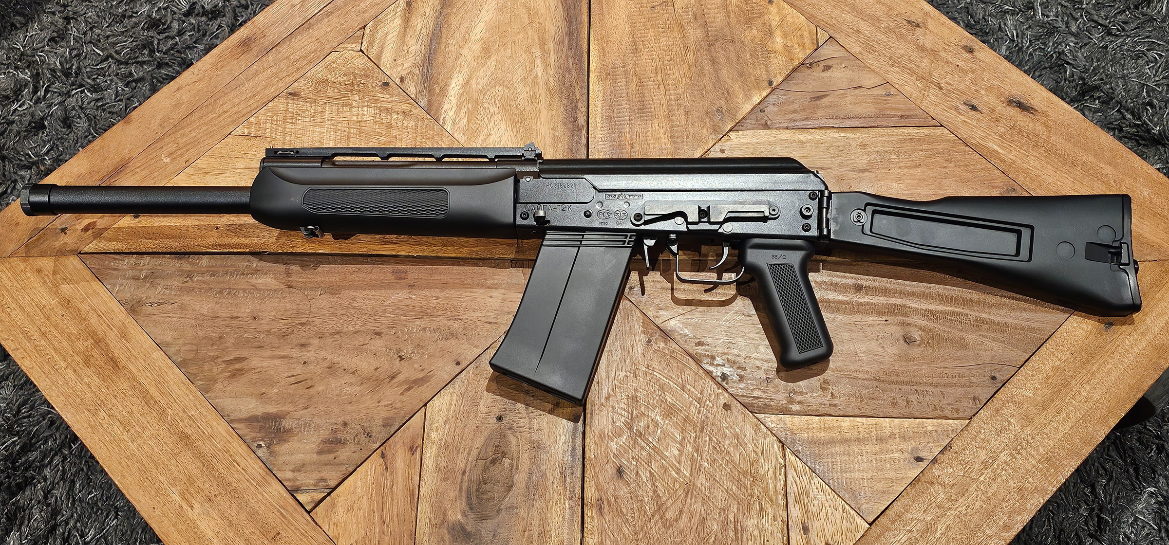 Te koop is deze Saiga 12 van Tokyo Marui. Nog ongebruikt in de originele doos, met 7 extra magazijnen.