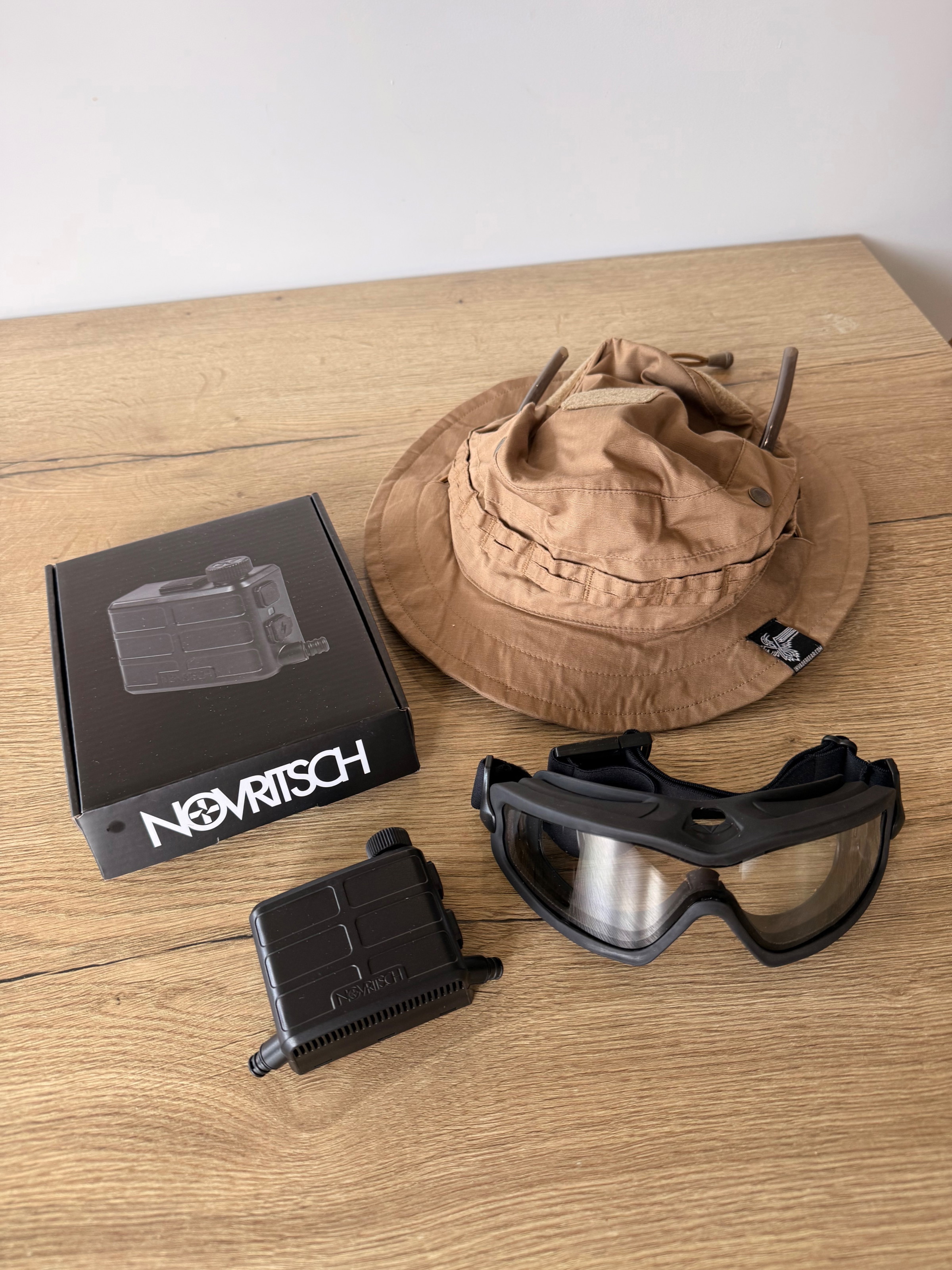 Voor de rest 2 gasflessen, bolletjes, grote Nuprol koffer, novtrisch bril + blazertje, soft bag voor wapens.