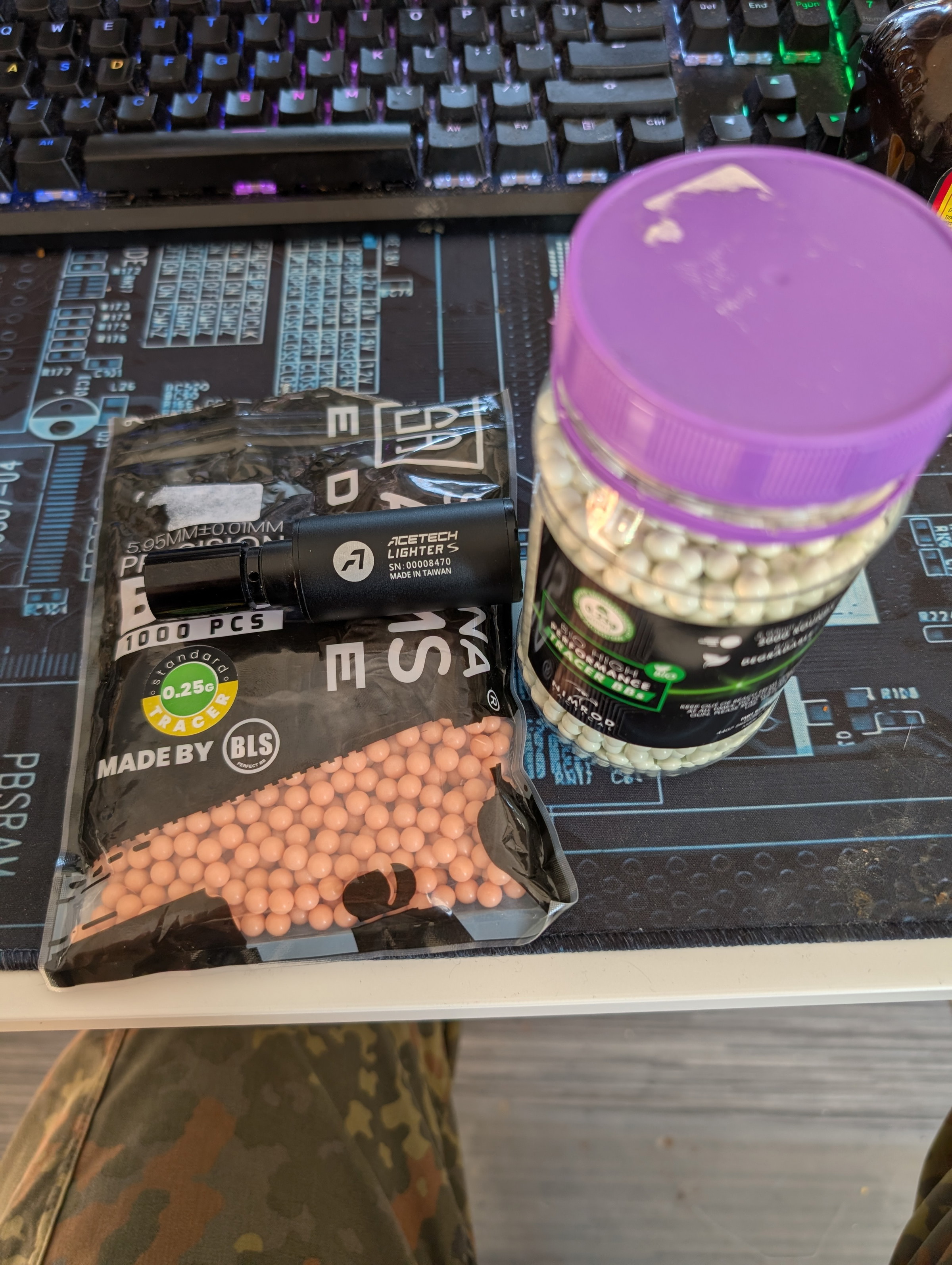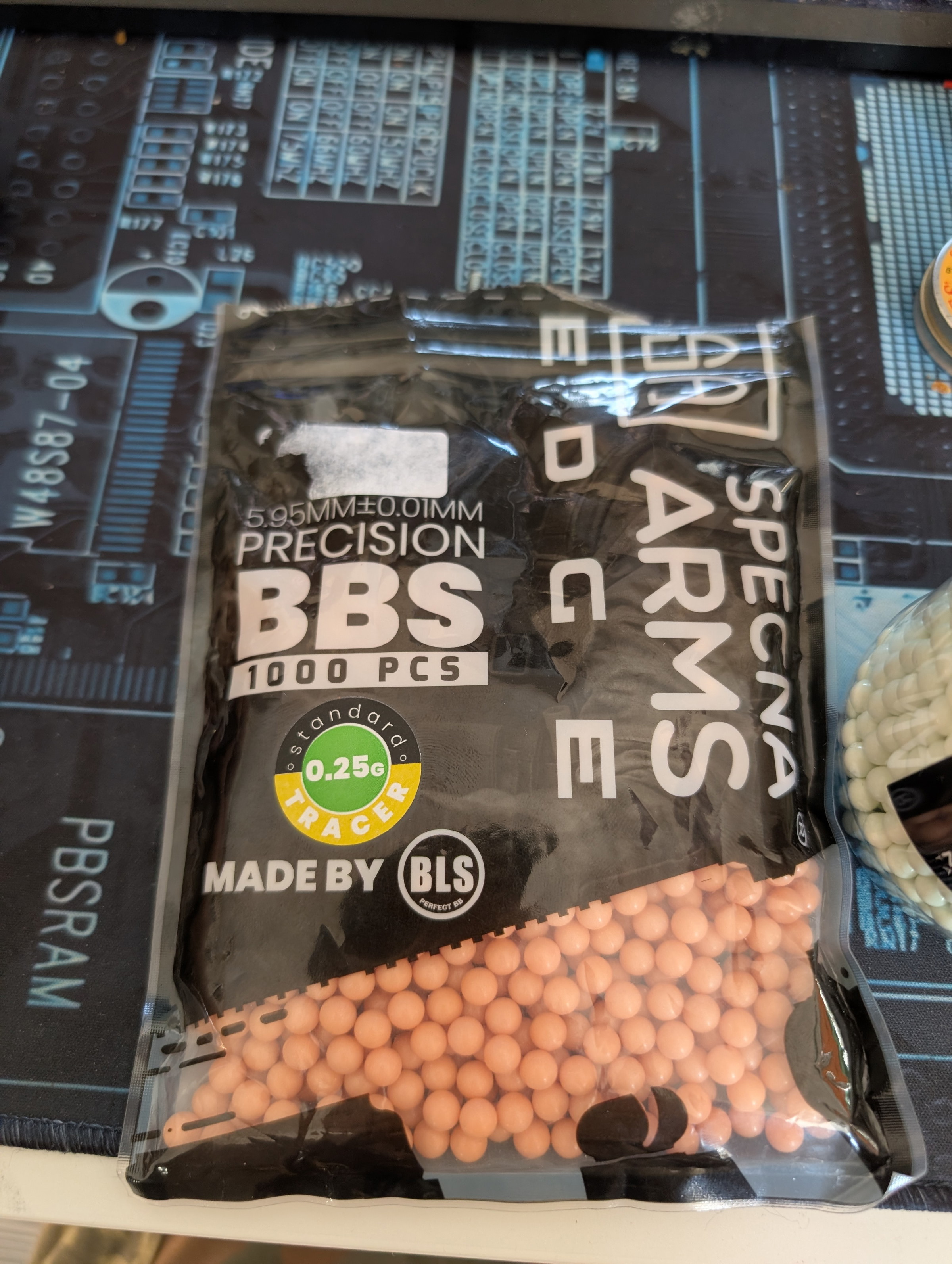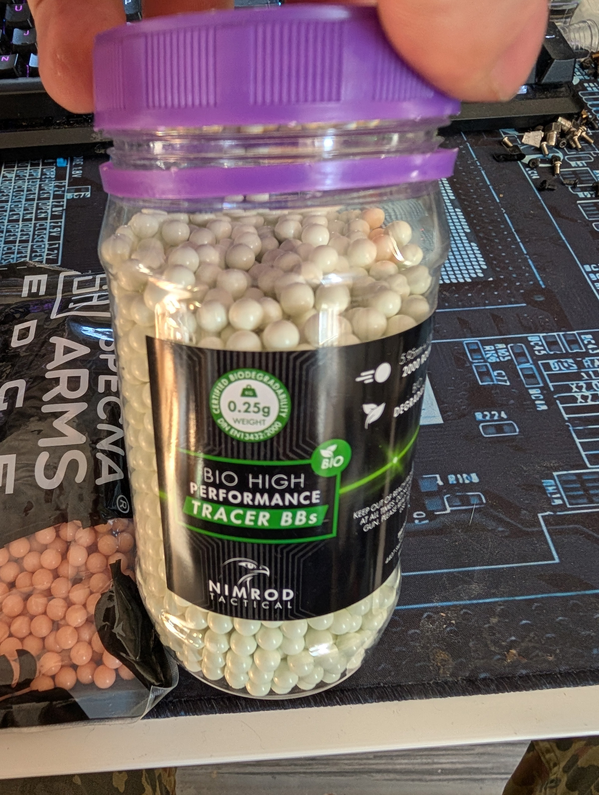 Wordt als bundel geleverd met een pot groene BBs 2000 rounds (zijn er ca 40 van gebruikt) en een zakje rode BBs 1000 rounds (zijn er ca 5 van gebruikt)