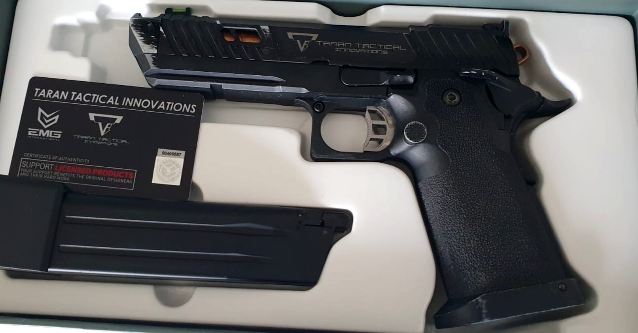 • Deze replica is een officiële samenwerking tussen EMG en Taran Tactical Innovations, bekend van hun custom race pistolen. Het ontwerp komt rechtstreeks uit John Wick 4, compleet met de kenmerkende 120mm lange outer barrel en compensator. Het Hi-Capa platform betekent dat je toegang hebt tot een enorm aftermarket aan upgrade-onderdelen.