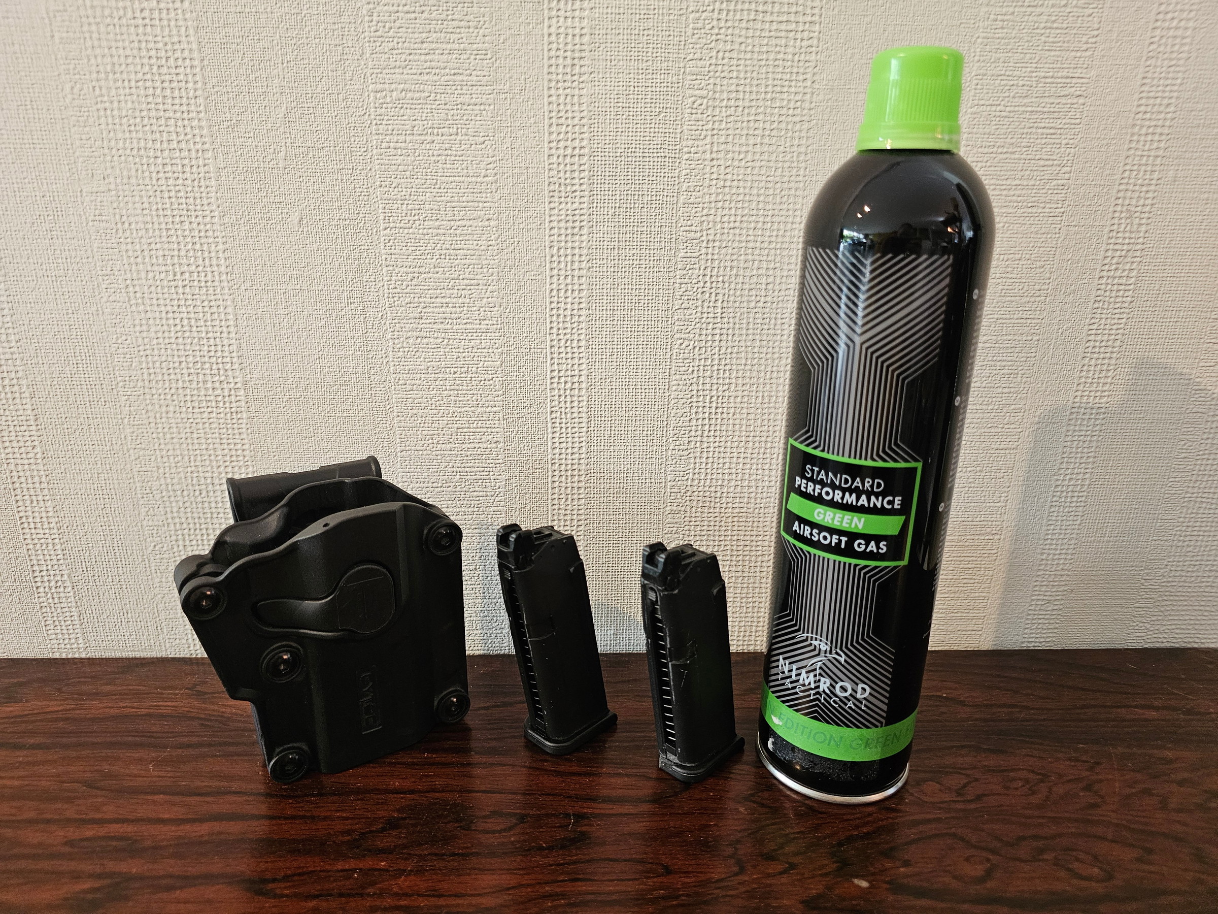 Licht gebruikte Umarex Glock 19 Gen.4 met holster, 2 mags en volle fles green gas.