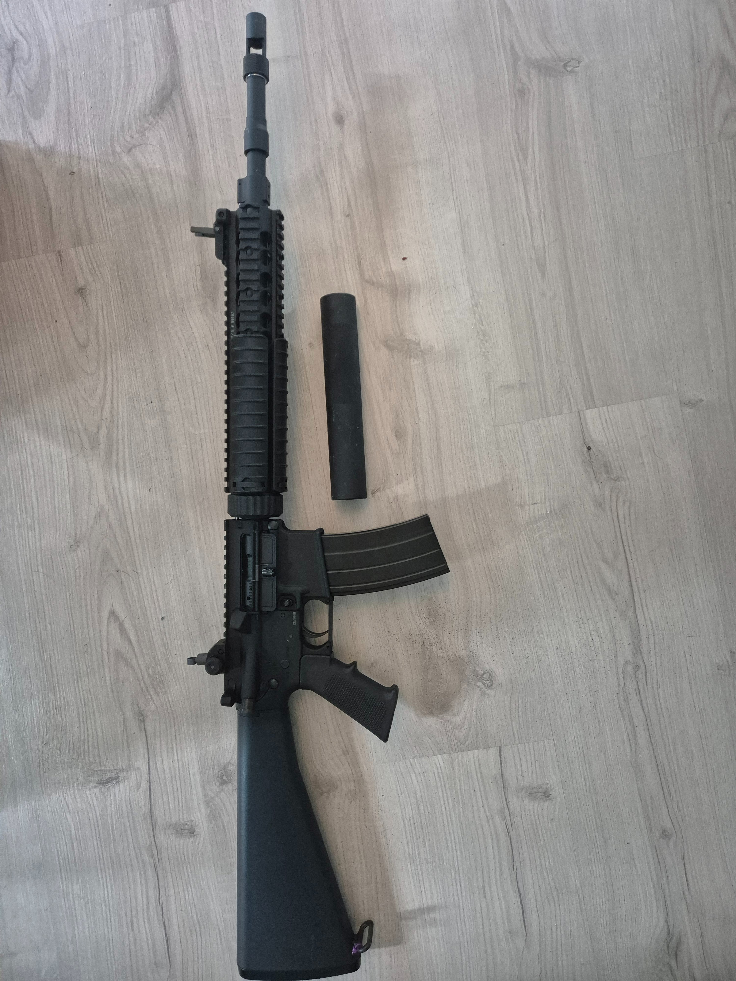 Gave gbb. Heeft full auto en semi auto selector. Heeft een NPAS standaard ingebouwd zodat je de fps af kan stellen op het weer. Onder de 10 graden zijn de prestaties wel een stuk minder, hij verbruikt dan veel gas. Komt met alle accessoires op de foto. Ik heb een bewerkte selector switch erbij waarmee hij alleen semi automatisch schiet en dus als DMR door kan.