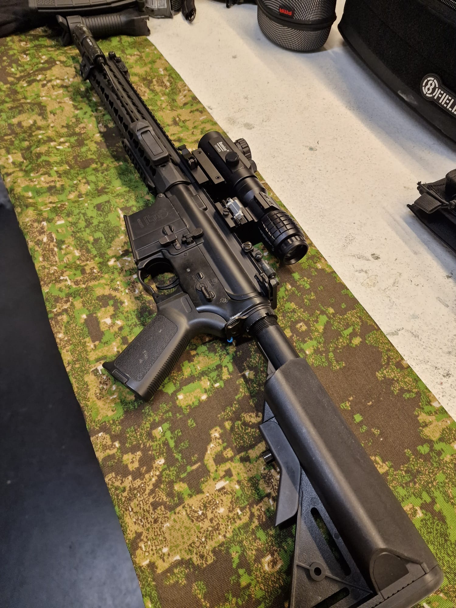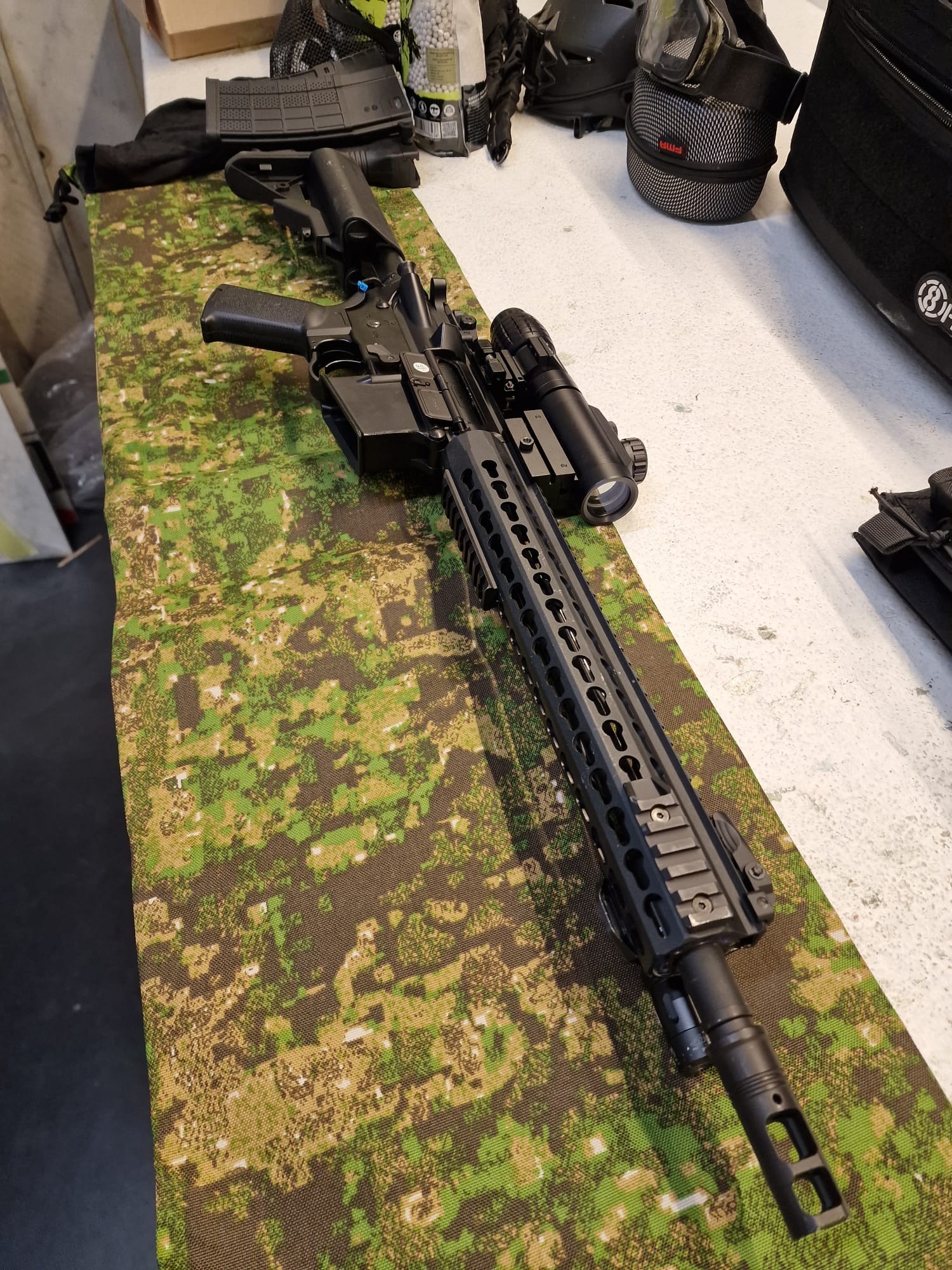 Is ook voorzien van red dot met scoop en lamp extra magazijnen