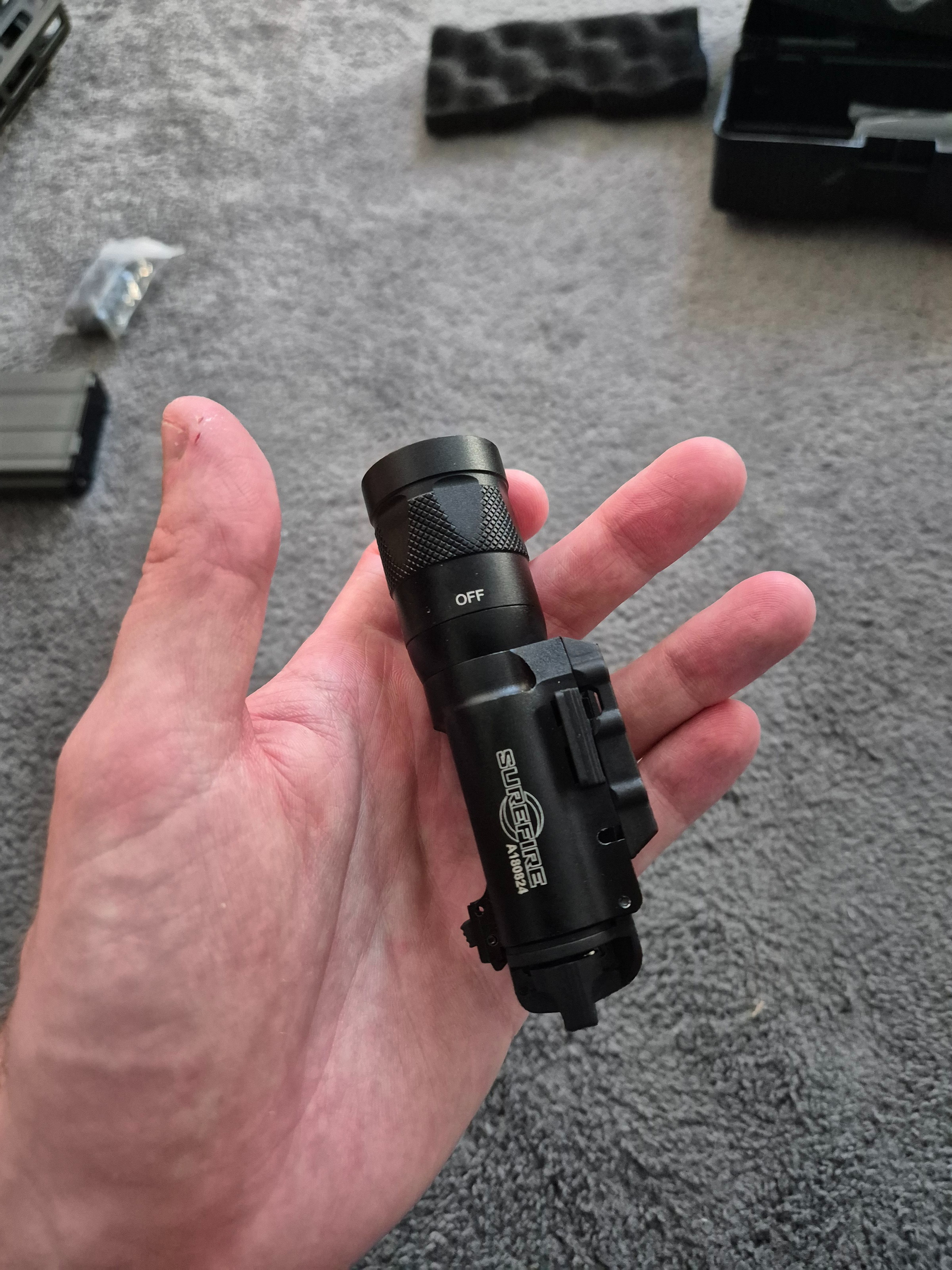 Surefire X300 Vampire flashlight reproductie. In nieuwstaat, zonder beschadigingen en voorzien van alle correcte logos. Heeft een strobe en normale stand. Werkt op 2 x CR123A batterijen.