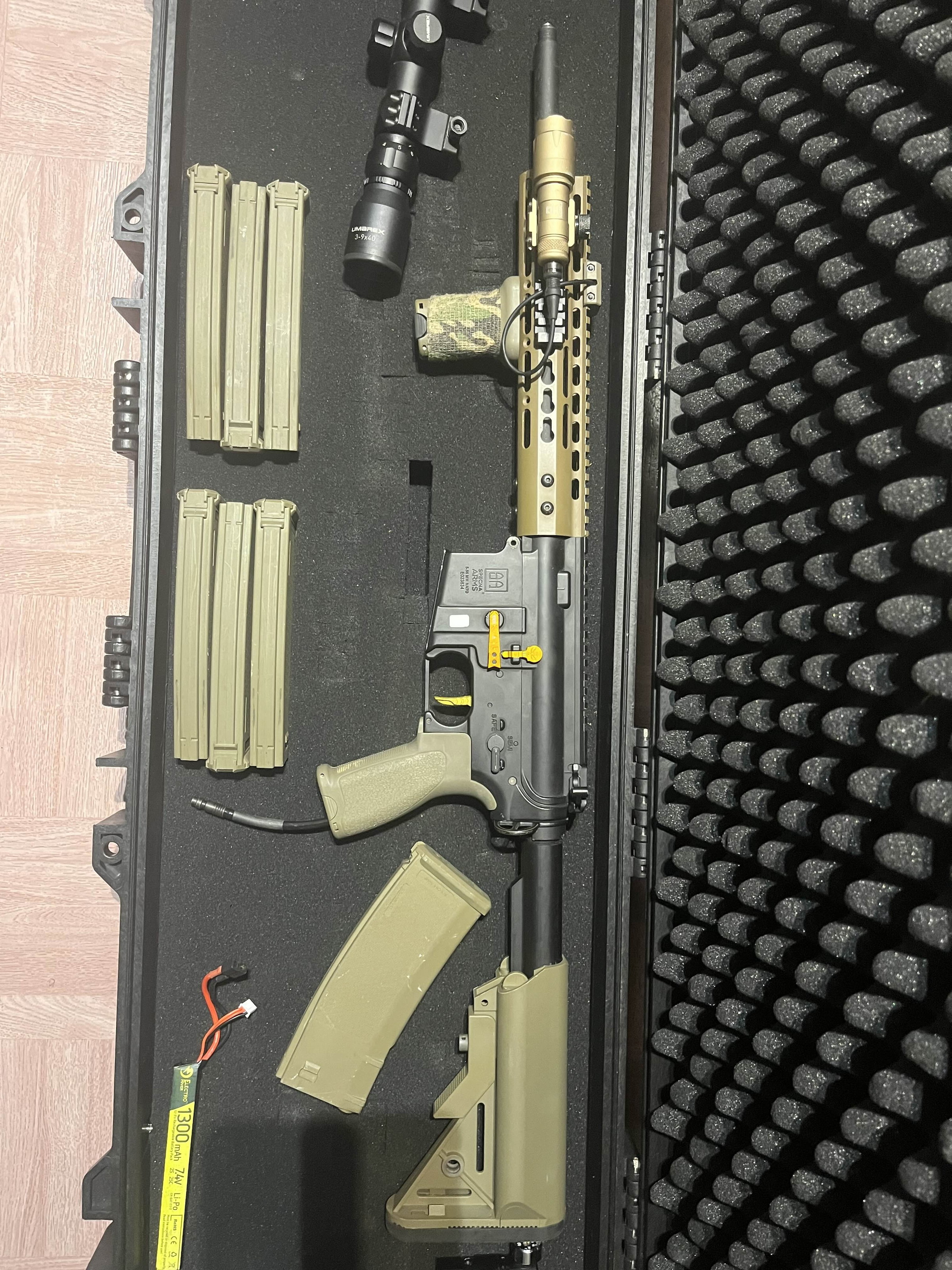 M249: Enkel de gun alleen al 450+ euro. Upgrades: innerbarrel, hopup, gears, brushless motor, elektrisch aangepast op 11.1v, nozzle, piston, piston head, cilinder en cilinder head, alles is geupgradde. Zit rond de 1250 euro in het wapen en schiet heerlijk. Komt met tas.