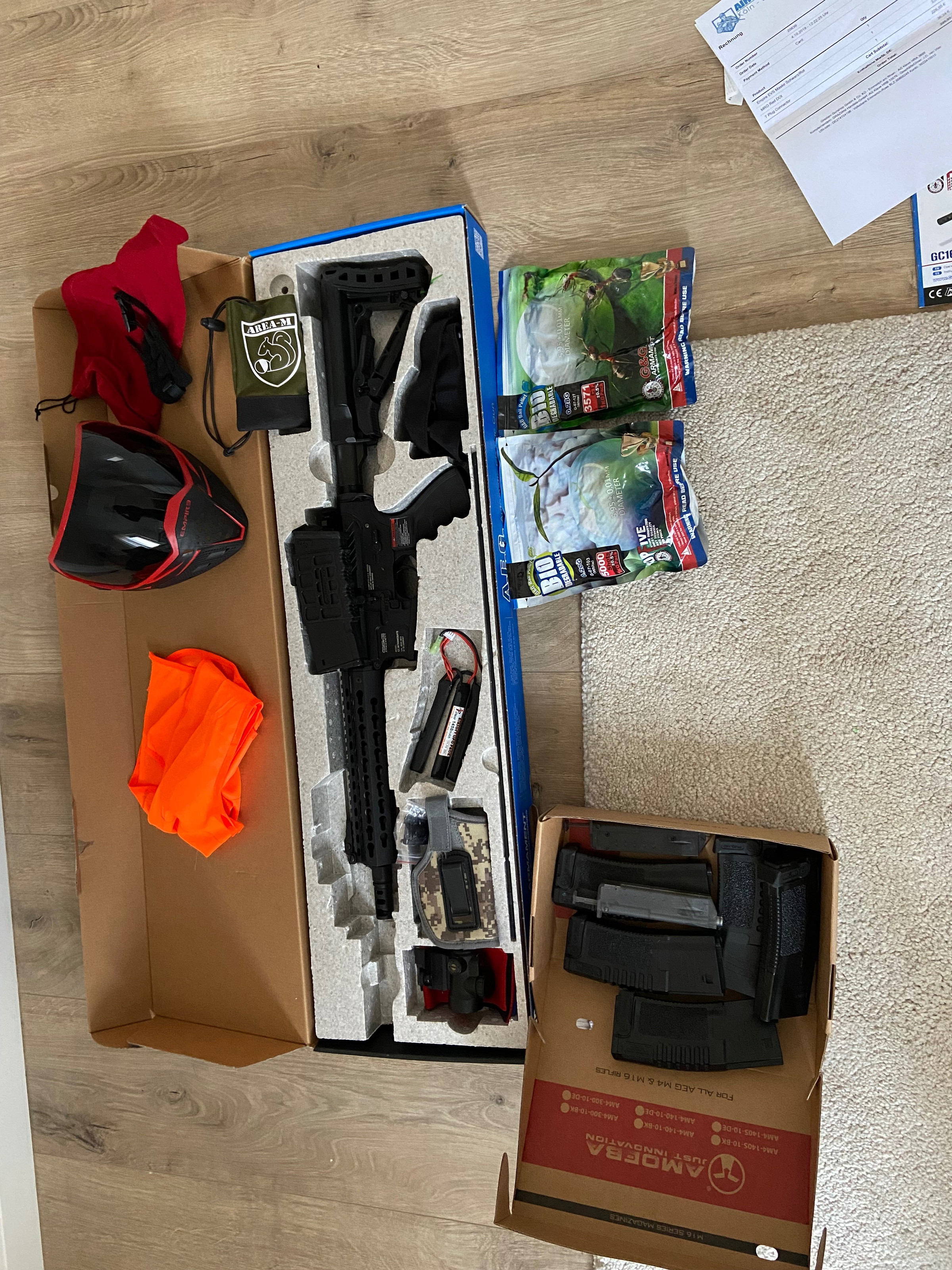 G&G GC16 E.T.U. SRL S-AEG, Empire EVS Maske, MRO Red DOt (Visier), T Plug Connector, mehrere Magazine Ares Amoeba Sportline M4 Midcap 140rds, 2x 11,1v 1450mAh LiPo Akku Stick Type ALP1450R4A-3S Mini-Tamiya, Nuprol Speedloader 110BBs, 2x Monition Kügelchen ungeöffnet, OVP