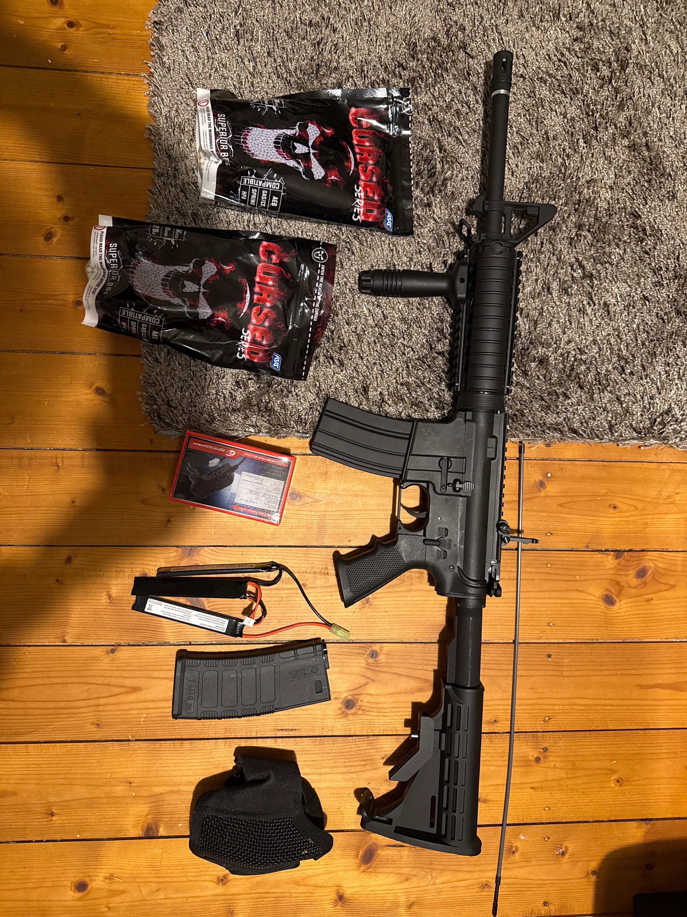 Dazu gibt es noch knapp über 7 tausend Schuss. Einen Akku plus Ladegerät und einen Mundschutz. Ein großes Zusatz Magazin und einen Reinigungsstab.