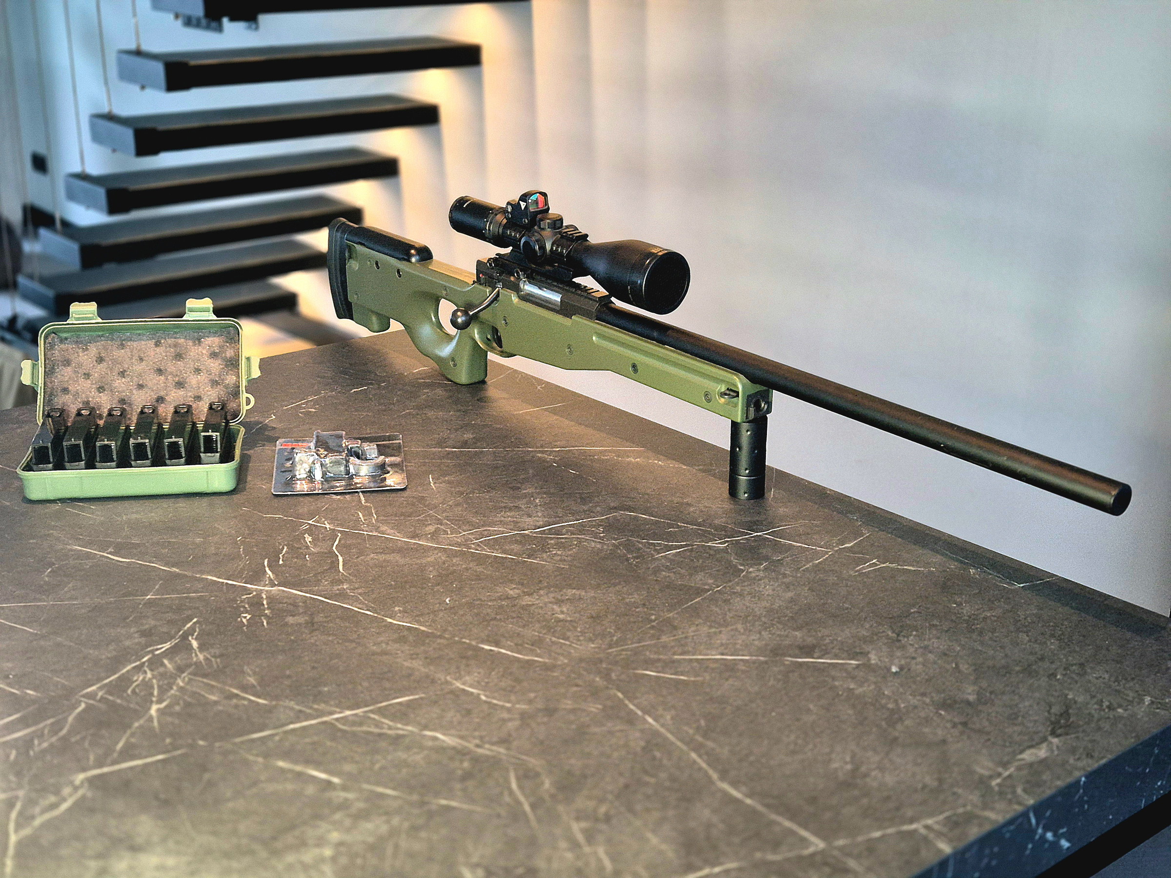 Zeer nette Sniper rifle. Alles werkt naar behoren en deze replica heeft het veld nog niet gezien. Hij is voorzien van een geupgrade gearbox (t.w.v. 79 euro). De Sniper komt met: