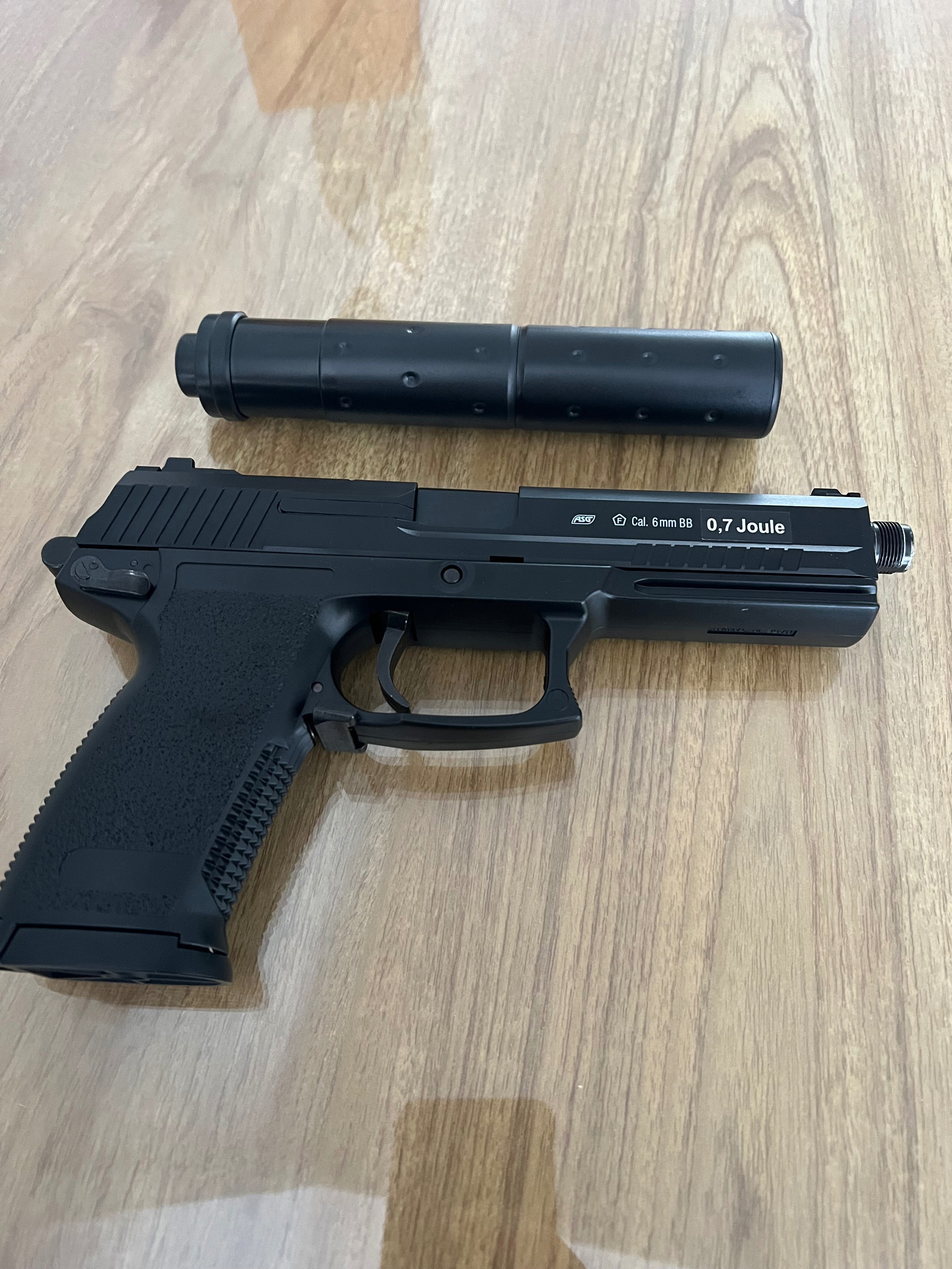 Te koop aangeboden een mooi pistol met silincer. Werkt op gas.