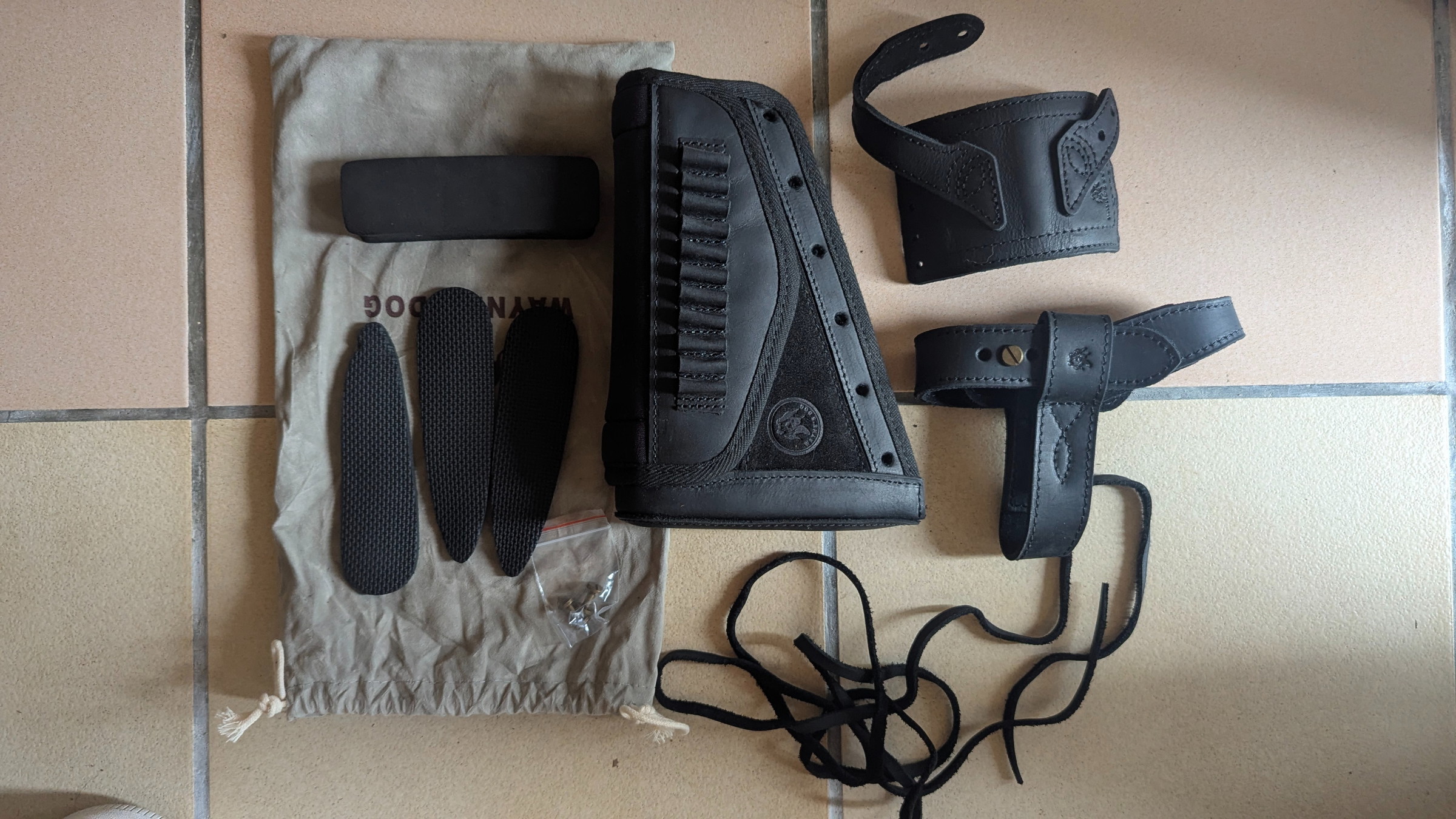 Bonjour je vends tout ce qui se trouve sur la photo, couvre fût de fusil en cuir noir avec attache sangle, couvre crosse avec porte cartouche pour 22 lr.