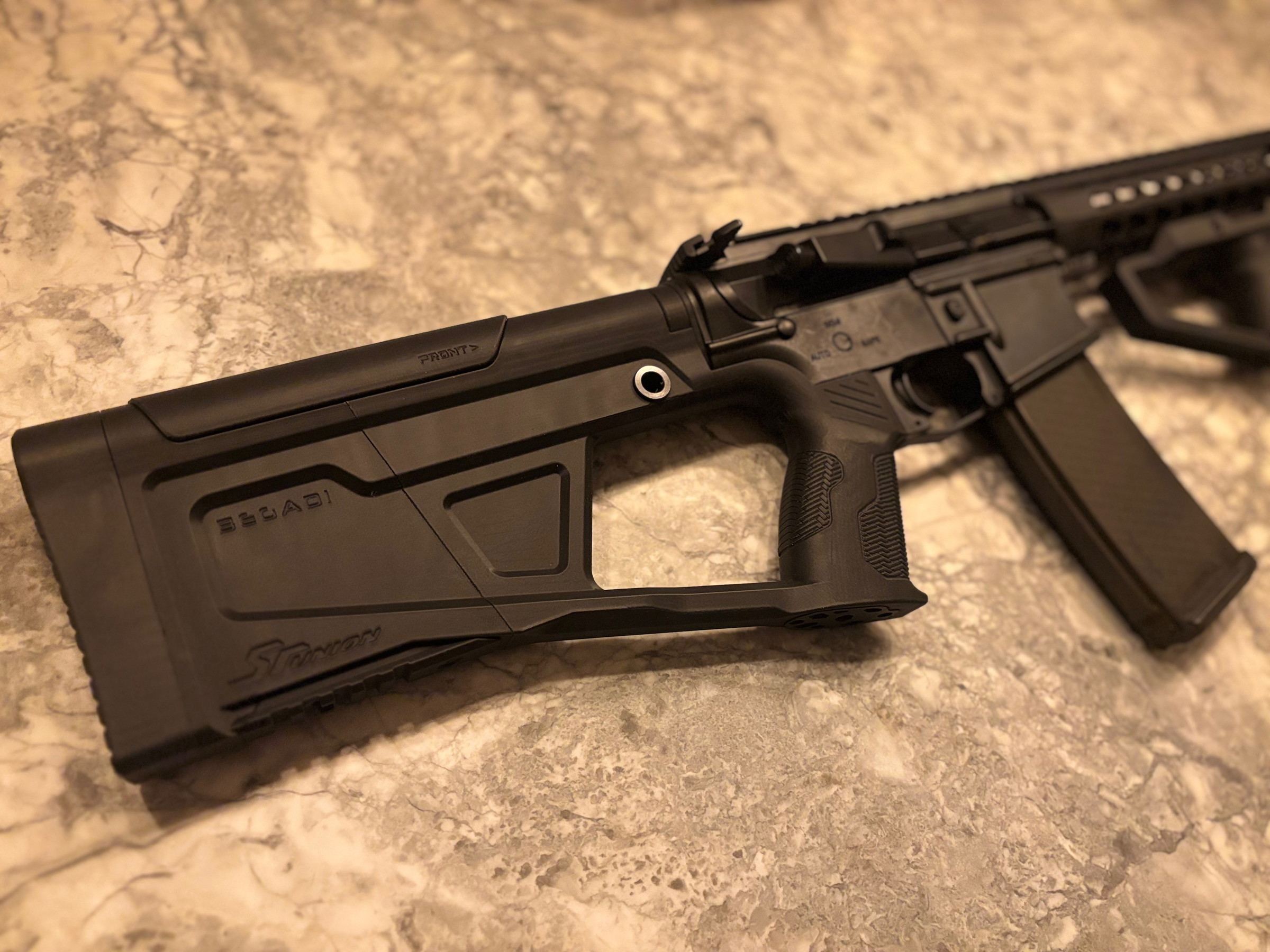 Hierbij is de complete stock, inclusief buffertube vervangen en voorzien van een SRU frontgrip.