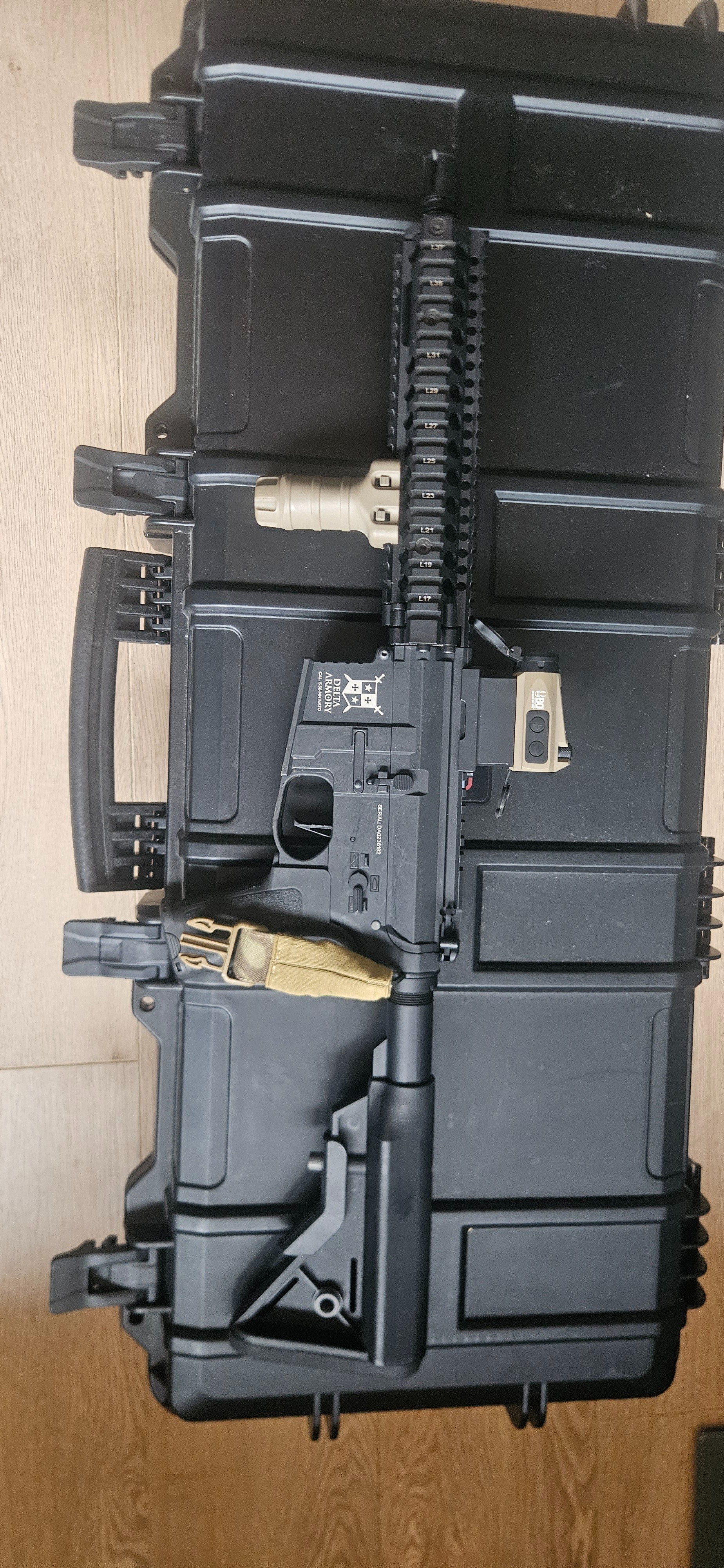 Delta armory rifle Strak en goed onderhouden in zwarte uitvoering met tan accenten. Voorzien van rail systeem, verticale grip en red dot sight.