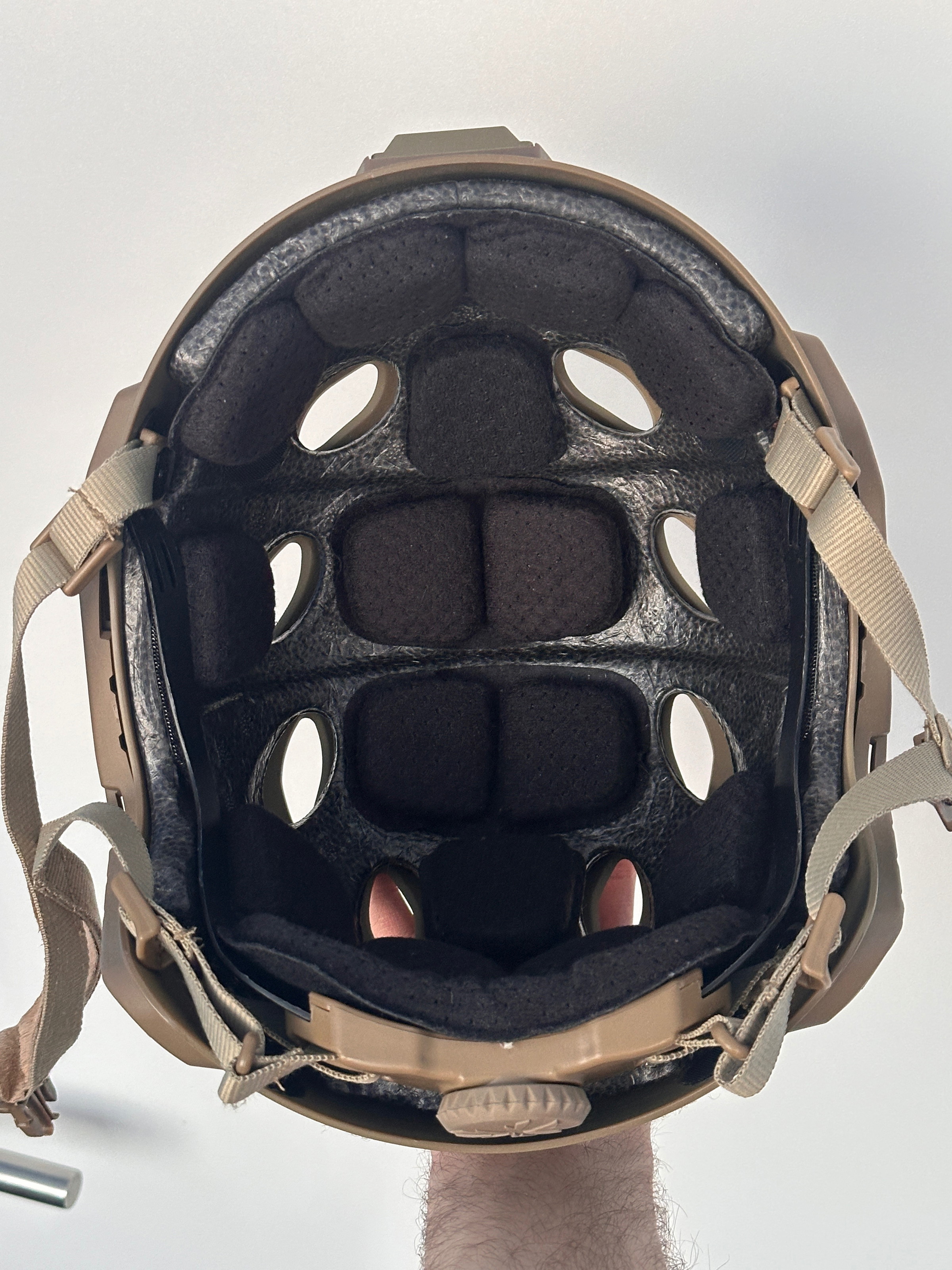 Te koop Emerson Gear Fast SF Helmet in kleur Tan, maat L/XL (rond 57-61cm). Voorzien van verhoogde zijrails, waardoor er meer ruimte is voor actieve gehoorbescherming.
