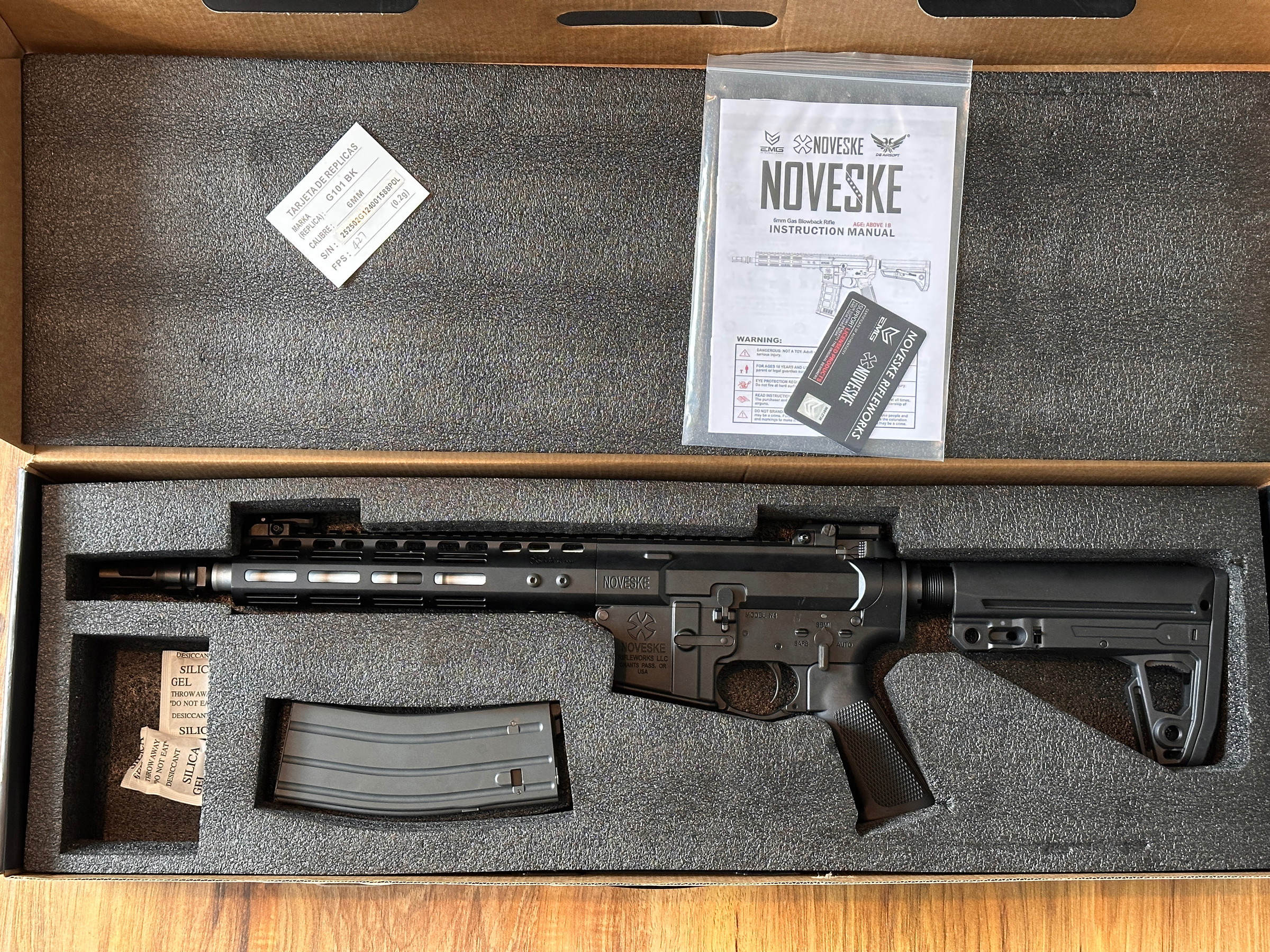 DE NOVESKE N4 MWS GEN3 GBBR, EMG licensed. No modifications. One small scratch on receiver from transportation (visible on picture), other than that almost like new. Comes with original stanag mag. Used on three games only.