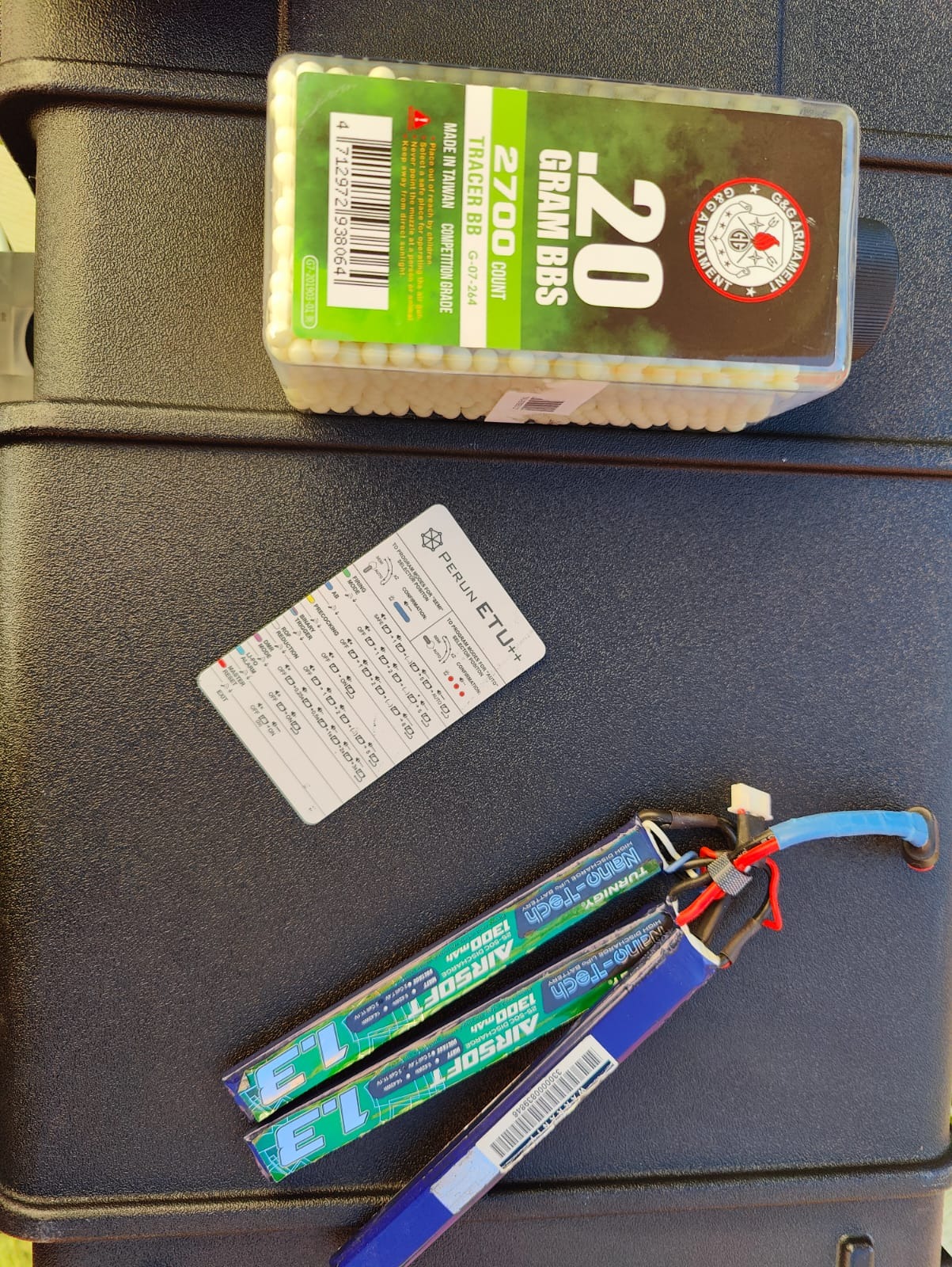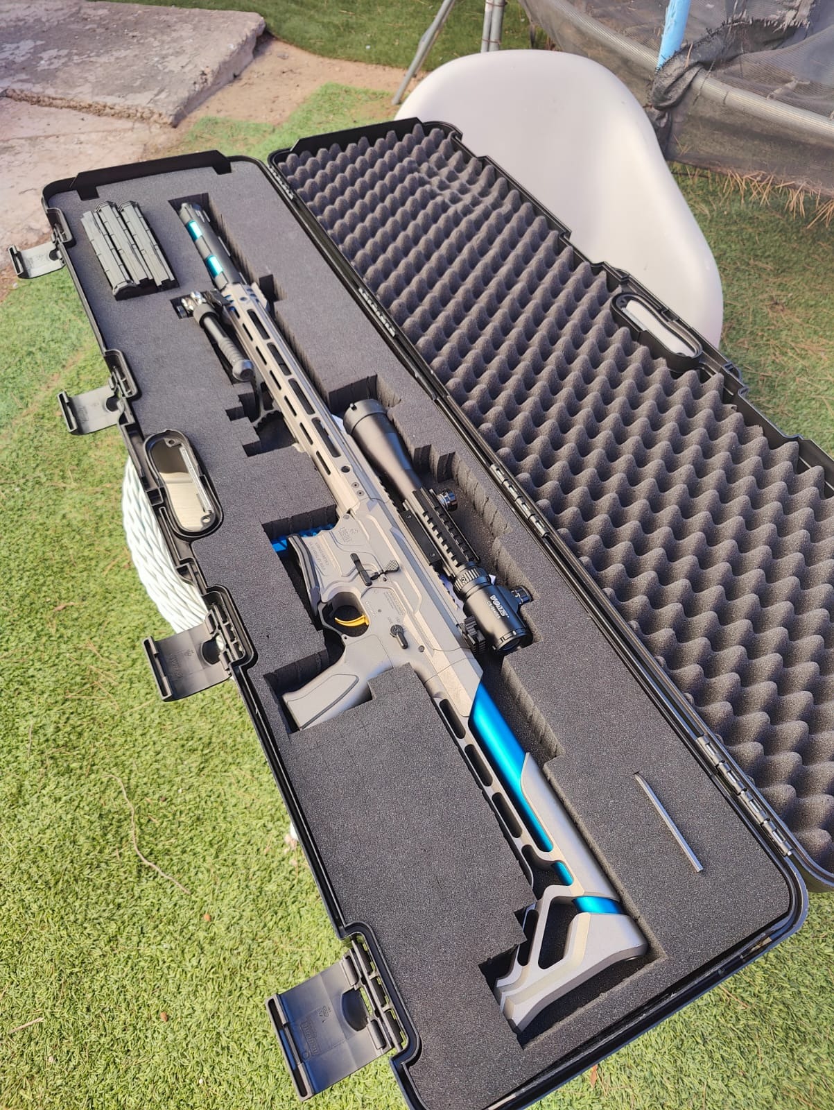 Guardamanos metálico, Cañón precisión Prometheus 407 mm 6,03, Goma Maple leaf Amarilla + nub omega, MOSFET perun ETU ++ (es una maravilla), muelle M140, trípode, 3x cargadores BAMF extracción por finalización de carga, silenciador G&G aluminio, maletín rígido con acolchado a medida EVOLUTION, mira telescópica retroiluminada VOMZ 9x40 con protección y bateria Turnigy 1.300 mAh de descarga rápida.