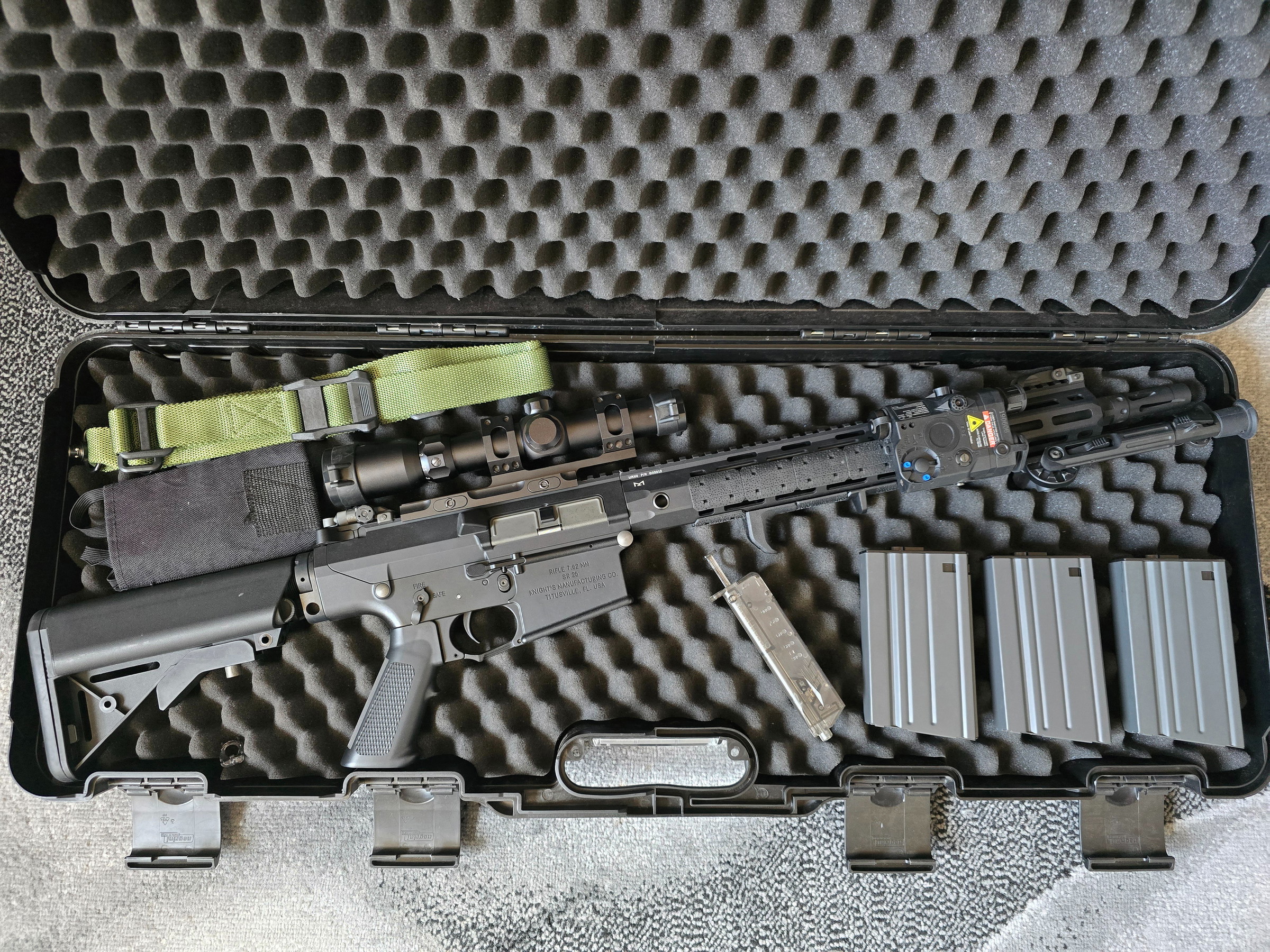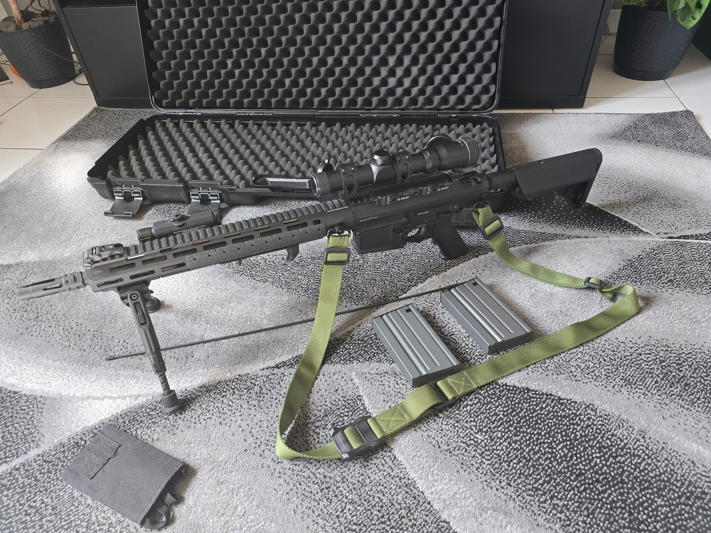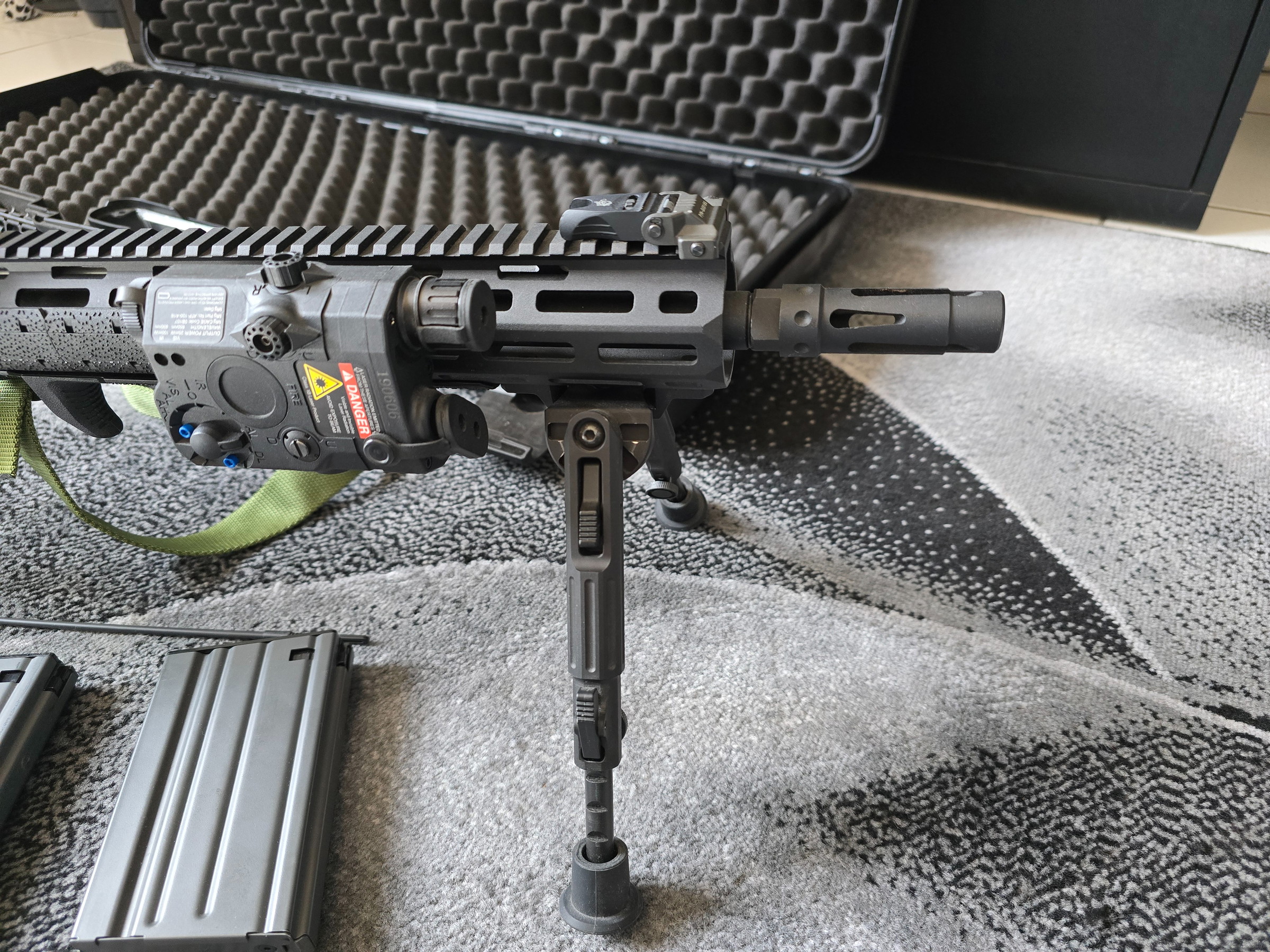 Das Gewehr ist in einem sehr gutem Zustand. Es ist auch ein Macaron 60 Grad Hop Up verbaut und sorgt im Zusammenspiel mit dem langen lauf für eine super Präzision. Es ist ein 1-4x24 Scope montiert, ein verstellbares Zweibein, Tragegurt und ein Laser (Deko). Alles per M-Lok, also auch einfach zu demontieren und individuell anzupassen. Außerdem gehören 3 Magazine (Stahl) mit je ca. 90 Schuss Kapazität, 1 Speedloader und der Koffer mit zum Set.