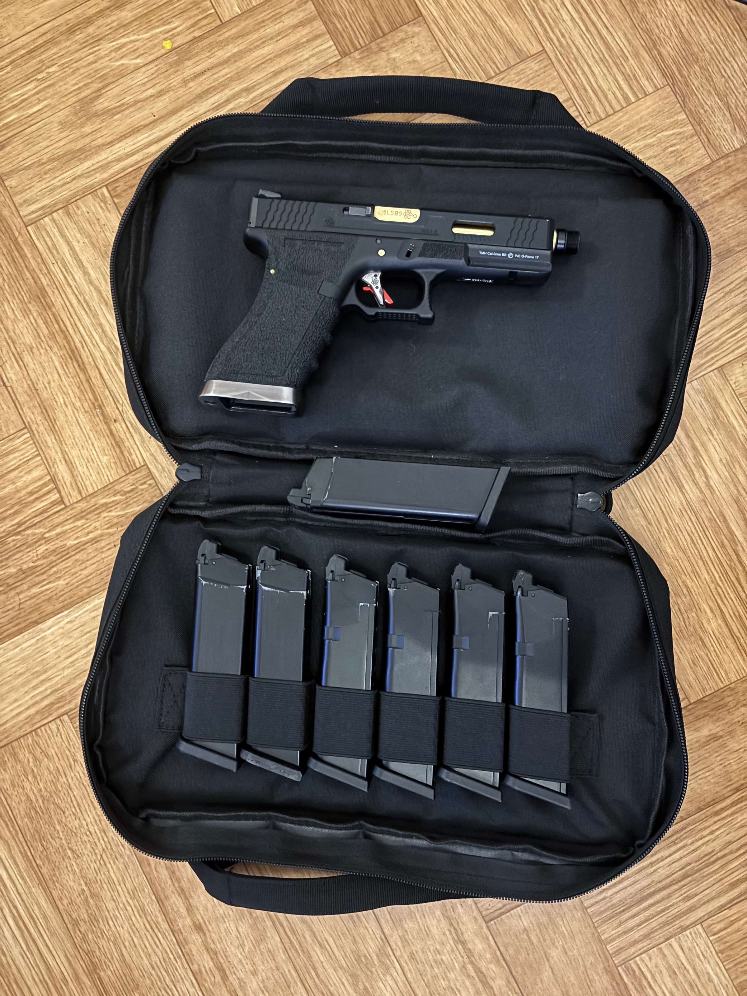 WE-tech Glock 17. Incl draagtas, 7 magazijnen en riem met linkshandige holster. Sommige mags moeten wel es nagekeken worden.