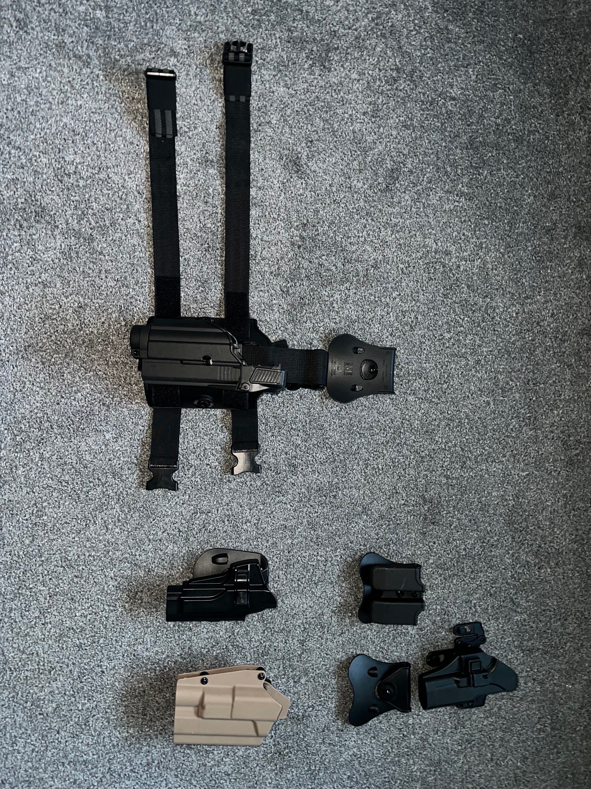 In deze advertentie bied ik meerdere holsters aan geschikt voor Glock 17/19. Een IMI Defense holster op Amorax been plaat, Glock holster op MOLLE adapter en een “Safariland” stijl holster. Ook een los Beretta M9 holster.