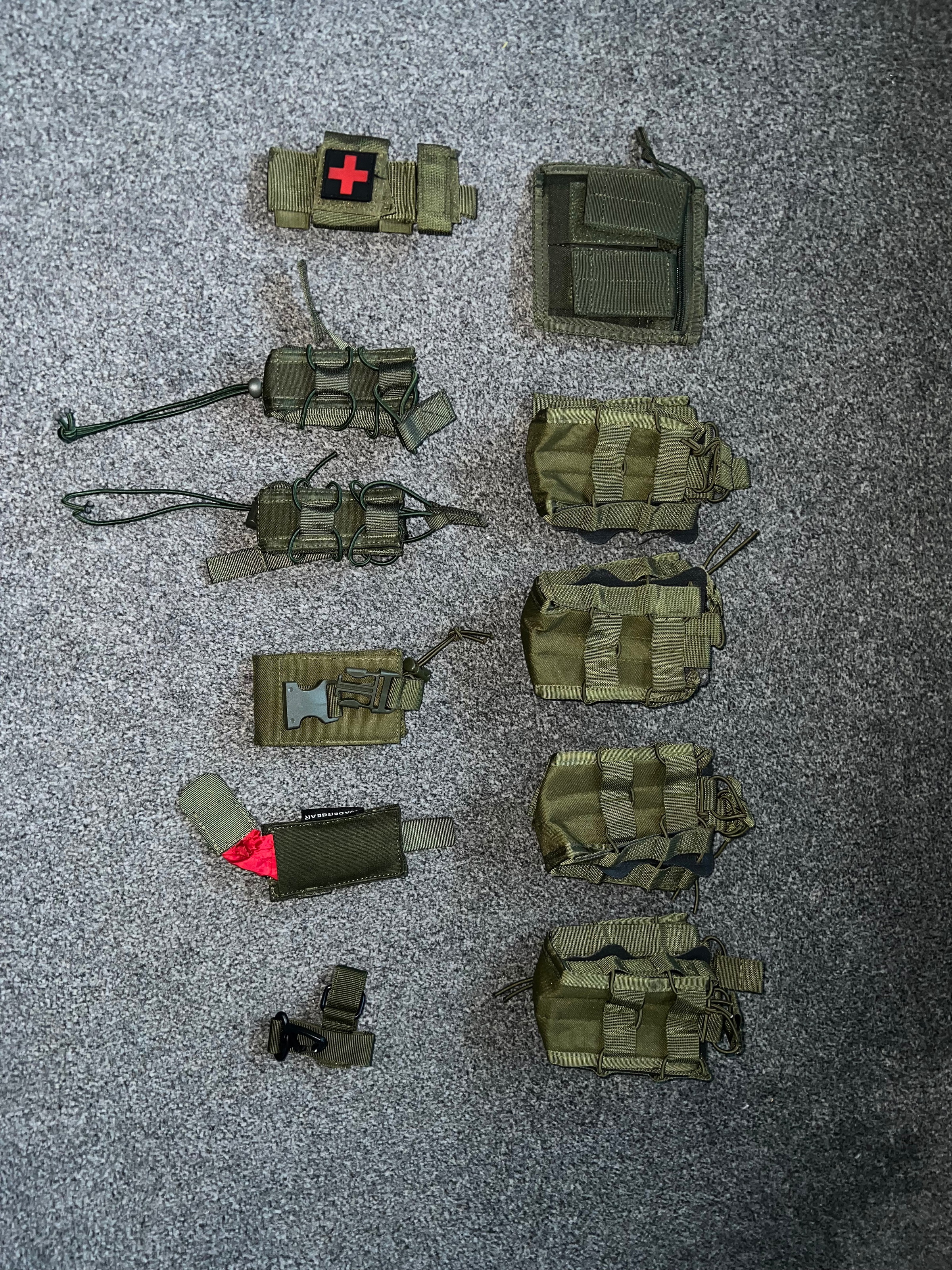 Op de volgende foto zijn een heel tal Ranger & OD Green pouches zichtbaar bestaande uit magazijn tassen, deadrag en TQ houder.