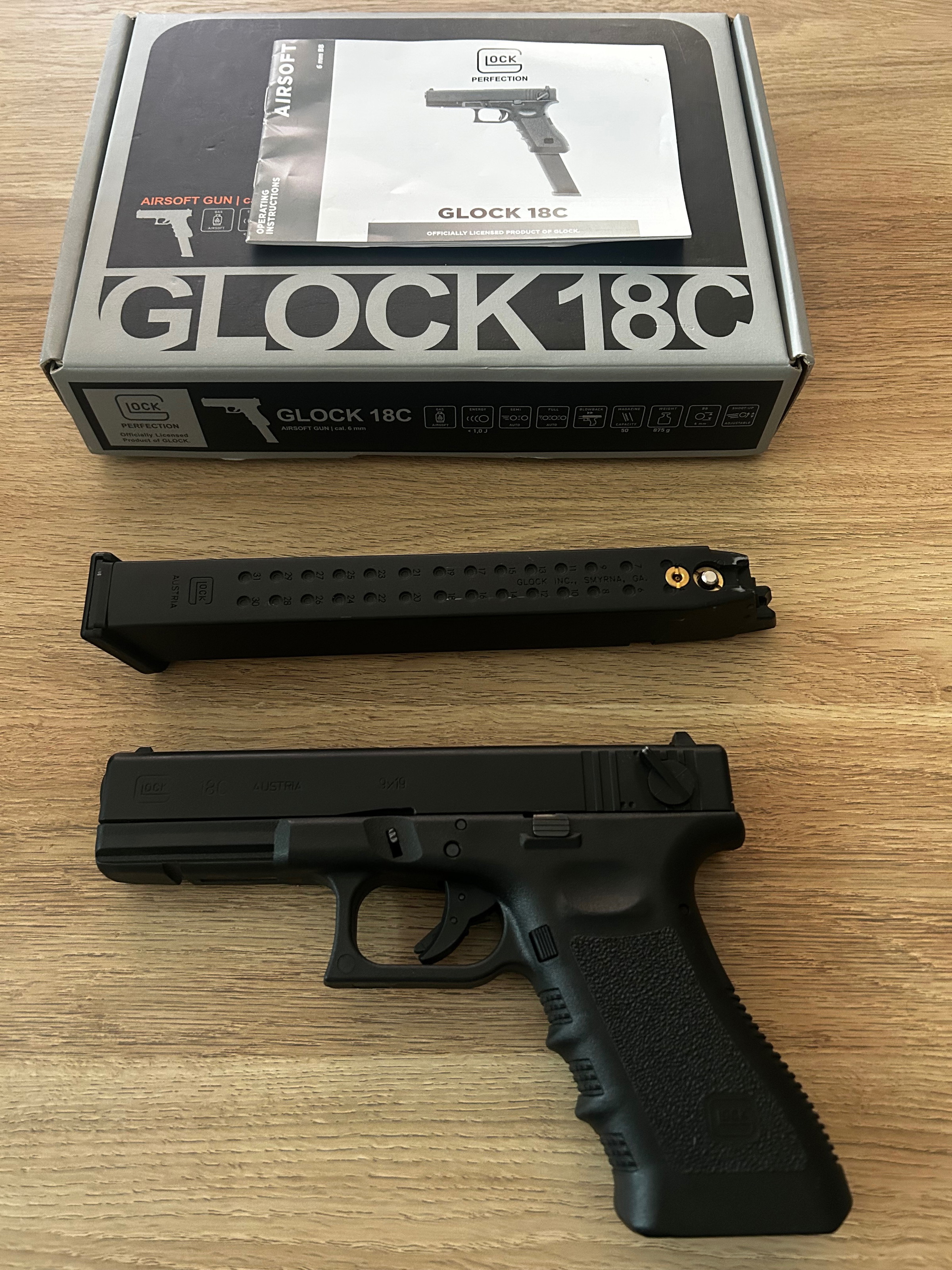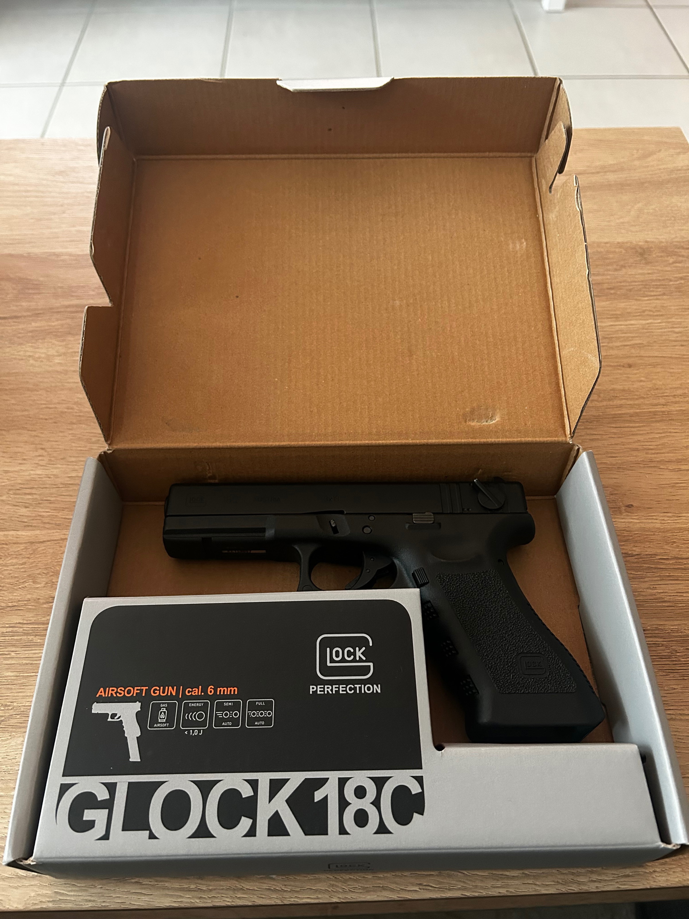 Je vends une réplique airsoft Glock 18C de marque Umarex, produit officiellement licencié Glock.