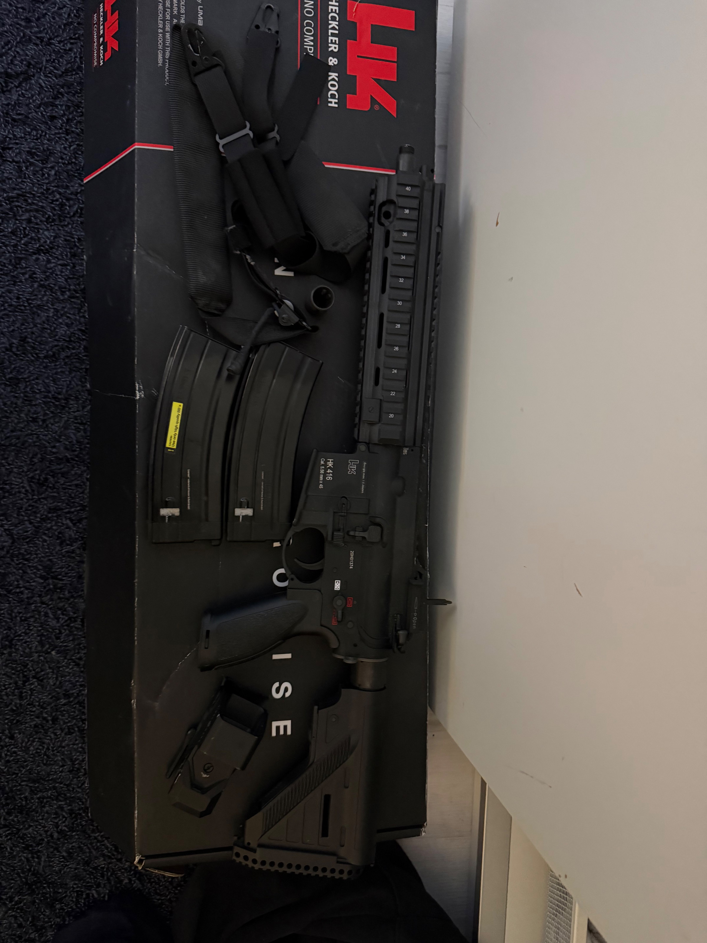 Verkaufe meine Heckler und Koch HK416 A5 GBB Softair Gewehr. Sie wurde auf Sniper Airsoft Supply gekauft und ist wie Neu. Sie wurde nur für einige Male im Garten benutzt zwecks Test. Mitgelifert wird natürlich die HK416 Plus OVP, 2 Magazine(1 Davon verliert etwas Gas) ein Waffengurt, Plus ein 883 QD Holo Sight, Schwarz. Ich würde gerne alles zusammen verlaufen wollen. Macht mir Preisvorschläge. Gerne Abholung möglich. Versand auch möglich. Preis ist VB