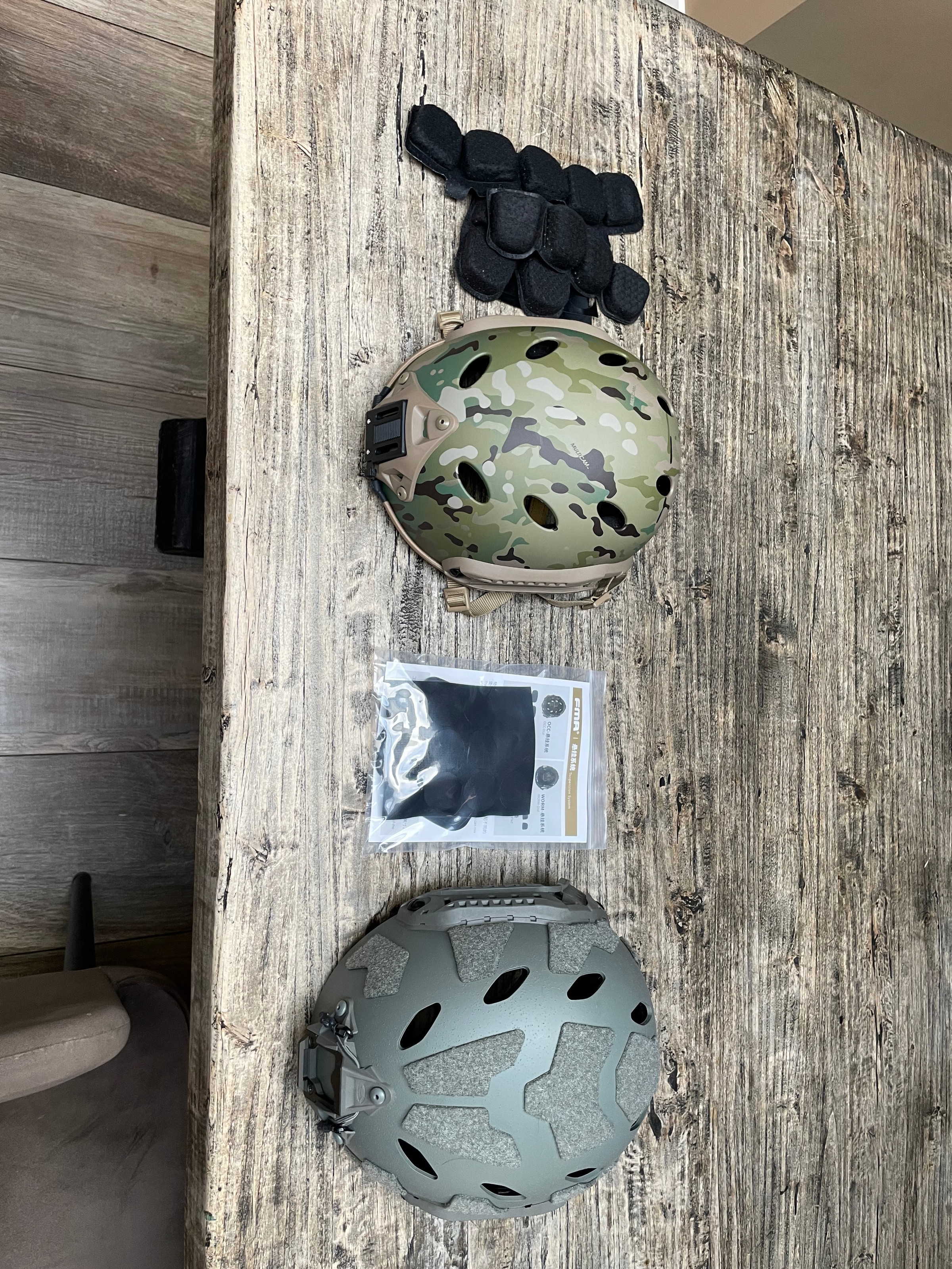 Multicam helm, maat M/L, gekocht bij Novritsch, 3 keer mee gespeeld, komt met zachte pads. 25 euro.