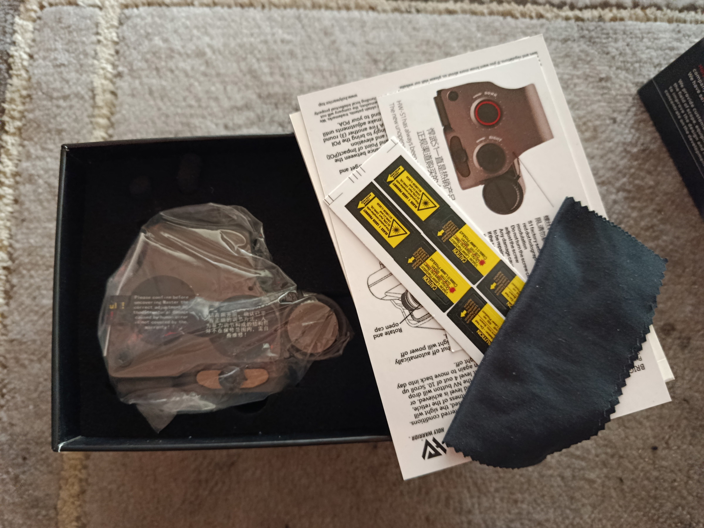 Mit dabei sind alle möglichen Zubehör teile wie Bedienungsanleitungen, Tuch und Laser-Hinweis-Aufkleber.