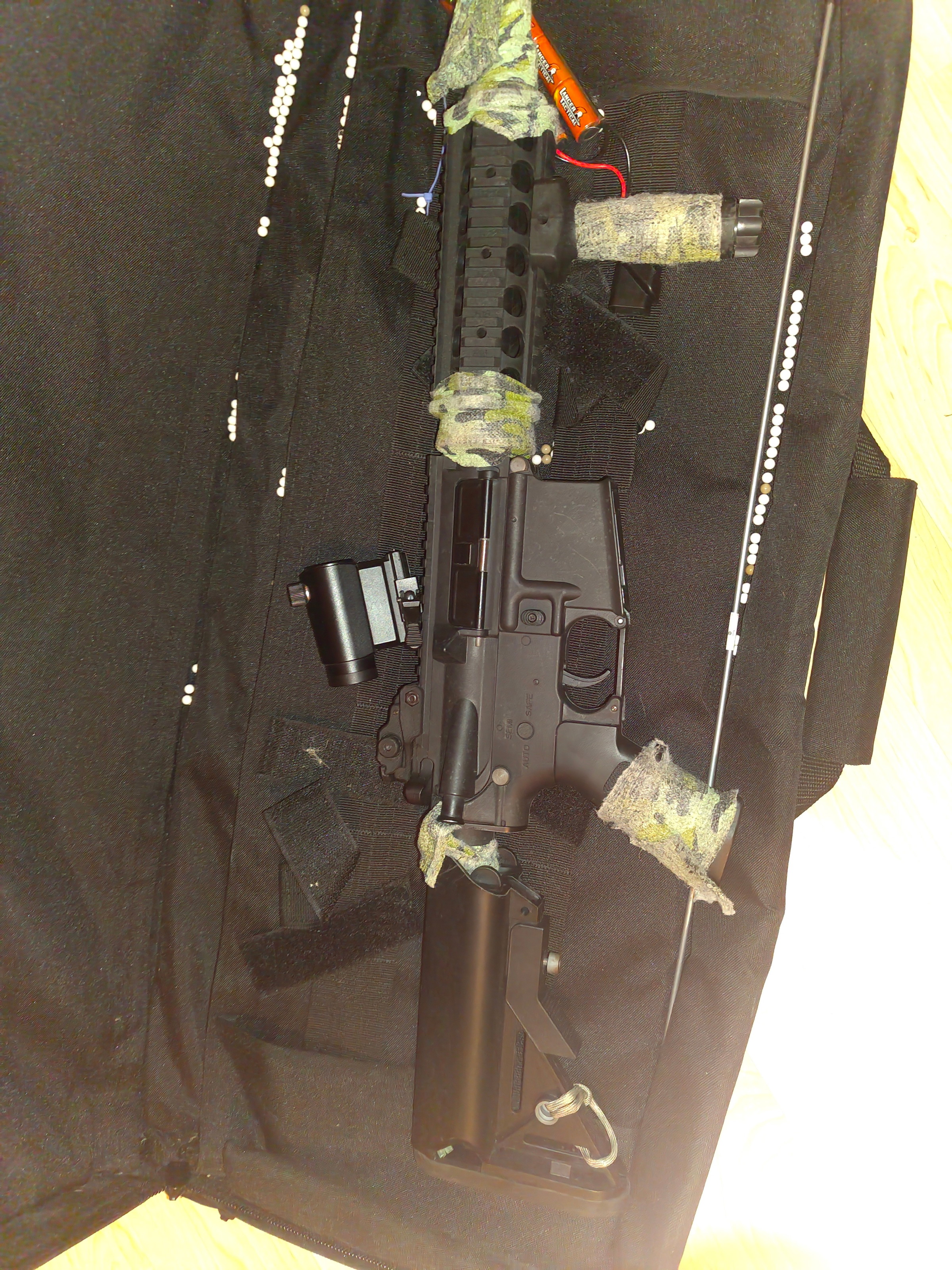 Selling a M4 from Lancer Tactical. A bit used but still works perfectly. Sold with red dot and grip and battery and without camo tape if demanded.