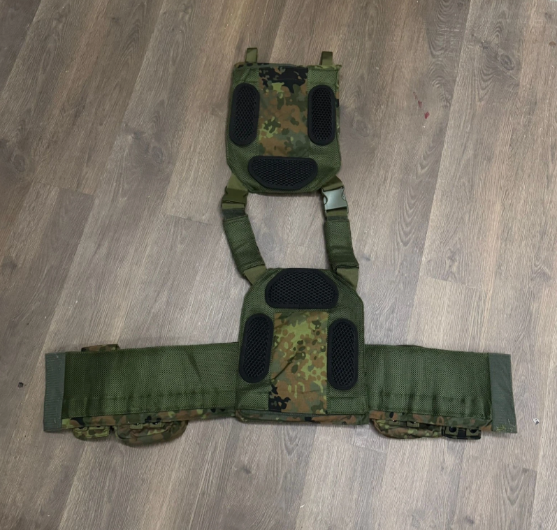 Plattenträger in Flecktarn inkl. Belüftungspolster, Sapi aufnahmen, Kummerbund mit Ballistik aufnahmen für zusätzlichen seitlichen Schutz und folgenden Molle Taschen :