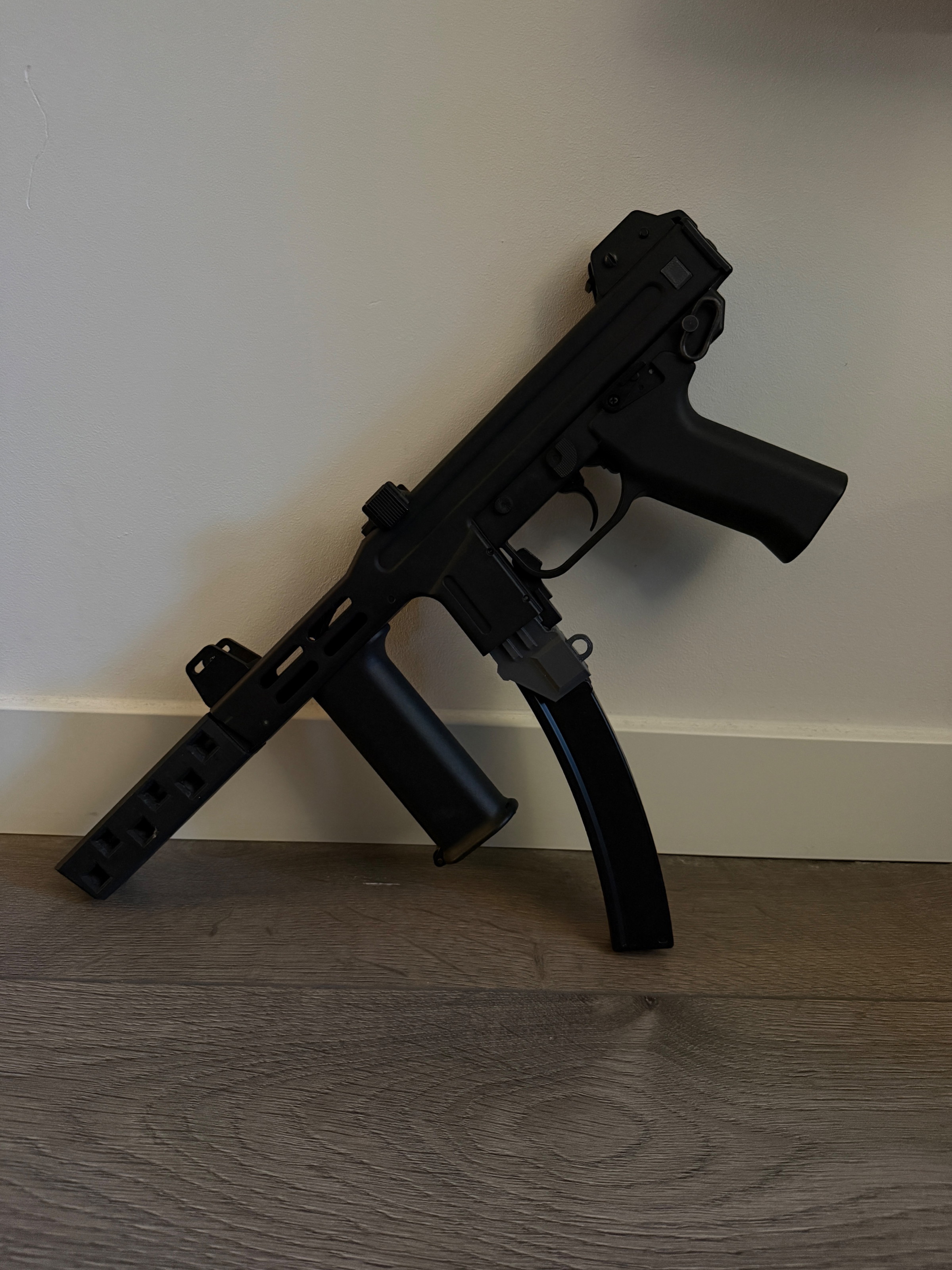 Qua uiterlijk zit er een andere “flash hider” op. De originele flash hider zit er bij waar een supressor op gezet kan worden. Ook is er een stock aanwezig, en 4 mp5 magazijnen die omgebouwd zijn naar de m4 spectre magazijn. Alle originele delen zitten erbij om de loop en bucking na. De originele accu en lader zitten er ook bij.