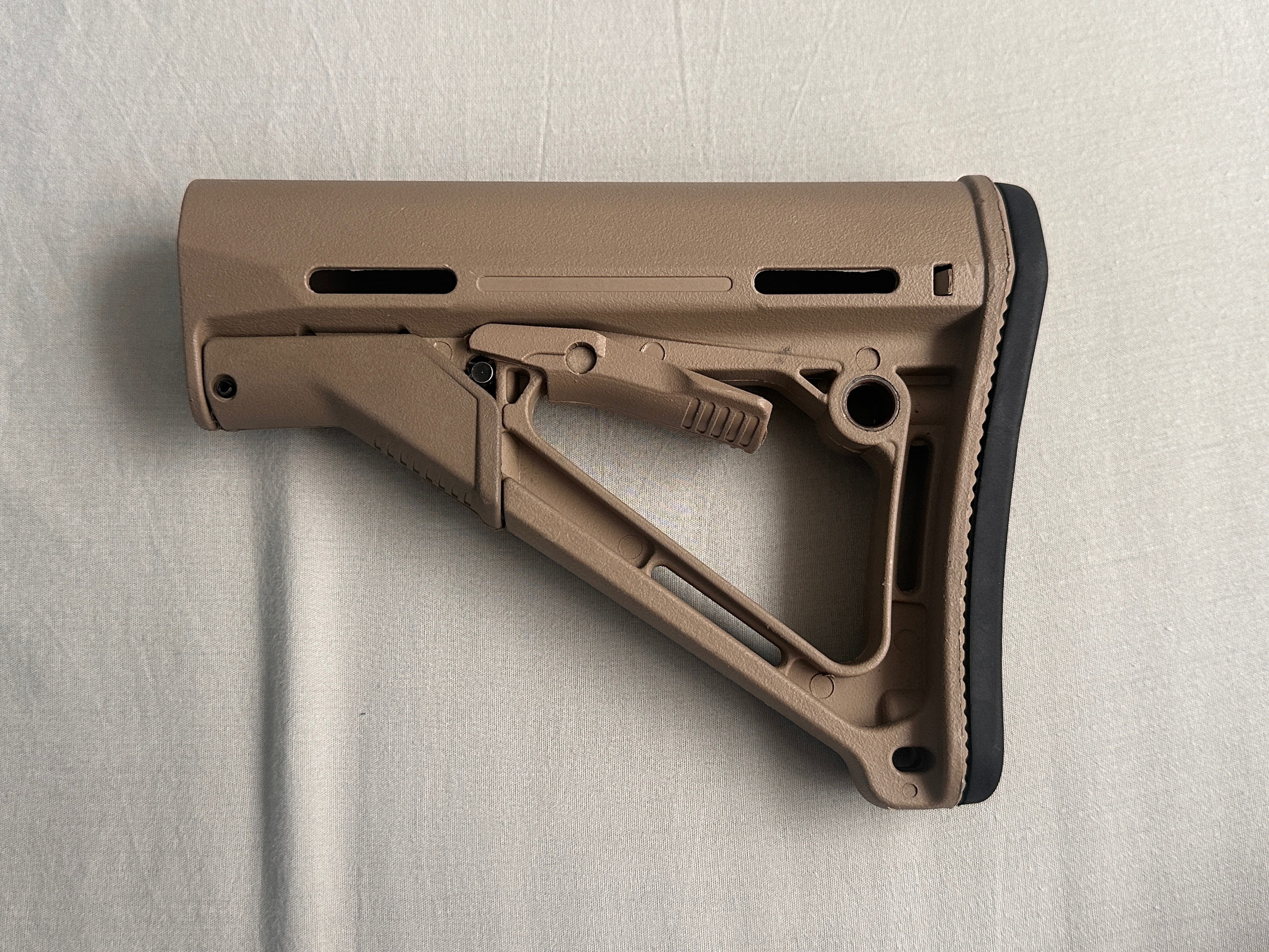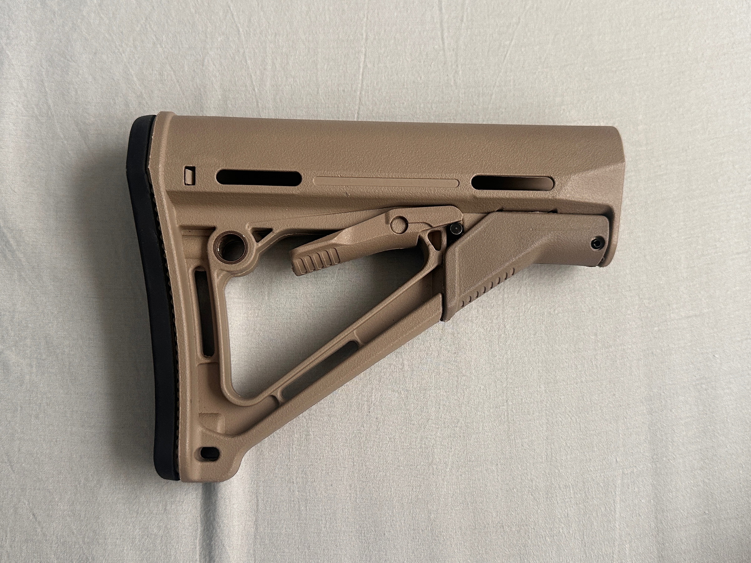 Te koop: Een replica van een bekende Magpul CTR stock in tan kleur.