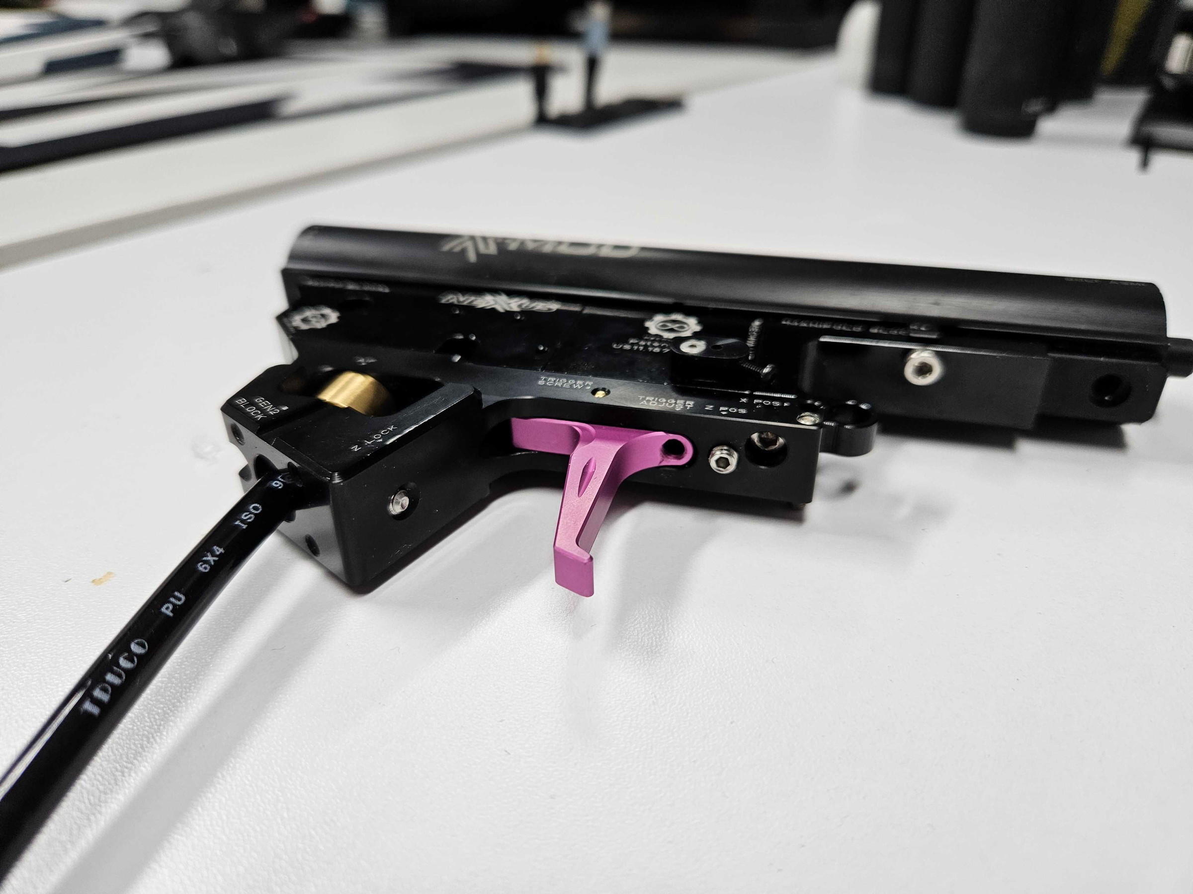On demand, the trigger it comes with can be standard black curved, pink flat or black flat. Extra 20 Eur for the flat triggers.